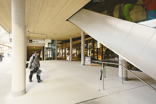 Dass die Seilbahnstation speziell auch nach Betriebsschluss nicht dunkel und tot im Herzen von Mayrhofen liegt, war überhaupt ein wesentlicher Aspekt für die Planer. Um dem entgegenzuwirken wurde v.a. auch die ohnehin notwendige überdachte Bus-Wartefläche als gedeckter Dorfplatz gestaltet. Die stützenfreie Auskragung überdeckt einen Raum von ca. 300 m², der beidseitig von langen Holz-Sitzbänken gerahmt wird. Als kleiner Festplatz soll er einen entsprechenden Beitrag zu einem lebendigen Ortsleben in der Dorfmitte bieten.