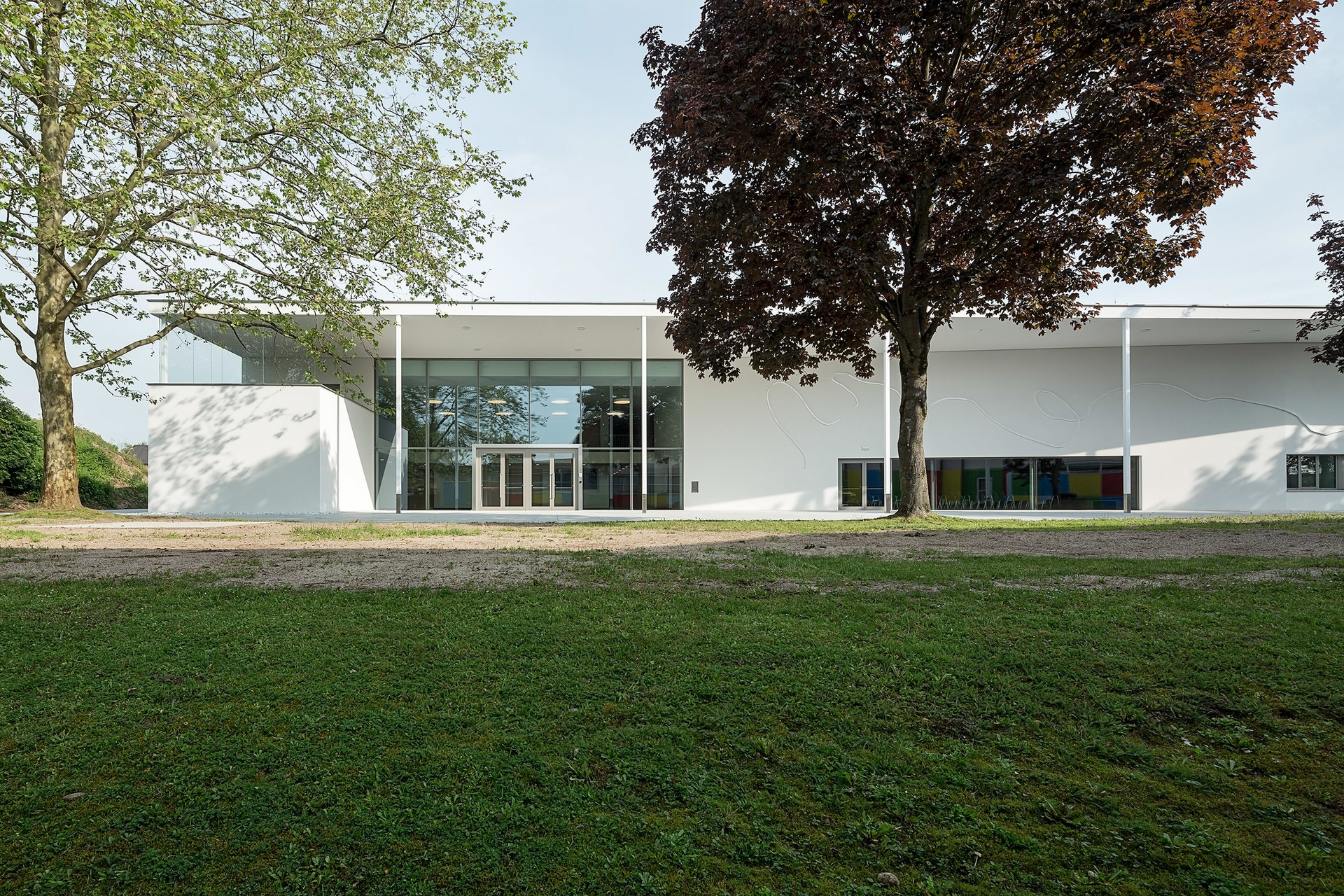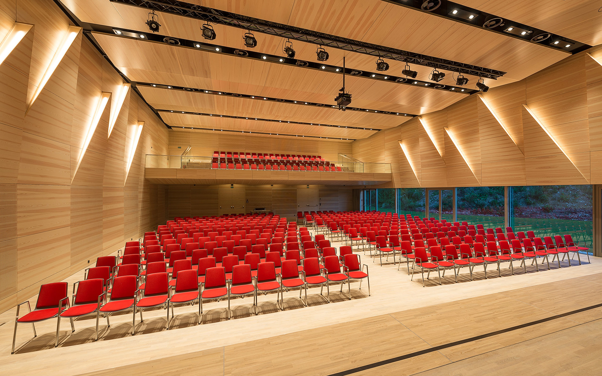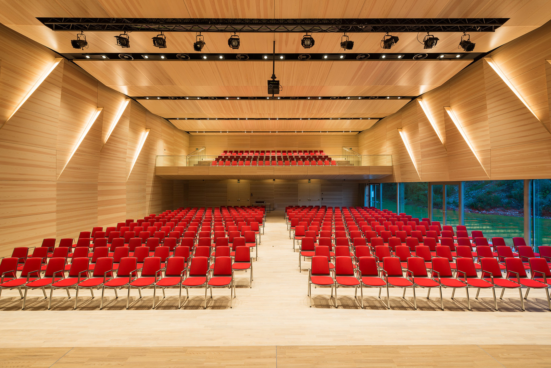 Die Anlage ist augenscheinlich einfach, mit einer hohen Dichte an Überlegungen für das reibungslose Ineinandergreifen der verschiedenen Funktionen entwickelt. Die gesamte Westseite des Gebäudes wird vom großen, über zwei Geschoße reichenden Veranstaltungssaal mit dem vorgeschalteten Foyer eingenommen. An der Südseite liegt, ebenfalls zweigeschoßig und vom Foyer aus erreichbar, ein kleinerer Saal, der von der Schrägstellung der Fassade in diesem Bereich akustisch profitiert. Direkt gegenüber öffnet sich der daran grenzende Erschließungsgang zum dritten großen Volumen des Hauses, dem Innenhof. Sein gekiester Boden senkt sich leicht nach Süden hin; von Bäumen beschattete Sitzstufen, ein Podest auf der einen und ein Balkon auf der anderen Stirnseite laden zu Aufführungen im Freien ein. Die Bühnen der beiden Säle liegen, über kurze Rampen erschlossen, auf einer Ebene, was den Transport schwerer Instrumente beträchtlich erleichtert. Im nördlichen und im östlichen Trakt des Gebäudes sind Unterrichtsräume angeordnet; die beiden Längsseiten des Hofes werden ebenfalls von Unterrichts- und Nebenräumen gesäumt. Musikschule und Kulturzentrum können voneinander getrennt und die Säle von beiden Einrichtungen bespielt werden.