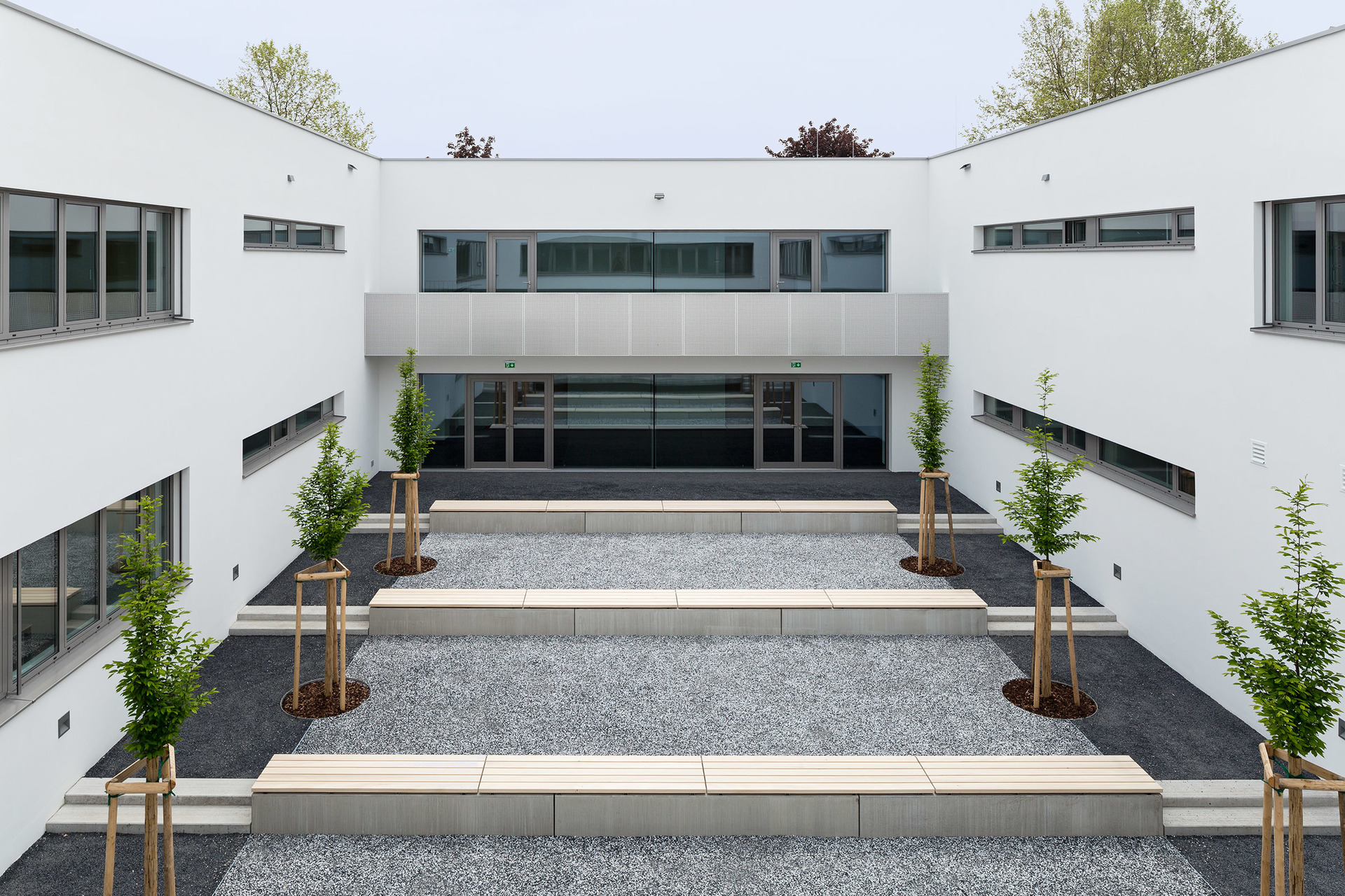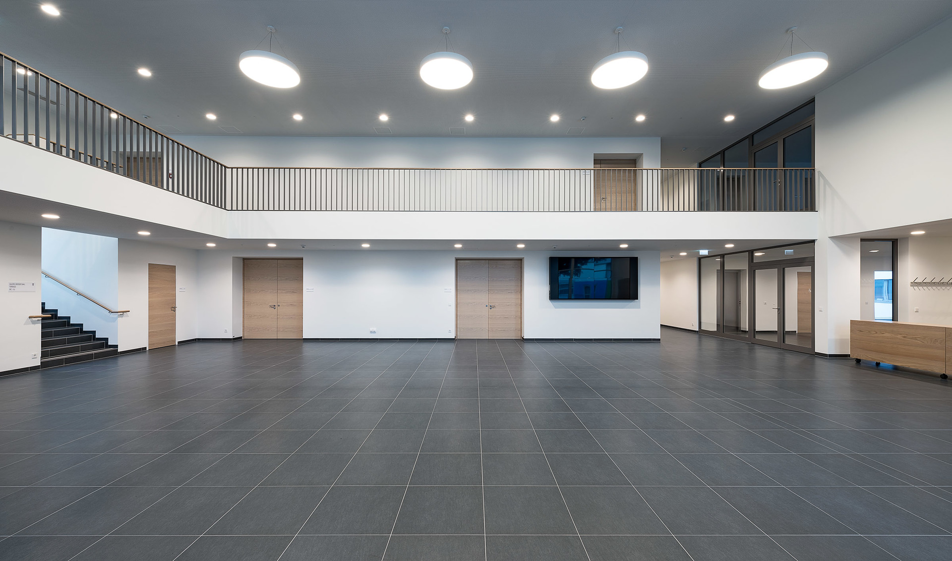 Vor diesem Hintergrund ist die rückhaltlose Zufriedenheit der Stadtbevölkerung mit ihrem neuen Veranstaltungszentrum ein schönes Kompliment an die Architekten, das sicher großteils der Funktionstüchtigkeit der Anlage gezollt wird. Der Bauplatz des neuen Veranstaltungszentrums liegt unweit des Kerns von Marchtrenk, sofern man diesen in der Gegend des Stadtamtes oder der katholischen Pfarrkirche verortet. Der Neubau teilt sich ein Grundstück mit seinem Vorgänger, dem Volkshaus Marchtrenk. Dieses Mahnmal seiner Entstehungszeit sollte eigentlich längst abgebrochen sein; als von den Vereinen Marchtrenks hochgeschätztes, da unverwüstliches Gehäuse von Aktivitäten aller Art wird es aber wohl noch eine Weile zwischen dem neuen Veranstaltungszentrum und der Hauptschule auf der Südseite der Goethestraße stehen. Den Auftritt des Neubaus schränkt dieser Umstand kaum ein: Das Büro Luger & Maul hat die beiden Nutzungsbereiche in einem zweigeschoßigen Baukörper organisiert, der mit seinem Volumen und dem annähernd quadratischen, um einen Innenhof gruppierten Grundriss das Motiv des für den Landstrich typischen Vierkanthofes aufgreift. Die Musikschule und das Kulturzentrum haben jeweils einen eigenen Haupteingang, die beide in einer von schlanken Stützen getragenen Loggia liegen. Die Loggia erstreckt sich über die gesamte Ost- und Südseite des Gebäudes und sichert insbesondere dem Veranstaltungsbereich durch das Verschwenken der Fassade ein vom geplanten Abbruch des Volkshauses unabhängiges, großzügiges Vorfeld und eine klar herausgearbeitete Eingangssituation.