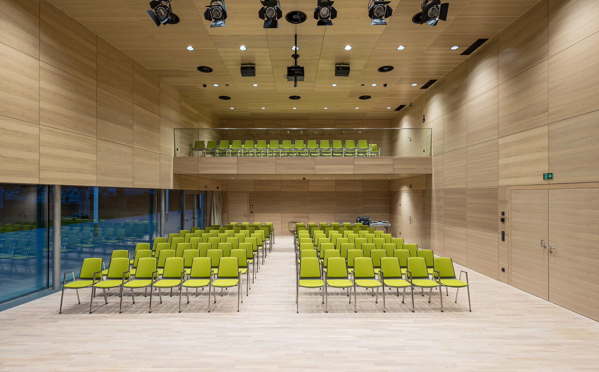 Den auf umfassende Alltagstauglichkeit zielenden Raumfolgen des Veranstaltungszentrums entspricht ein Gestaltungskonzept, das ebenfalls recht alltäglich daherkommt mit den weiß verputzten Wänden, grauen Keramikböden und nüchternen Stabgeländern. Dennoch sind Beispiele nachlässig hingeworfenen billigen Bauens mit dieser sparsamen Architektur nicht vergleichbar. Hier wurde alles weggelassen, was nicht nötig gewesen wäre. Notwendig waren: klare Wegführung und Orientierung im Haus; Zonen für Ruhe und für Bewegung; gut proportionierte, von Tageslicht erhellte, akustisch einwandfrei funktionierende Räume; flächenbündige Türen aus geweißter Eiche; Eichenböden; putzbündig verlegte Sockelleisten und Fensterbänke; der in Eichenholz gefasste kleine Saal; der mit Kiefer, dem typischen Gehölz der Welser Heide, akustisch wirksam verkleidete große Saal; der breite Blick ins Freie aus beiden Sälen; die Stiege zur Galerie im gläsernen Erker; die sorgsame Komposition der Körper und Fassaden; die mit ihrer Metall-Ummantelung in den Himmel gespiegelte Haustechnik; der fein geglättete Außenputz; die zarten Stützen auf flächenbündigen Edelstahlsockeln; der filigrane Rand des Daches.