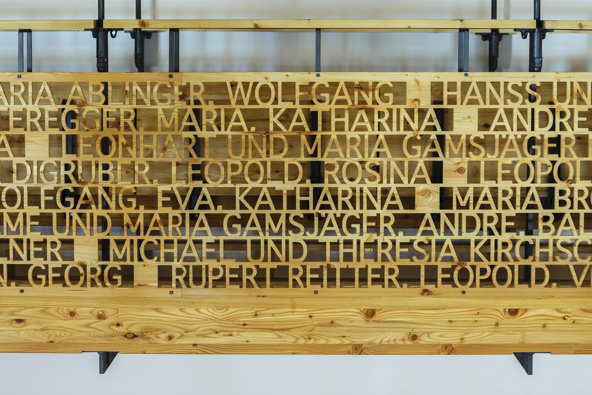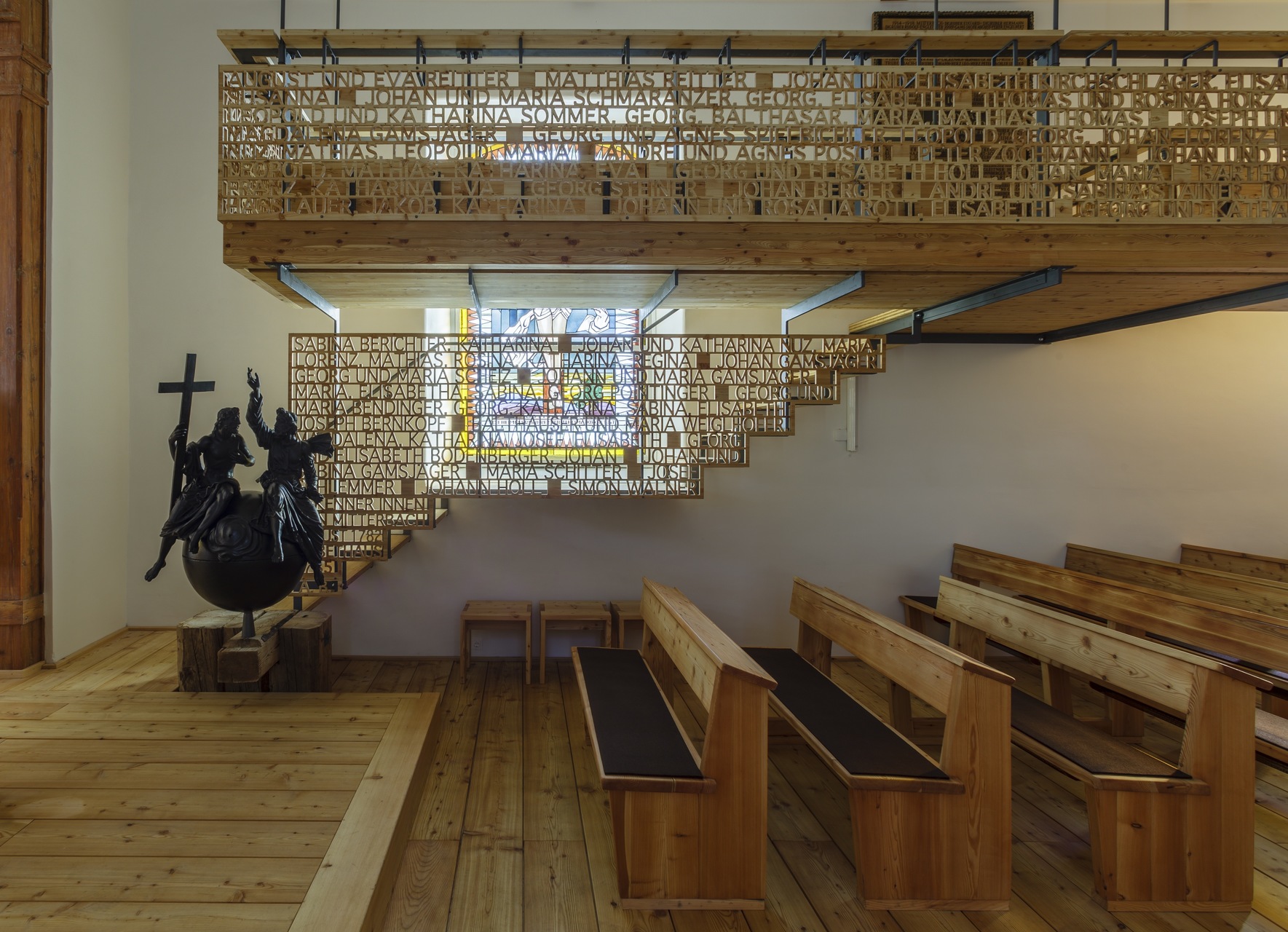 Das feine, an Laubsägearbeiten erinnernde Gitterwerk der Brüstungen – zunächst industriell aus Platten gefräst und dann Buchstabe für Buchstabe händisch nachbearbeitet – setzt sich aus den Namen der ersten evangelischen „Bekenner“ aus dem Jahr 1782 zusammen und erweist somit den Pionieren die Ehre. Das wirkt bewusstseinsbildend und identitätsstiftend, viele der Familiennamen existieren in der Gemeinde bis heute. Die so leichtfüßig wirkende Empore ist eine raffinierte Konstruktion, die auf Basis akribisch genau ausgearbeiteter Detailpläne in engem Zusammenwirken von Zimmerer, Schlosser, Tischler und Architekten entstand. Diese Art des handwerklichen Arbeitens und gemeinsamen Entwickelns sei heute wohl nur noch in Kirchen möglich, meint Ernst Beneder.