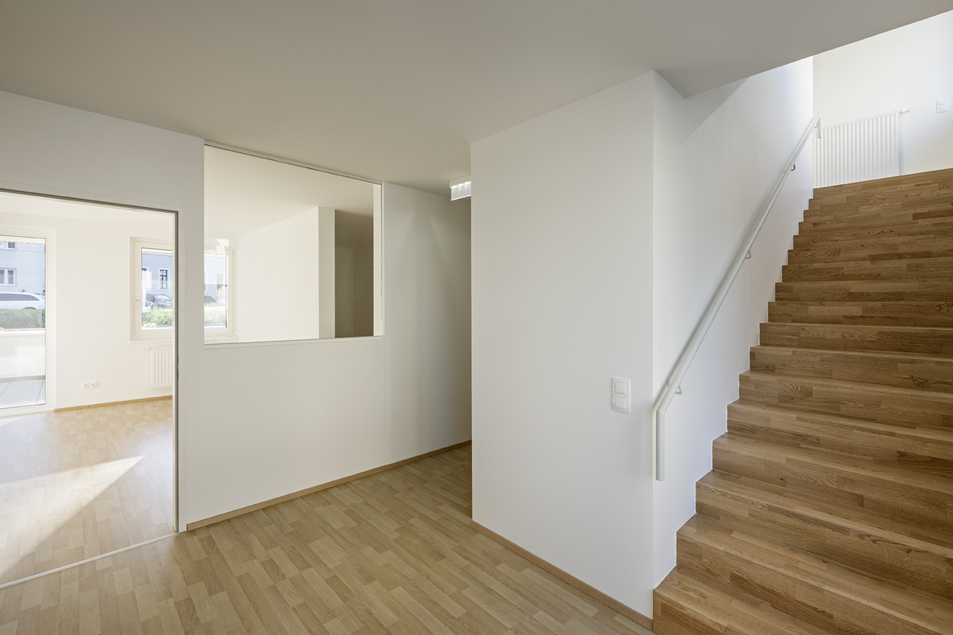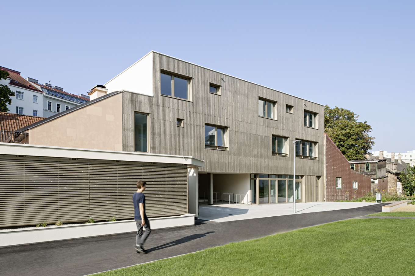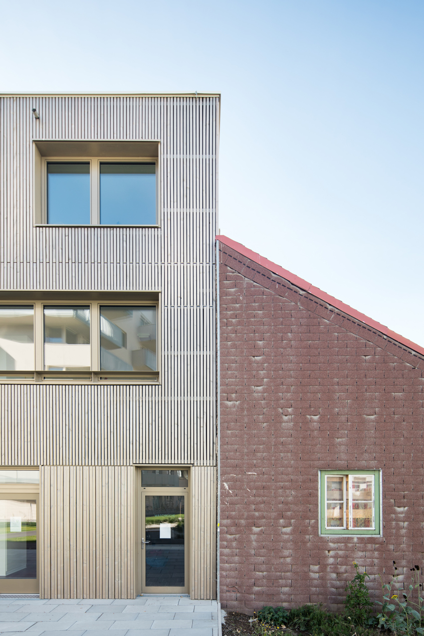 Ein Wohnbau der kleineren Dimension, jedoch mit besonderen Ansprüchen. Die hier wohnenden und sozialpädagogisch betreuten Jugendlichen sollen ein neues Zuhause finden, einen Ort, der eine familiäre Wohnsituation bietet, ausreichend gemeinsame Aktivitäten erlaubt, aber auch Rückzugsmöglichkeiten für die Jugendlichen erlaubt.Mit seinem Maßstab und seiner Materialität fügt sich der Neubau der FUX-Wohngemeinschaft in die bestehende, dörflich anmutende Gebäudezeile ein. Verkleidet mit metallisch-lasierten Holzstäben spannt sich das Gebäude über eine Passage zwischen Straße und der ebenfalls von trans_city umgesetzten Wohnbebauung Lorenz-Reiter-Straße, Bauplatz 2. Diese bewohnte Brücke vermittelt architektonisch zwischen den sehr differenzierten Bauformen bzw. Stadträumen ihres heteromorphen Umfelds.
