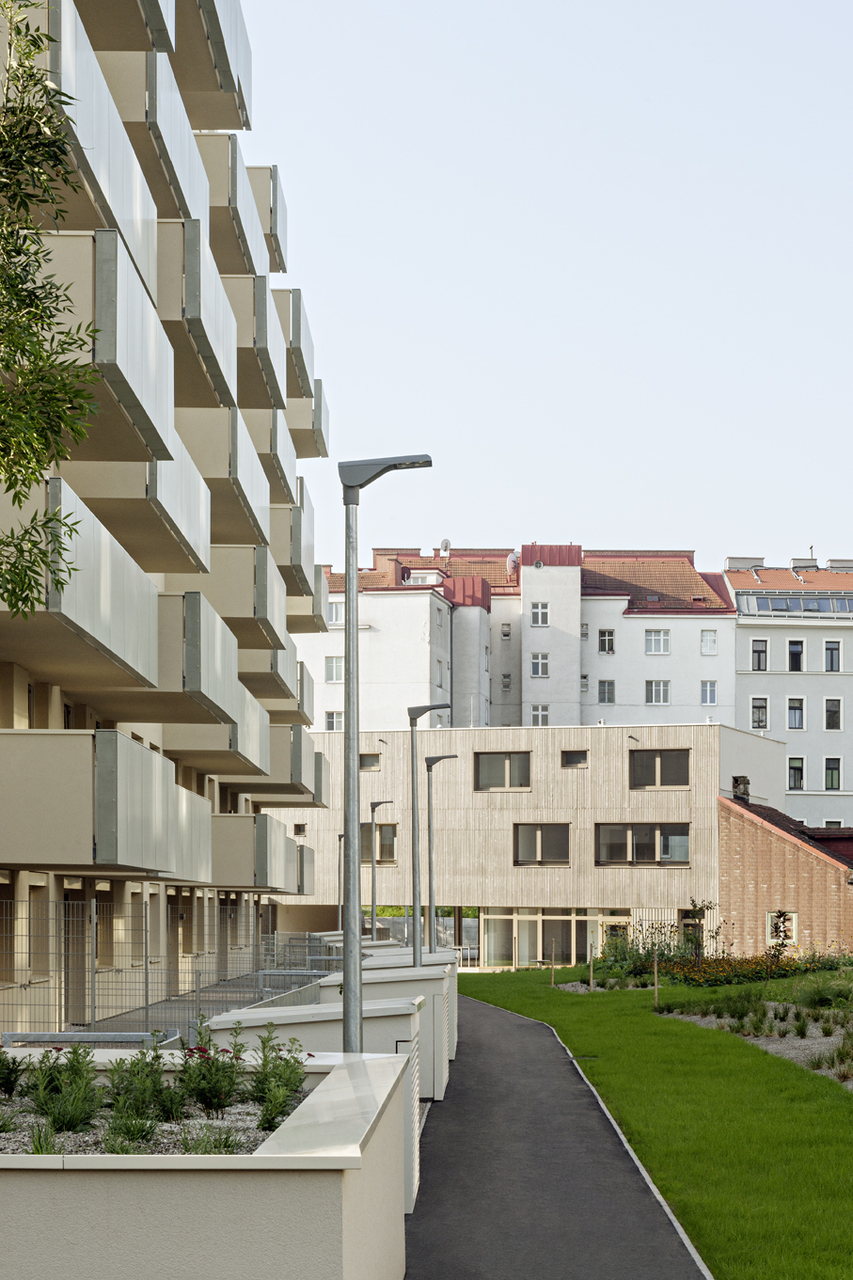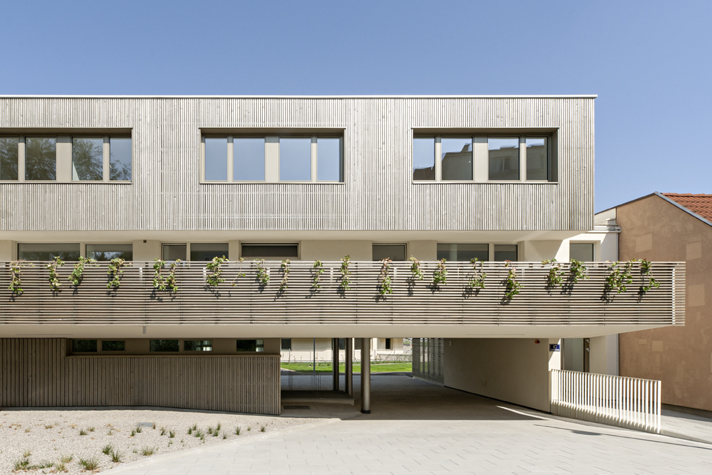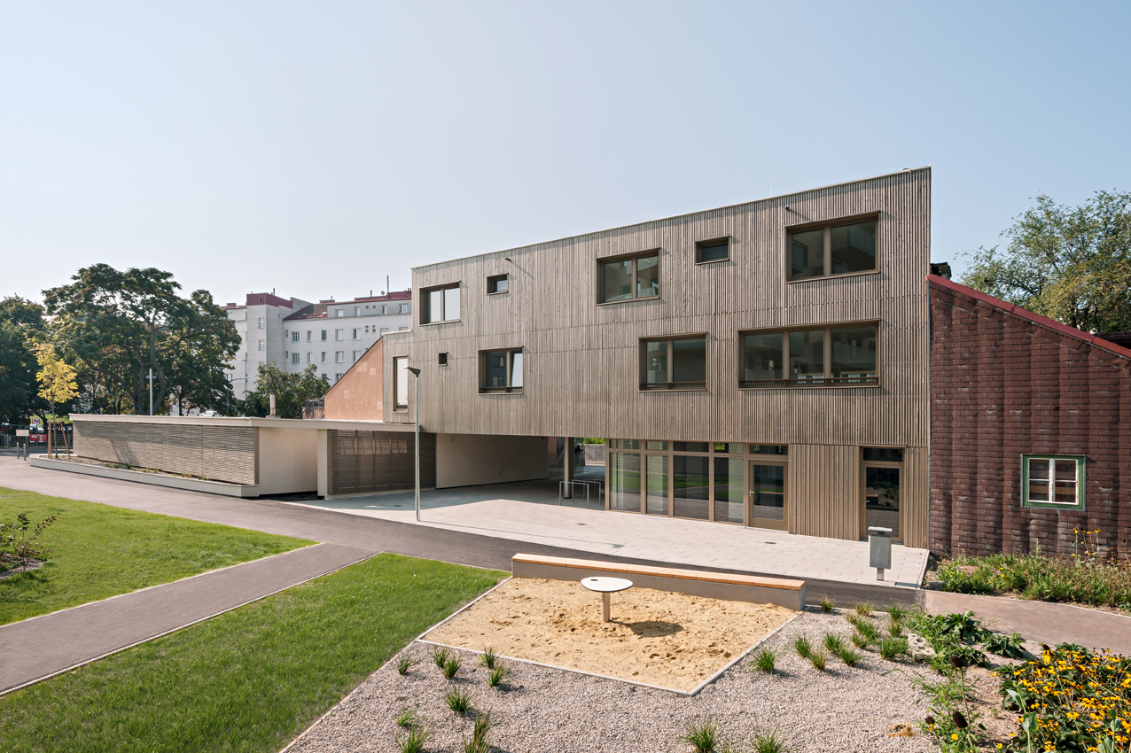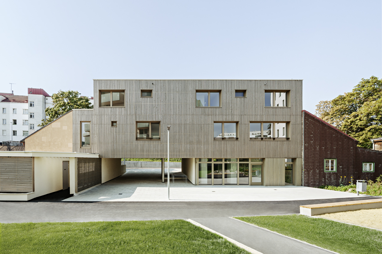 Ein Wohnbau der kleineren Dimension, jedoch mit besonderen Ansprüchen. Die hier wohnenden und sozialpädagogisch betreuten Jugendlichen sollen ein neues Zuhause finden, einen Ort, der eine familiäre Wohnsituation bietet, ausreichend gemeinsame Aktivitäten erlaubt, aber auch Rückzugsmöglichkeiten für die Jugendlichen erlaubt.Mit seinem Maßstab und seiner Materialität fügt sich der Neubau der FUX-Wohngemeinschaft in die bestehende, dörflich anmutende Gebäudezeile ein. Verkleidet mit metallisch-lasierten Holzstäben spannt sich das Gebäude über eine Passage zwischen Straße und der ebenfalls von trans_city umgesetzten Wohnbebauung Lorenz-Reiter-Straße, Bauplatz 2. Diese bewohnte Brücke vermittelt architektonisch zwischen den sehr differenzierten Bauformen bzw. Stadträumen ihres heteromorphen Umfelds.