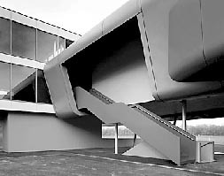Für seinen „Terminal V“ in Lauterach gilt das in ganz besonderem Maß: Dieses Gebäude-„Objekt“ ist eindeutig nicht aus dem Vorarlberger Boden gewachsen, es macht vielmehr den Eindruck, als sei es nicht nur räumlich, sondern auch zeitlich von ziemlich weither angeflogen und nur vorübergehend gelandet. Tatsächlich ist die Flugzeugmetapher im Zusammenhang mit dem Haus gar nicht so falsch. Denn diese „bauchige“ Architektur mit ihrer glatten, silbrigen Fiberglashaut aus vorgefertigten Sandwichteilen und der leuchtend roten Freitreppe, die wie eine Gangway ins um ein Geschoß vom Boden abgehobene Gebäude hinaufführt, die hat wirklich etwas von einem Flugobjekt. Zumindest von einem Flugzeugrumpf.