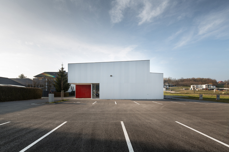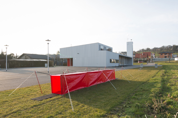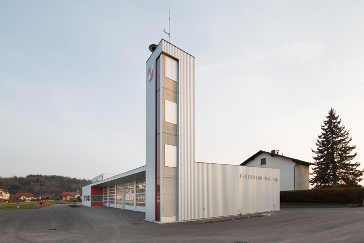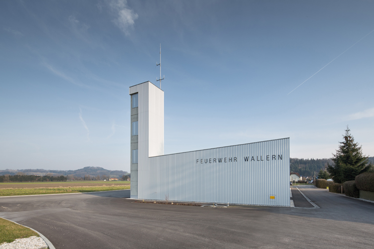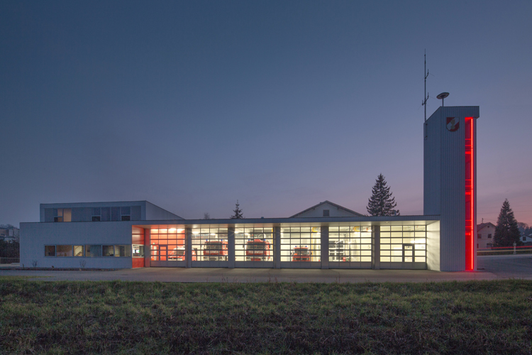 Aus der Sicht des Vorbeifahrenden zeigt sich der Neubau der Feuerwehr prägnant, selbstbewusst und mit seinen Toren quer zur Landesstraße. Der Schlauchturm ist gut sichtbar als Zeichen an der Landesstraße platziert. Einschnitte in den Fassaden gliedern das Bauvolumen. Sie definieren den Eingangsbereich, die Torausfahrten und den Übungsbereich am Turm. Dadurch werden plastisch und in Materialwechseln die Schnittstellen zwischen Innen- und Außenräumen gezeigt und ein baulicher Wetterschutz erreicht. Höchstes Augenmerk wurde auf das nachbarliche Umfeld gelegt. Der Vorplatz mit den hier zu erwartenden Lärmemissionen wurde dazu auf die von den Nachbarn abgewandten Seite gelegt.