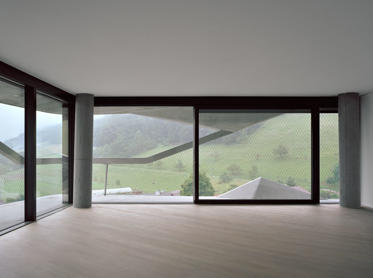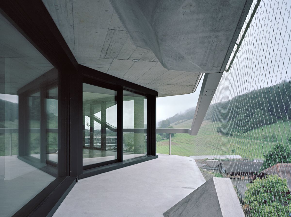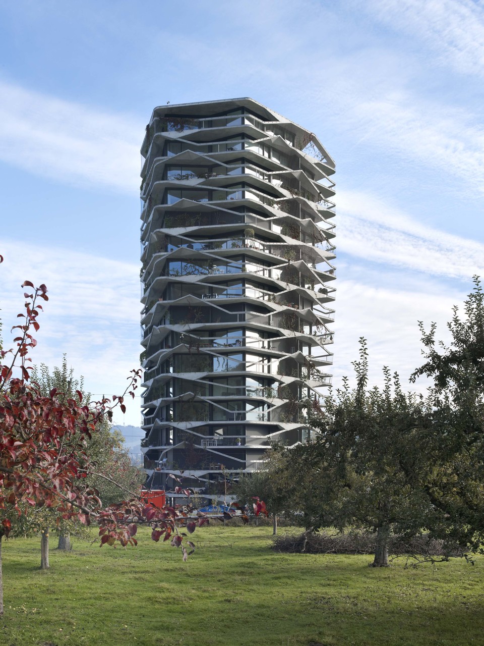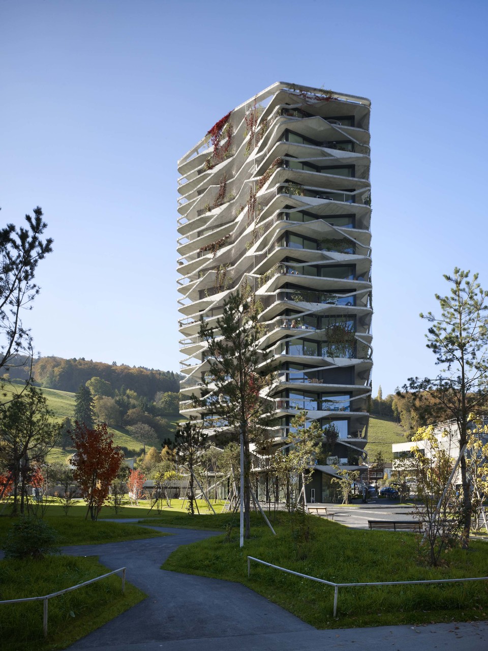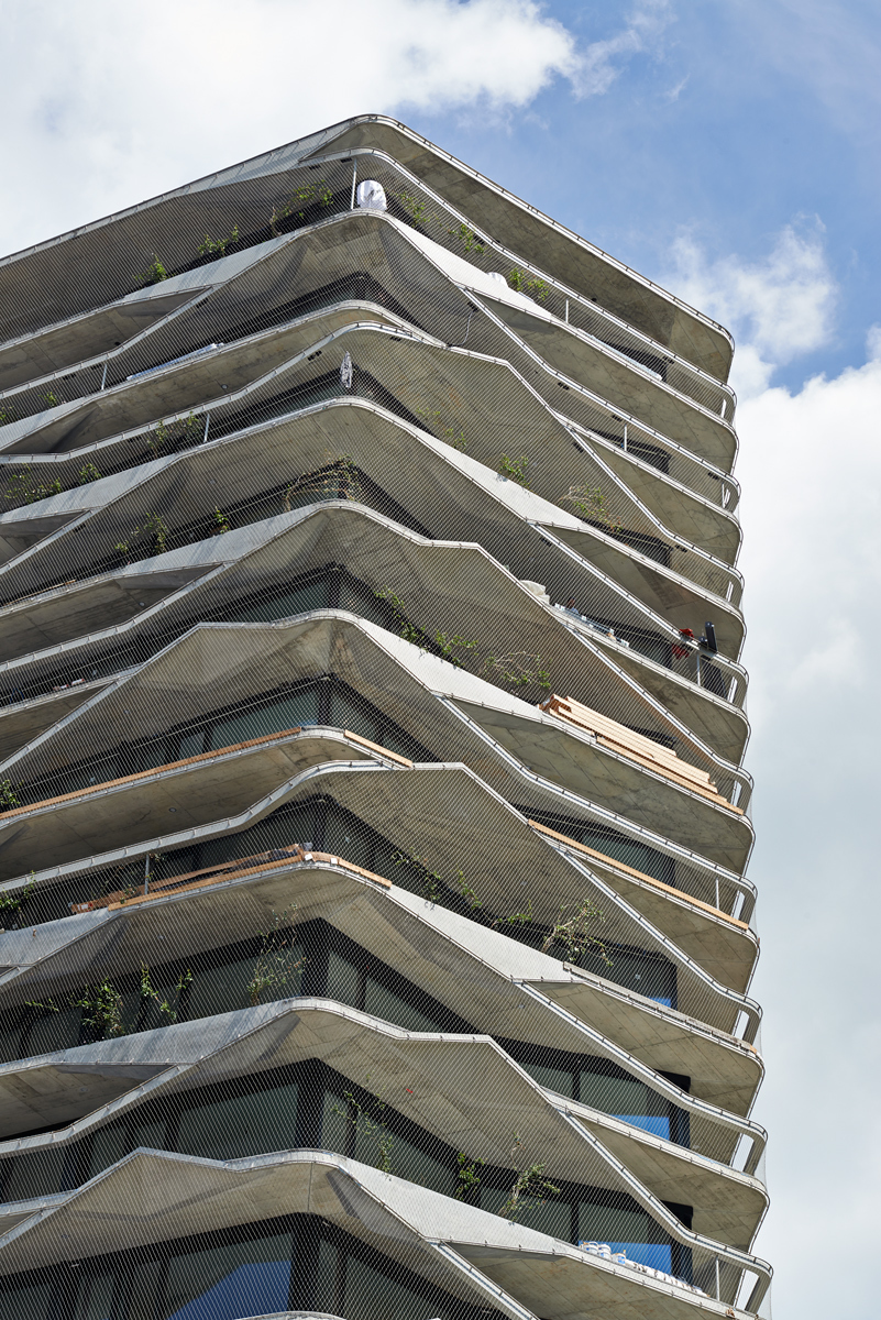Die allseitig auskragenden Betonplatten lassen eine steinerne Wirkung entstehen. Ein rautenförmiges Metallnetz umspannt die poröse Struktur. Die aus partiellen Ausschnitten entstehenden Sichtfelder werden von grossen Metallbügeln gerahmt. Die Nutzungsthemen der umlaufenden Balkonplatten prägen deren Form und entwickeln sich zum architektonischen Leitmotiv. Die entstehende Randkontur kann als Nachzeichnung der Gebirgstopografie gelesen werden. Über das metallene Netz, das den steinernen Körper umhüllt, entwickelt sich der Garten vertikal als Schattenspender für die Wohnbereiche. Die Bepflanzungen werden direkt auf die Gebäudeabwicklung und deren Orientierung abgestimmt. Die Grundrisse der Wohnungen sind offen gestaltet und von der vielseitigen Orientierung sowie den freien Zirkulationsthemen bestimmt. (Text: Architekten)