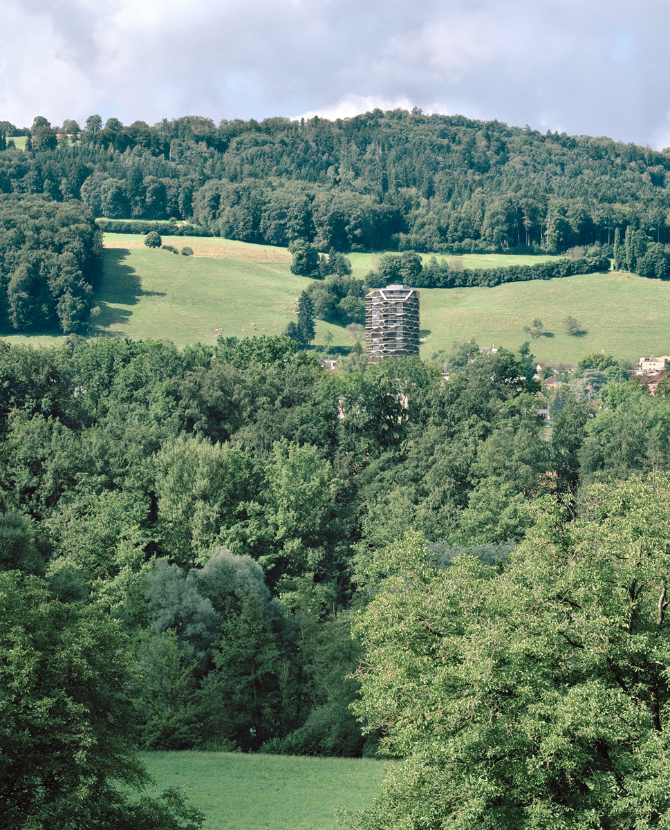 Das Projektthema Wohnen mit Aussicht führt zum Entwurf eines neuartigen Wohnturms, dessen amorphe Form sich einer klaren typologischen Zuweisung widersetzt. Der Turm wird auf einer polygonalen Grundfläche geformt und erweitert in der vertikalen Entwicklung seine Grundfläche. Er öffnet sich allseitig und unterstreicht den Bezug zur Landschaft. Das Gebäude wird von der Strasse zurückgesetzt. Die im Bebauungsmuster entstehende Fuge verweist auf die neue Bausequenz. Aus der ansteigenden Topografie wächst das Gebäude zum Turm.