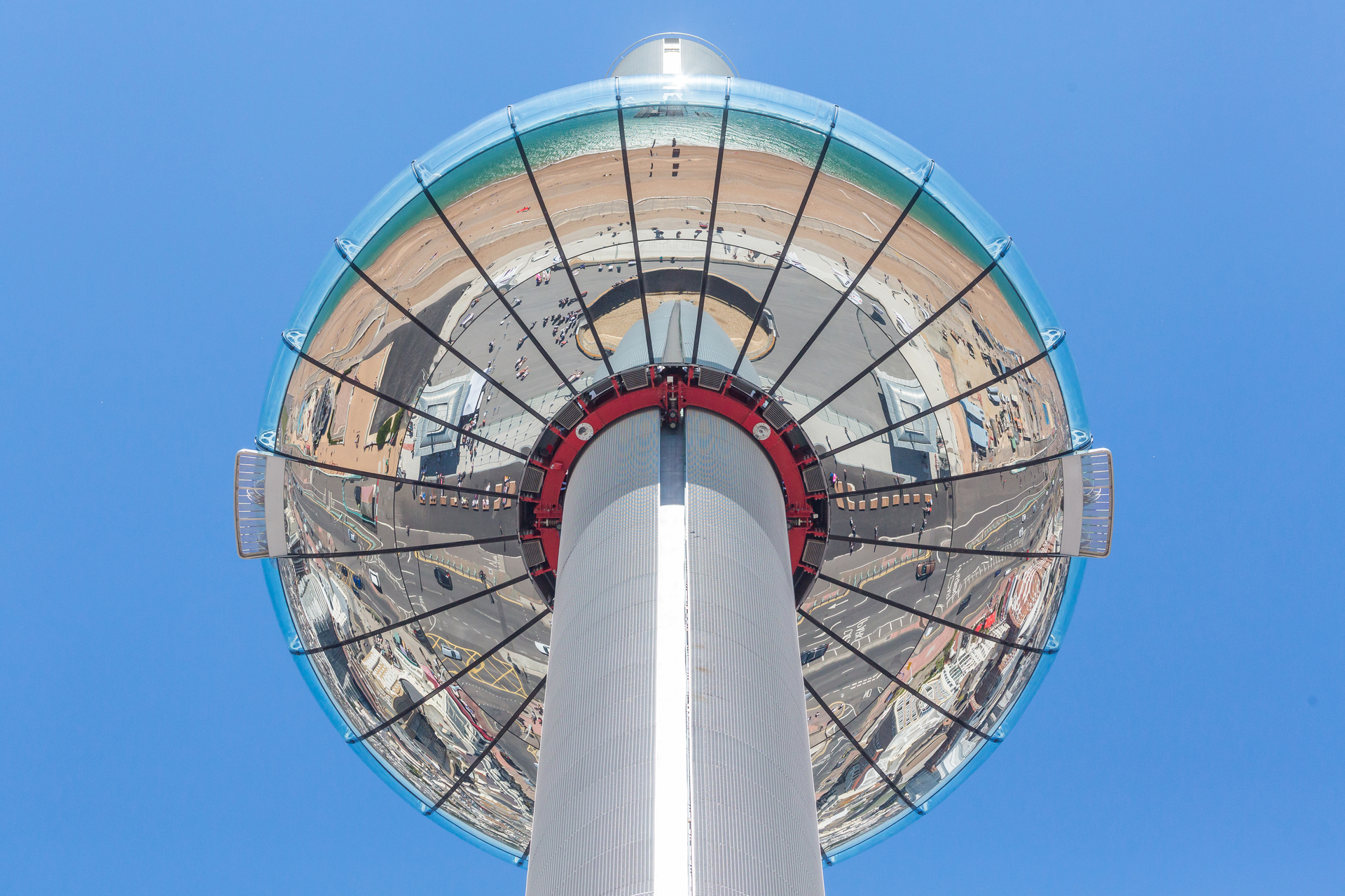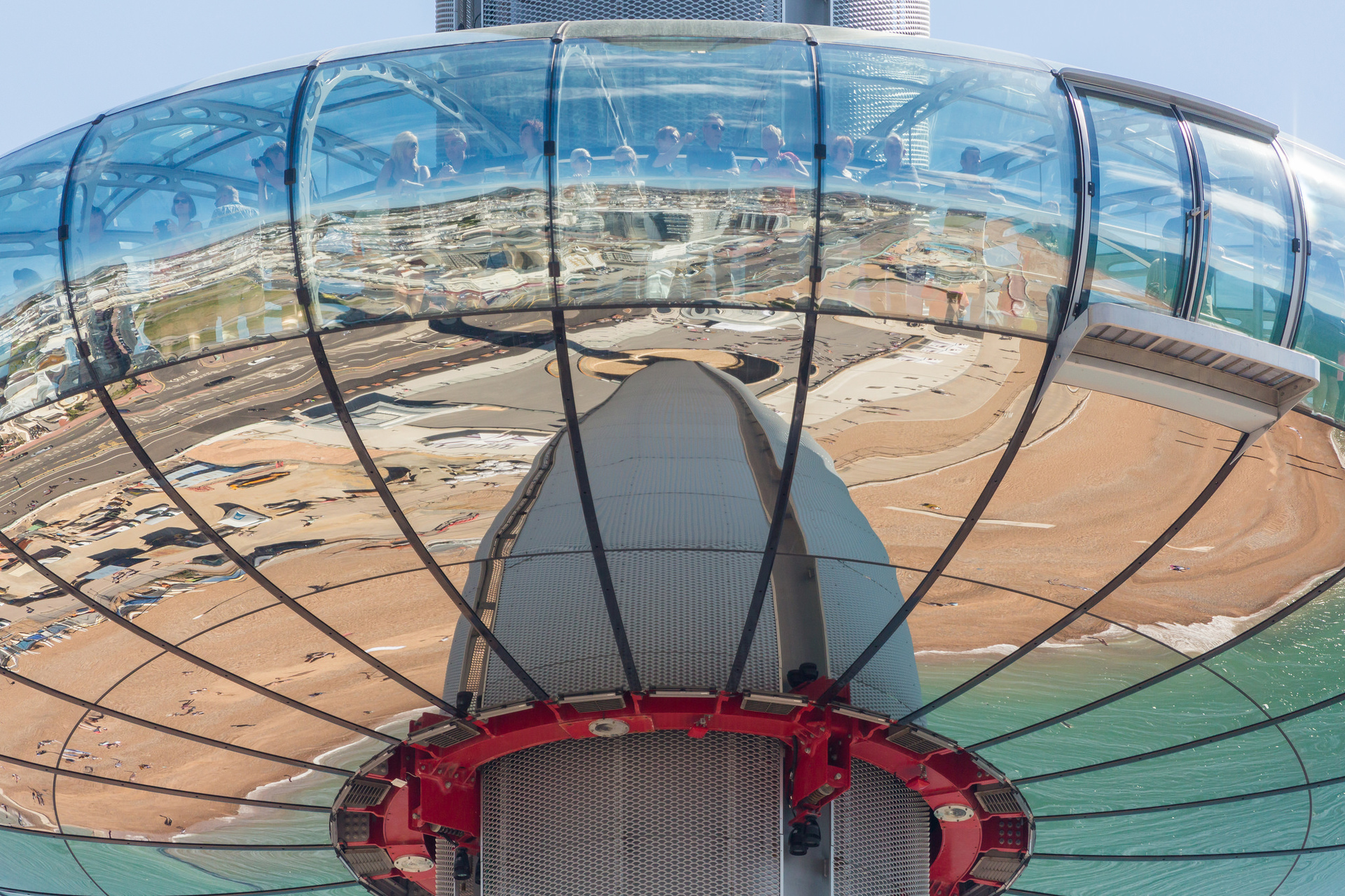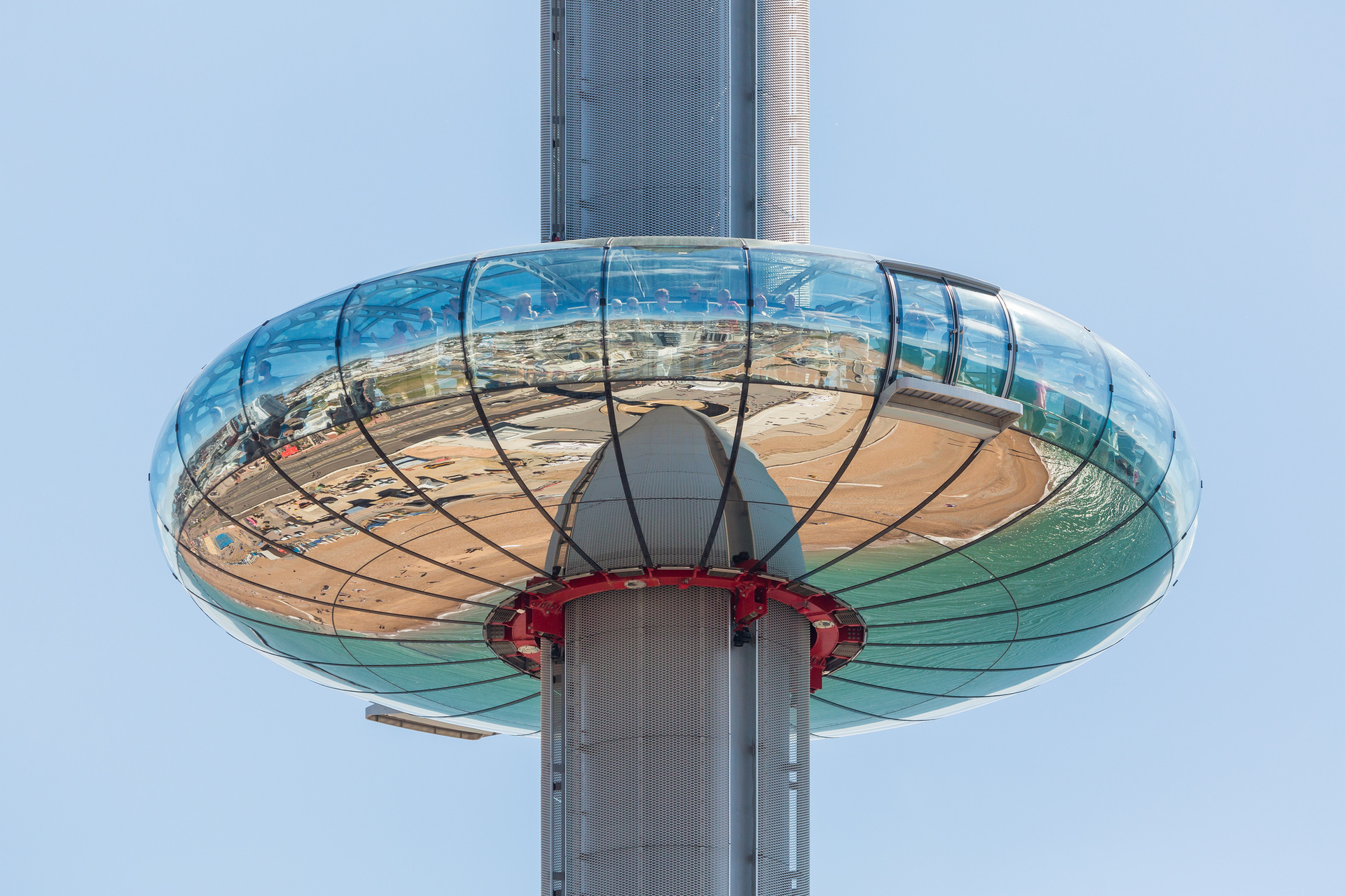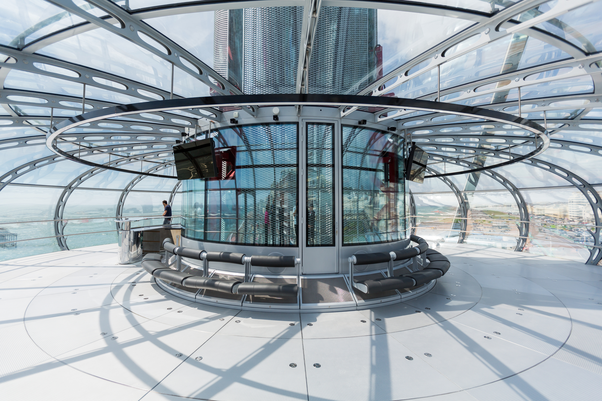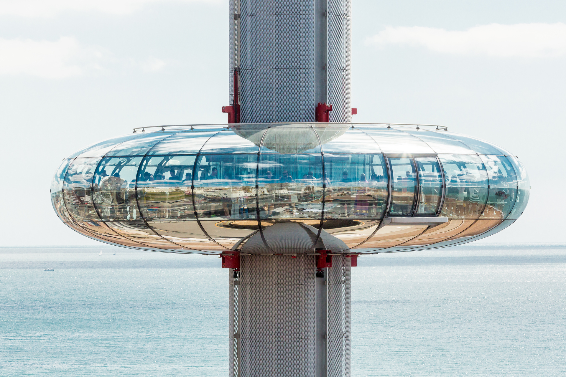 Statt der 32 Kabinen für jeweils 25 Personen also nur eine große Kapsel, die bis zu 200 Menschen aufnehmen kann; statt der Beförderung von 1600 Passagieren pro Stunde in London höchstens 600. Aber wo? Also wieder auf Reisen, diesmal nur auf der Insel, weil vor möglichem Export der Erfolgsbeweis im Inland stehen sollte. „In Brighton bekamen wir besonders herzliche Aufnahme – und natürlich diesen wunderbaren Bauplatz“, an der Stelle des 1866 eröffneten West Pier, auf dem im 19. Jahrhundert jährlich Millionen promenierten, der aber längst Ruine ist. Zudem hatte die Stadt schon bisher elf Millionen Besucher im Jahr, und sie ist für den gesamten Londoner Großraum mit rund 15 Millionen Einwohnern binnen zwei Stunden erreichbar.