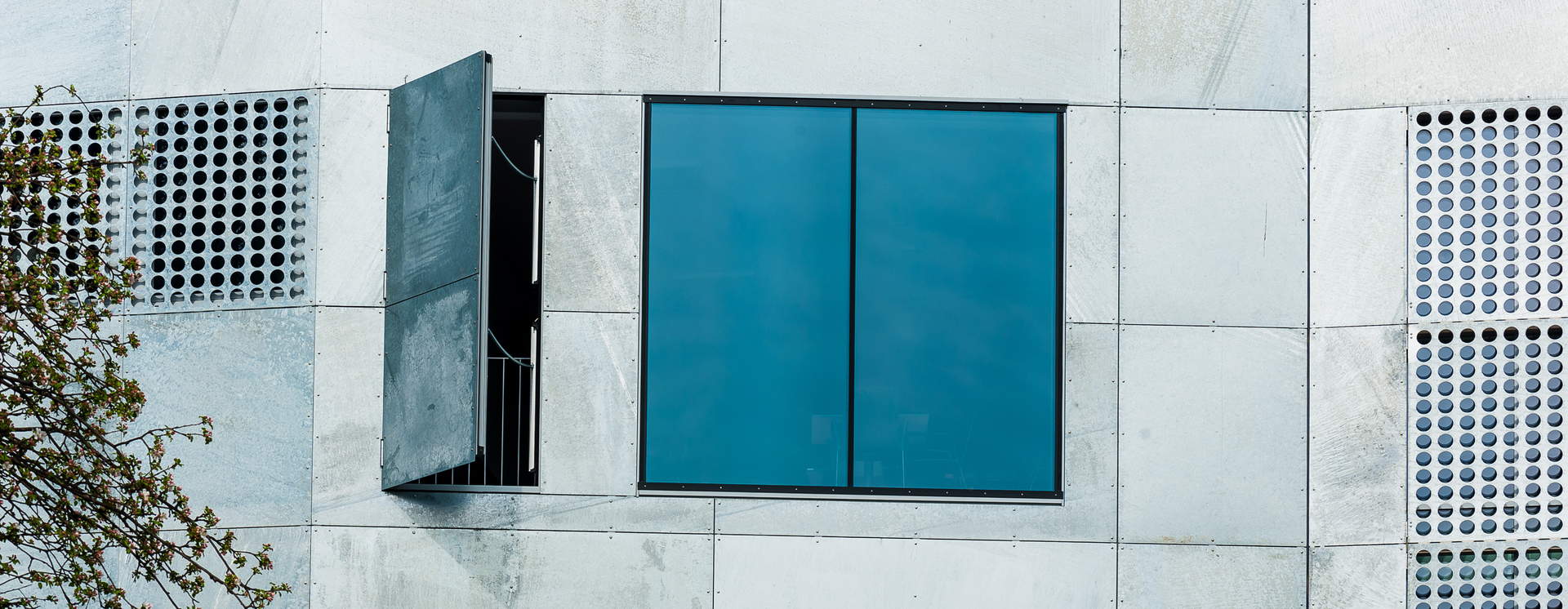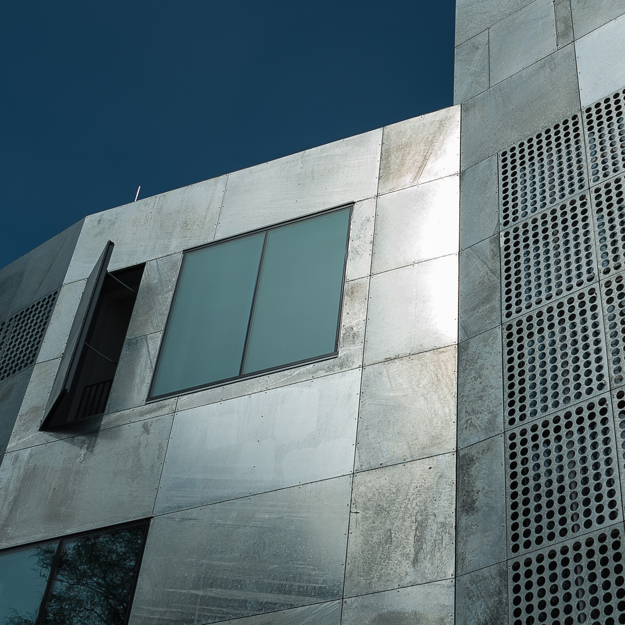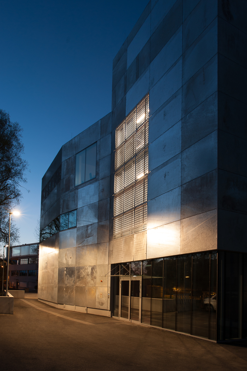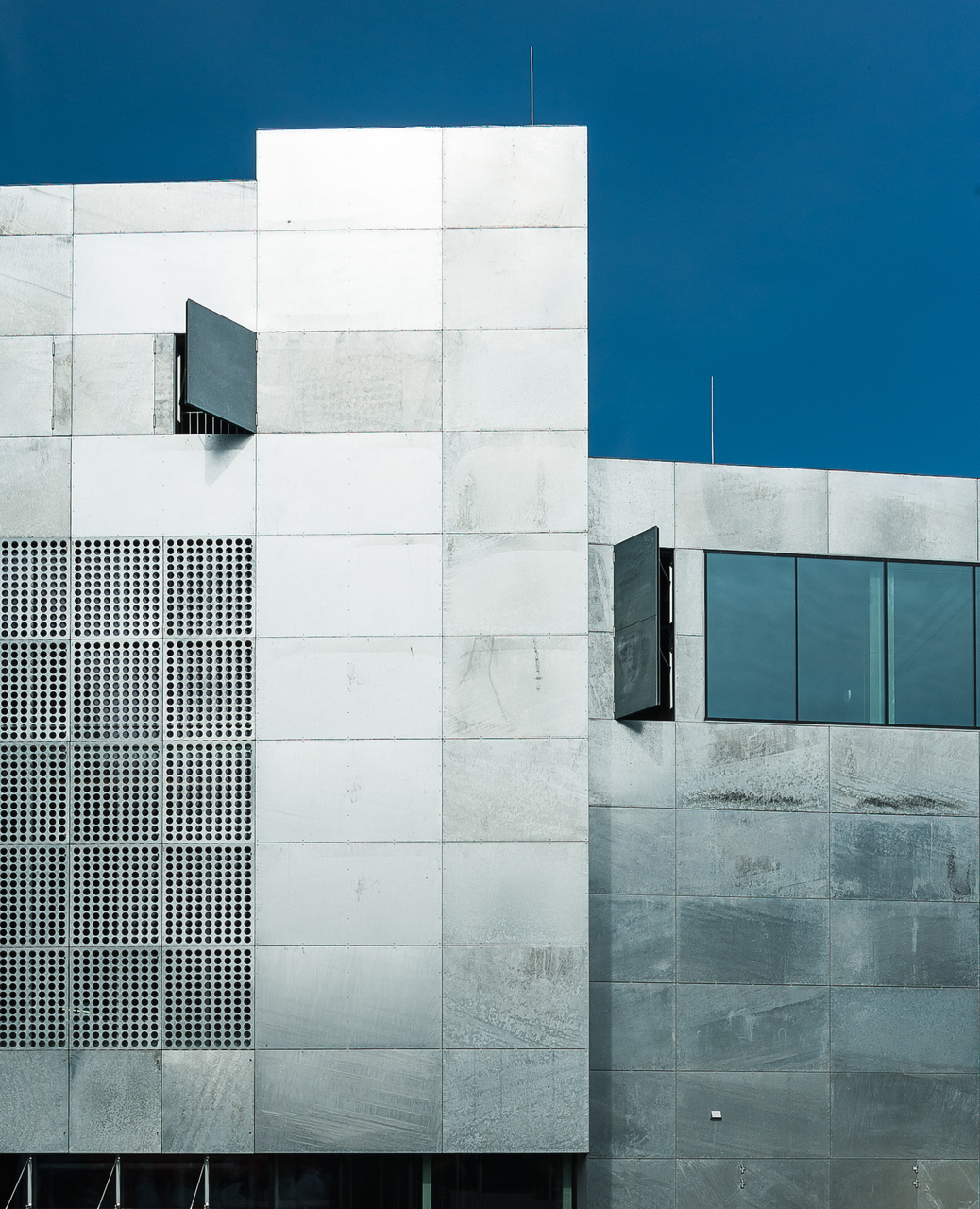 Die Fassade bildet durch seine diffus schimmernde Erscheinung eine homogene Einbindung der großen geschlossenen Volumen in den Straßenraum. Großformatige Öffnungen strukturieren die Volumen. So wie die Fassade durch die Materialität (Schimmern in unterschiedlichen Farbtönen je nach Tageszeit) ihre Erscheinung verändert, bilden die versteckt ausgeführten Lüftungsflügel, die nach außen öffnen, als auch eine teilweise Lochung der Fassadentafeln eine Irritation der klaren Volumen und verbinden den introvertierten Körper mit seiner Umgebung. (Text: Architekt)