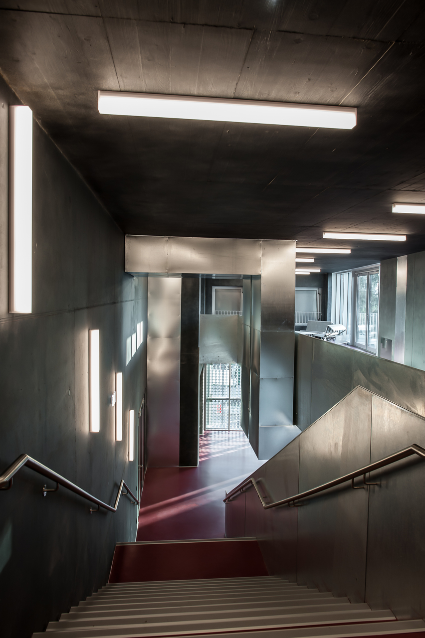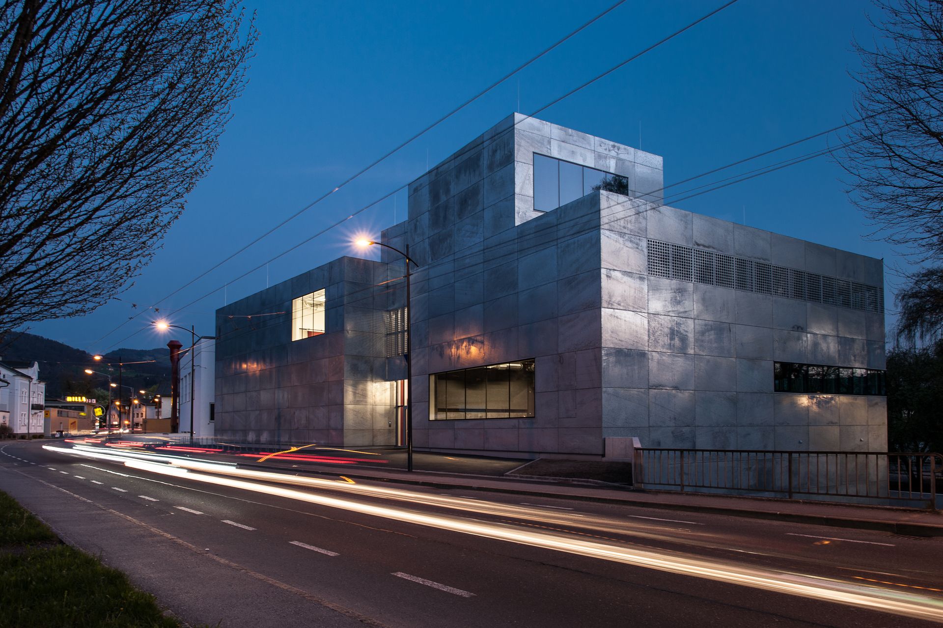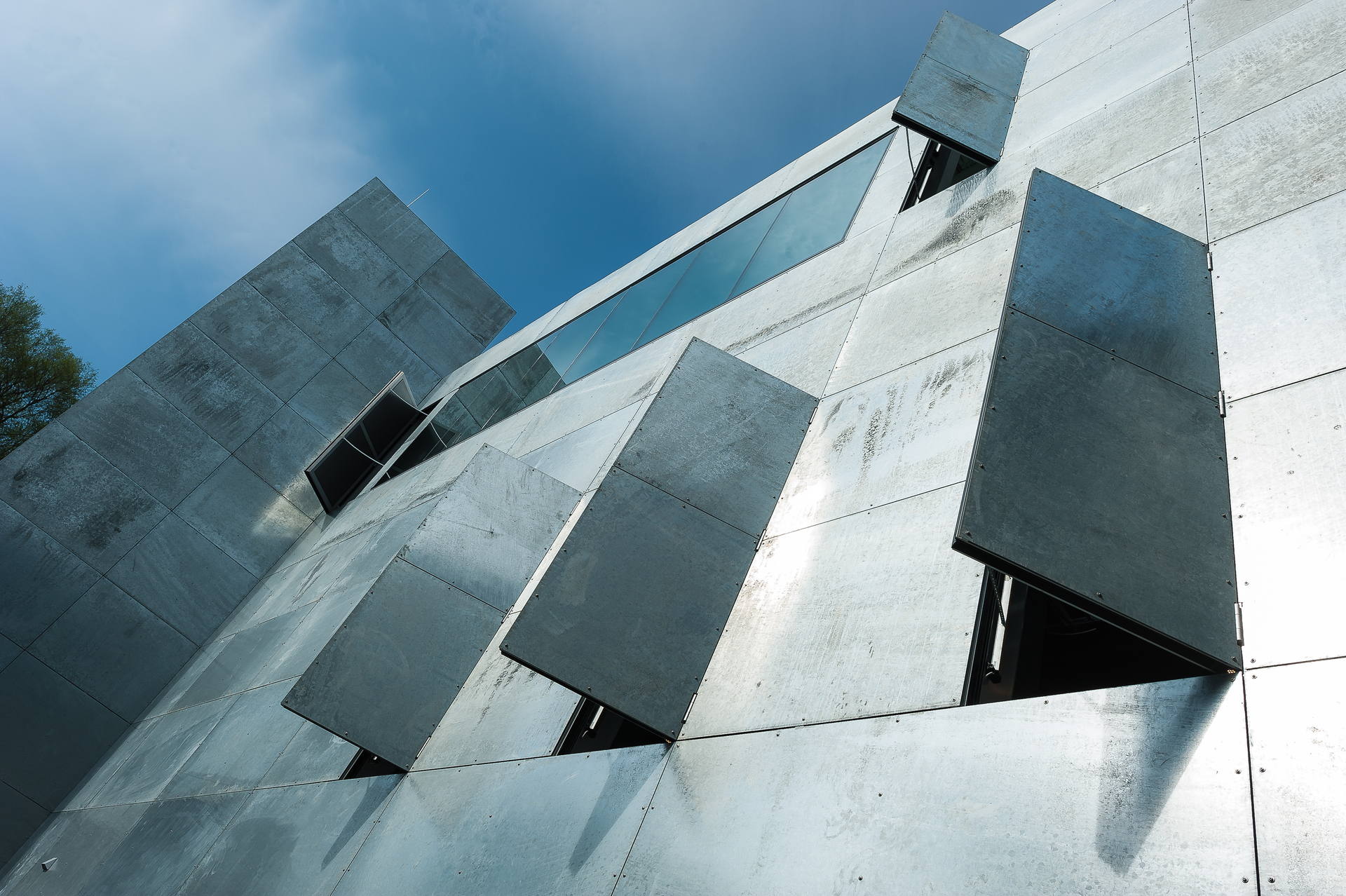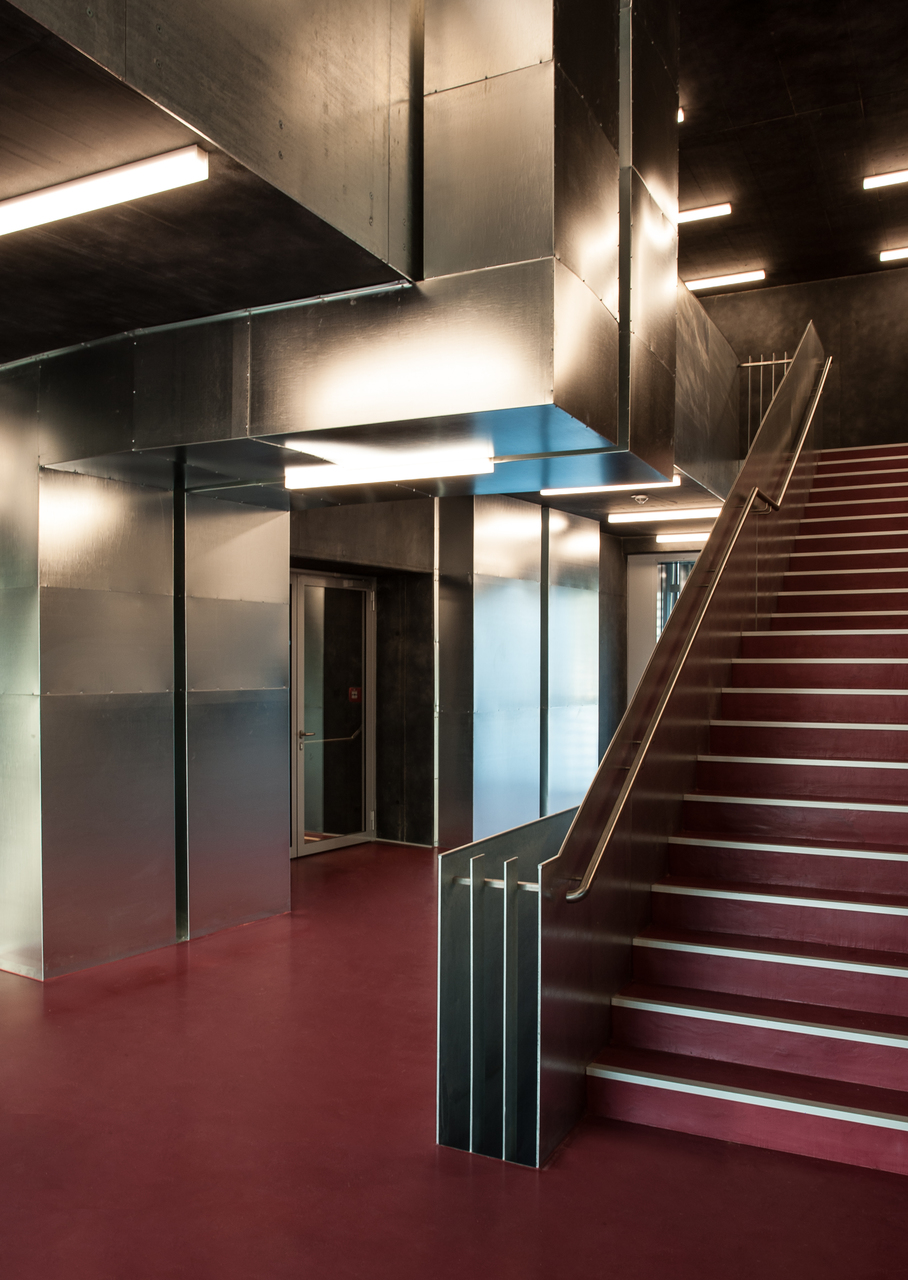 Die Fassade bildet durch seine diffus schimmernde Erscheinung eine homogene Einbindung der großen geschlossenen Volumen in den Straßenraum. Großformatige Öffnungen strukturieren die Volumen. So wie die Fassade durch die Materialität (Schimmern in unterschiedlichen Farbtönen je nach Tageszeit) ihre Erscheinung verändert, bilden die versteckt ausgeführten Lüftungsflügel, die nach außen öffnen, als auch eine teilweise Lochung der Fassadentafeln eine Irritation der klaren Volumen und verbinden den introvertierten Körper mit seiner Umgebung. (Text: Architekt)