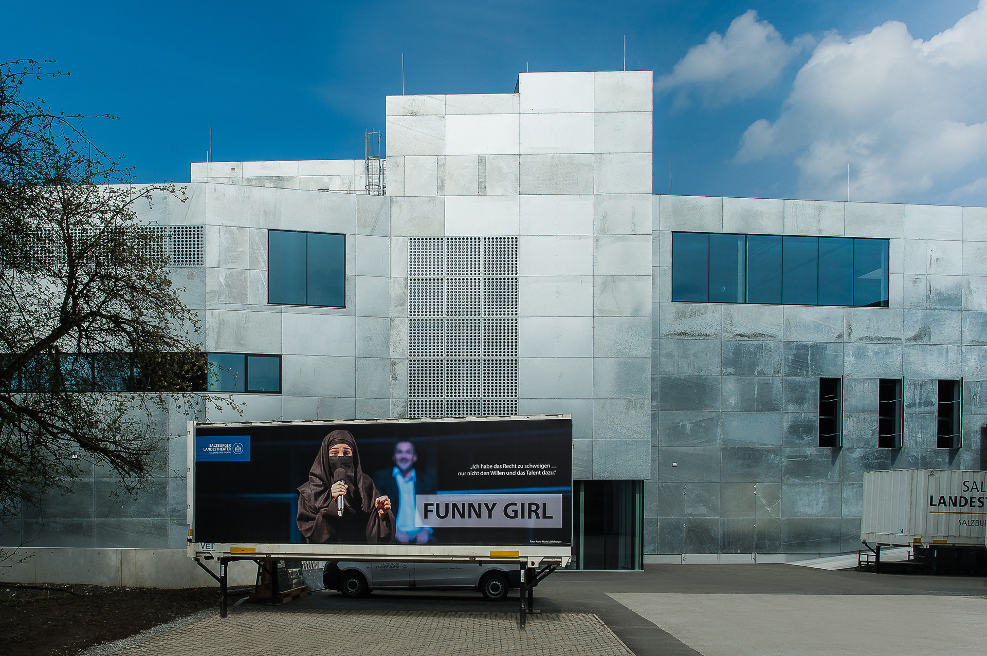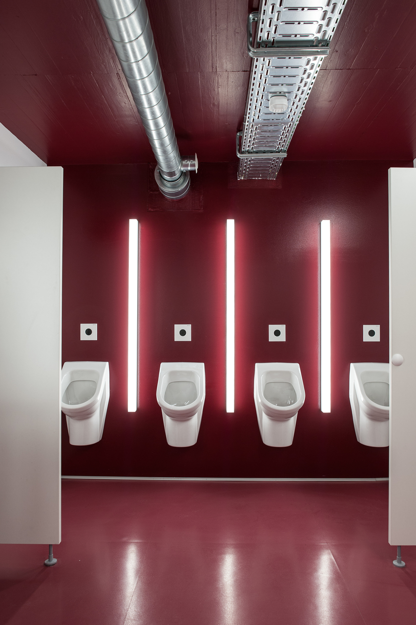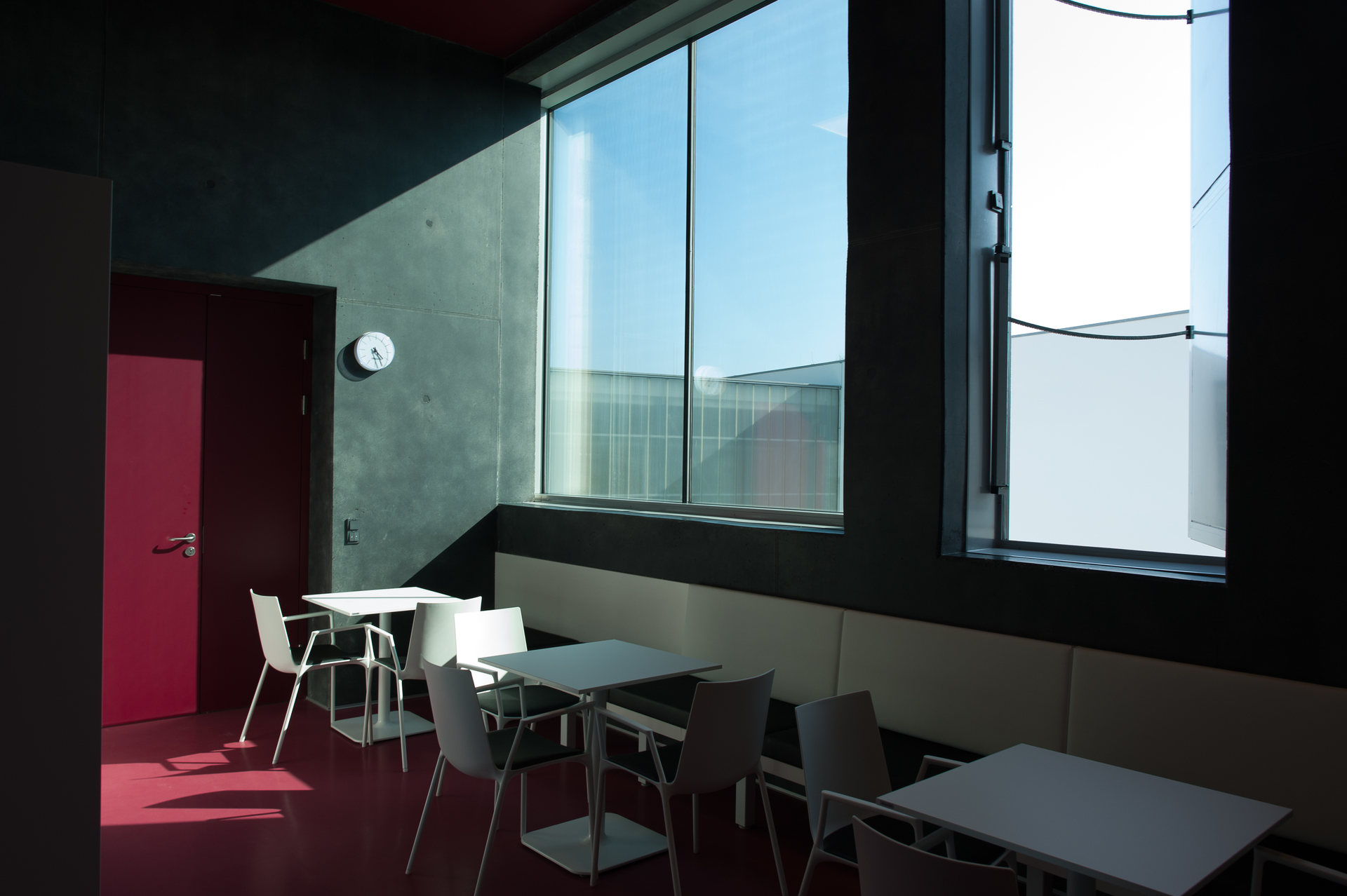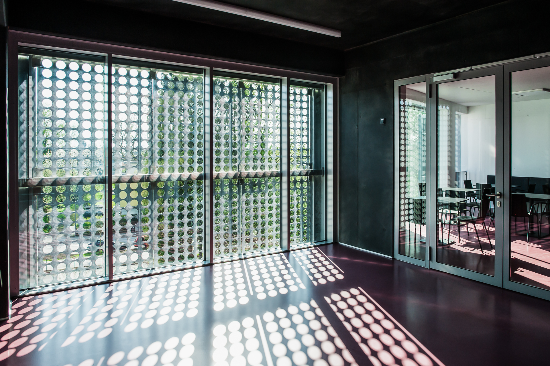 Die Fassade bildet durch seine diffus schimmernde Erscheinung eine homogene Einbindung der großen geschlossenen Volumen in den Straßenraum. Großformatige Öffnungen strukturieren die Volumen. So wie die Fassade durch die Materialität (Schimmern in unterschiedlichen Farbtönen je nach Tageszeit) ihre Erscheinung verändert, bilden die versteckt ausgeführten Lüftungsflügel, die nach außen öffnen, als auch eine teilweise Lochung der Fassadentafeln eine Irritation der klaren Volumen und verbinden den introvertierten Körper mit seiner Umgebung. (Text: Architekt)
