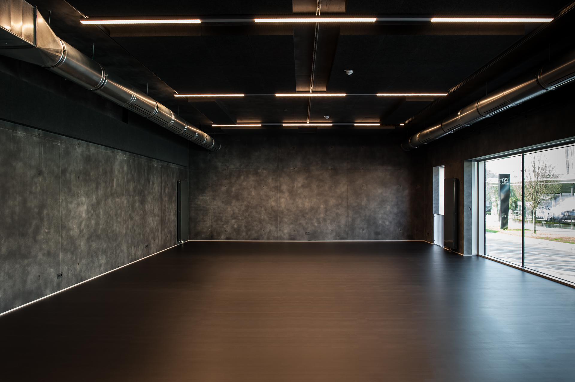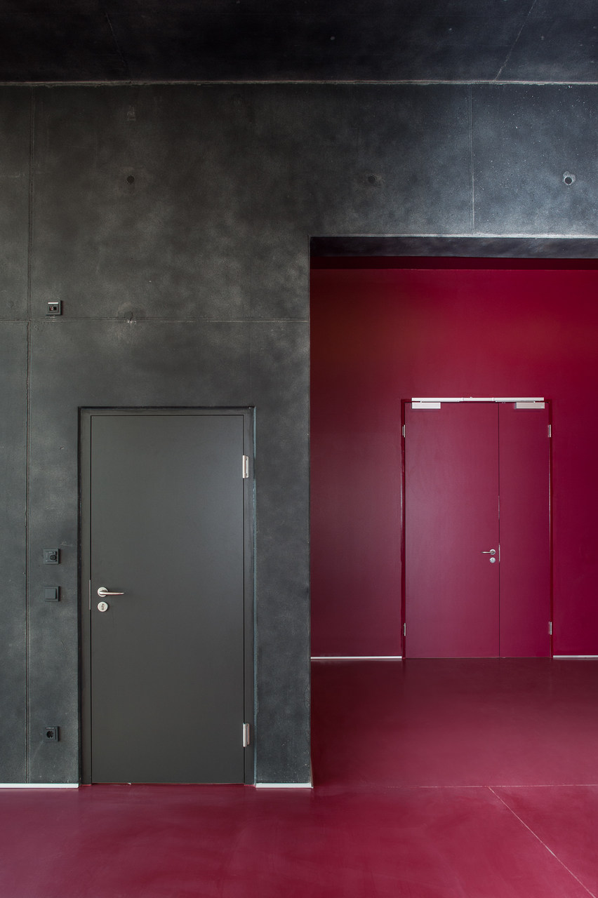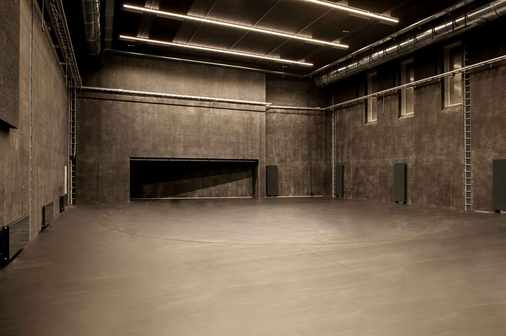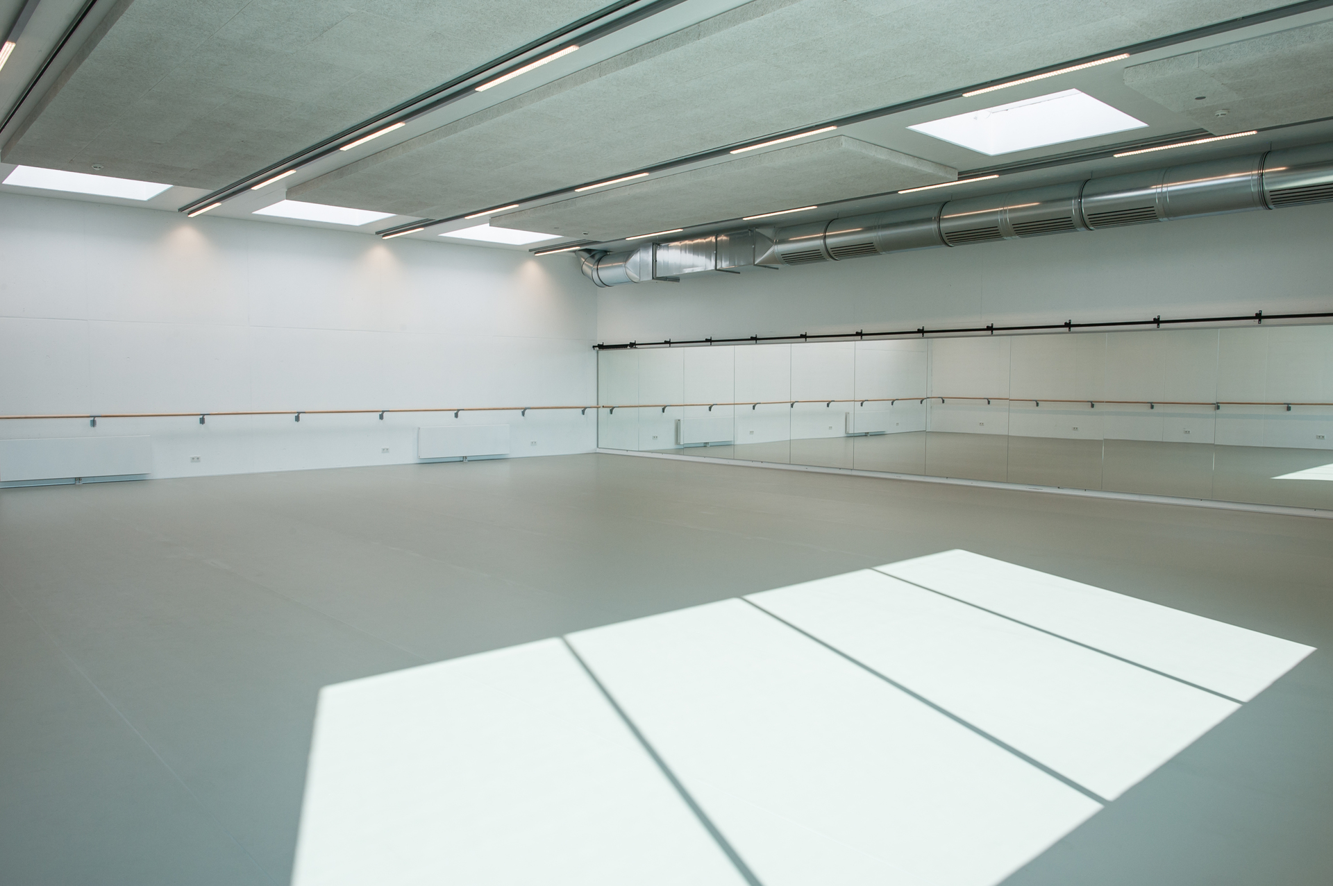 Die Verschachtelung dieser Räume bildet ein introvertiertes Raumgefüge mit dem Verbindungsgelenk als Verweil- und Kommunikations-Zone. Die Proberäume selbst dienen als geschlossene intime Zellen dem ungestörten Proben. Der verschlossenen Grundhaltung entgegen bildet der Proberaum-3 die Ausnahme. Seine Öffnung zum öffentlichen Raum bildet ein Wechselspiel von Bühne und Probe sowie Innen und Außen. Der öffentliche Raum wird zum gefühlten Zuschauerraum. Öffnet sich der Vorhang wird der Proberaum-3 zum Saal, zur Bühne oder einfach nur zum Ankünder von Aktivitäten im Haus (z.B. Vorschau auf Premieren).