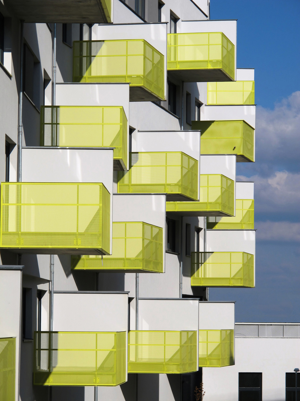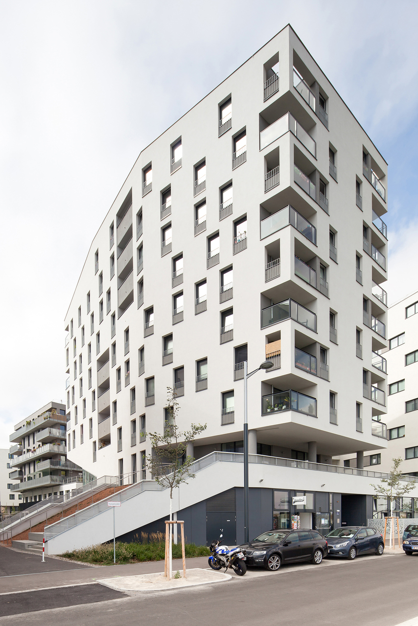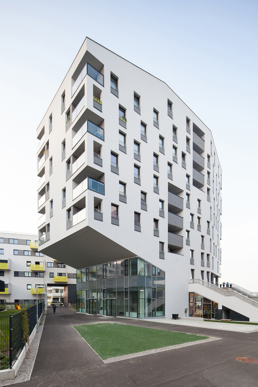 Beim Einzelkubus im Inneren des Grundstückes wird der Wohnungsteil versetzt auf einem zweigeschoßigen Sockel, in dem sich Kinderhort und Kindertagesheim befinden, aufgesetzt. Auch hier bieten prägnante Öffnungen und Einschnitte in den Fassaden jeder Wohnung sichtgeschützte Freiflächen. Großzügige Gemeinschaftsräume, Kinderspielplätze und Dachterrasse bieten hohe Wohnqualität. (Text: Martina Pfeifer Steiner)