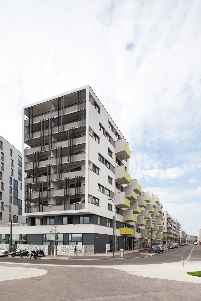 Die nord-westliche Bebauung von Atelier 4 hängt seine zwei Türme, die einmal mit acht Obergeschoßen, einmal mit neun in die Höhe wachsen, zum See hin im Erdgeschoß gekonnt zusammen. Eine prächtige Freitreppe führt auf ein Plateau, das als neuer kommunikativer Platz auch Ausblick über den See bietet. Der Straße ins Innere des Quartiers folgend schließt ein länglicher sechs- bis siebengeschoßiger Baukörper an, mit gelb markierten Balkonen und „durchgesteckten“ Wohnungen. Die Orientierung nach zwei Himmelsrichtungen, flexible Raumabfolgen, ein differenziertes Wohnungsangebot sind bei der gesamten Bebauung Prämisse. Der zweite höhere Turm ist zur Eingangsseite hin scharf geschnitten und gestaltet mit seiner auffallenden Auskragung den Stadtraum, abgesehen davon, dass dadurch auch die Baunutzungszahl eingehalten wird.