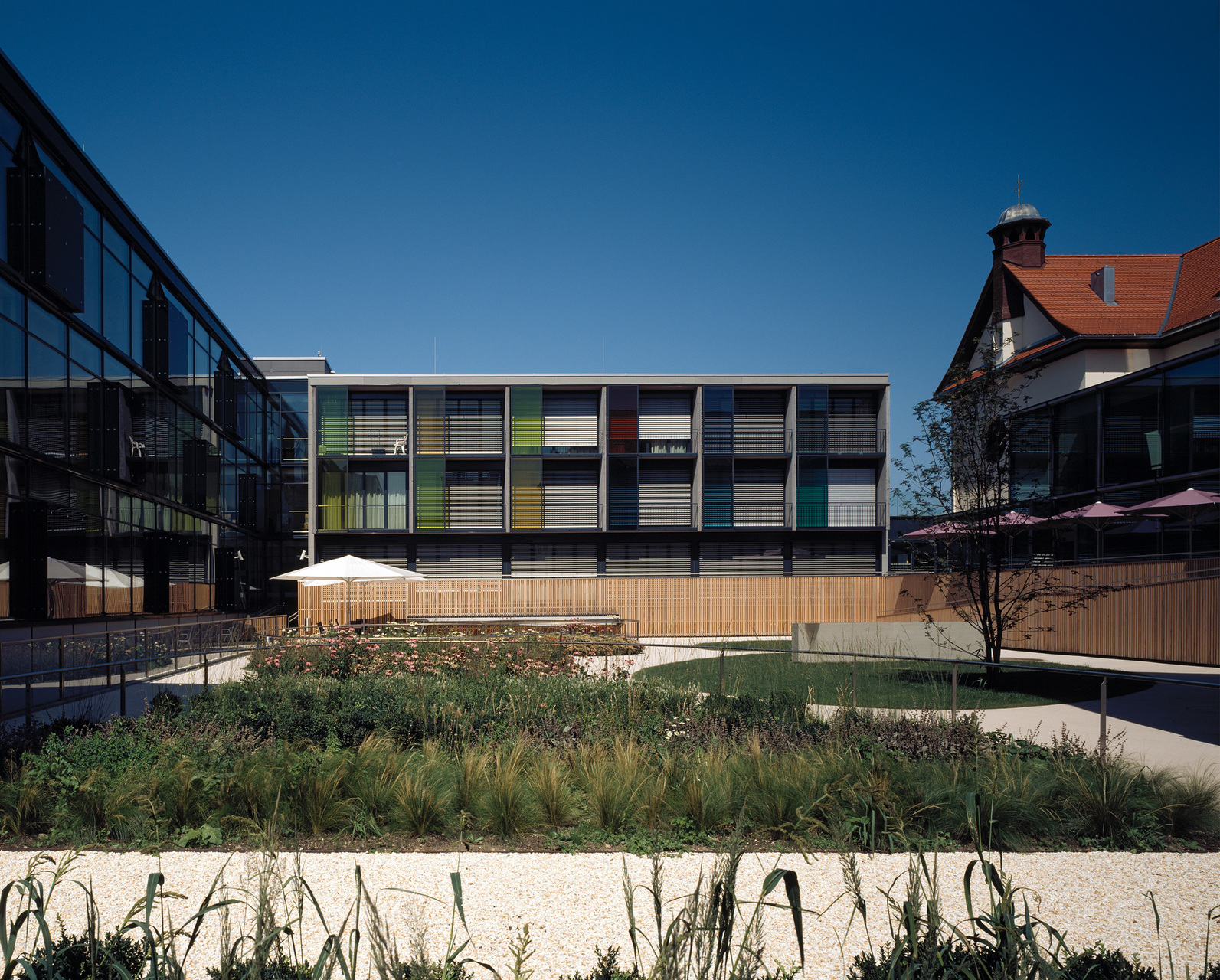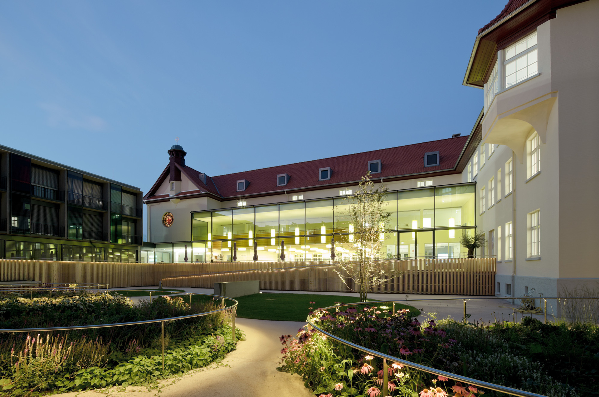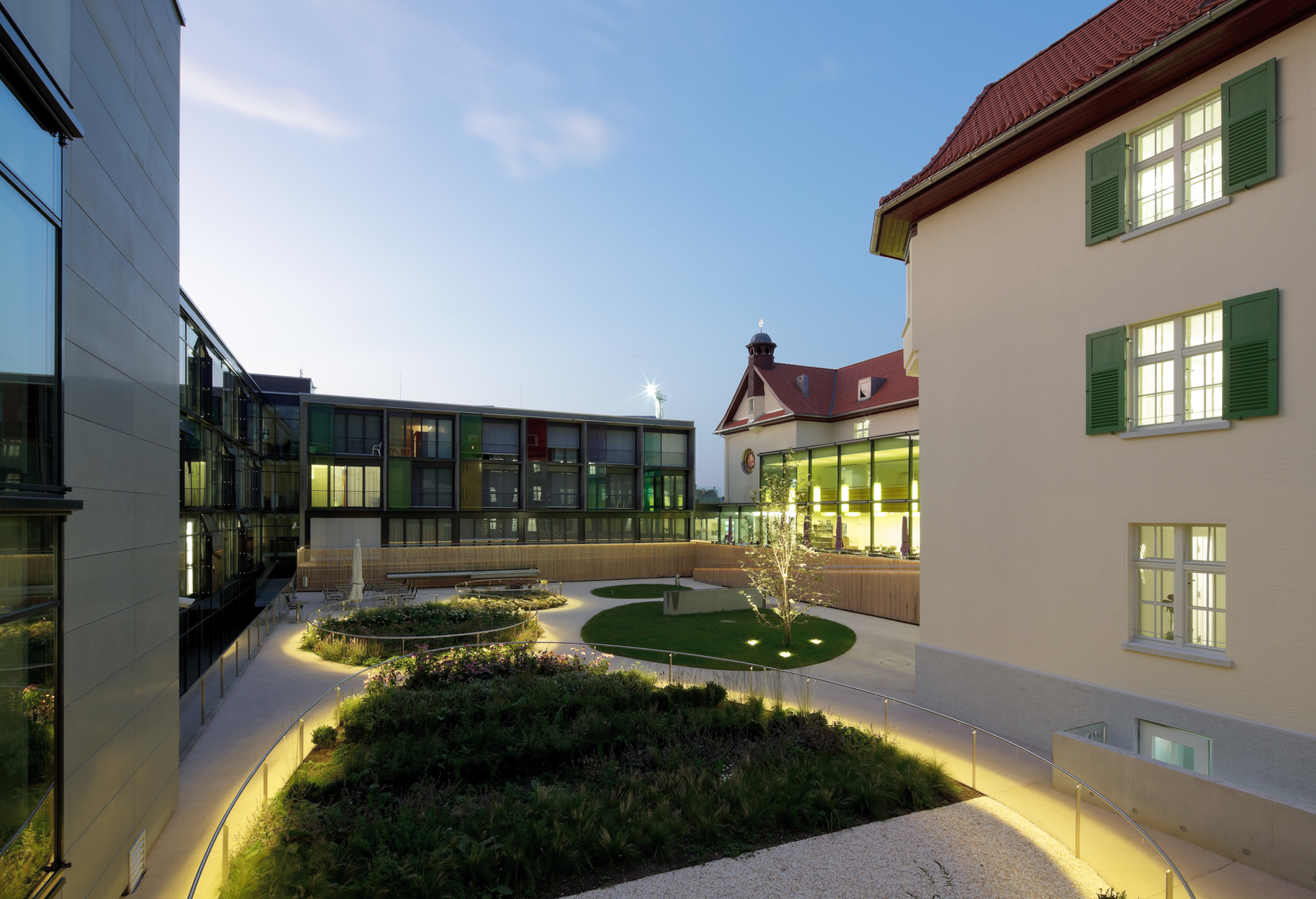 Die inselartige Auflösung der Grünflächen folgt Gehlinien, die besonders auf die Bedürfnisse der Demenzkranken abgestimmt sind. Als Kontrast zur weichen Grundrissgestaltung wurden lineare Pflanzenbänder und architektonische Einbauelemente eingefügt. Die Bepflanzung der Flächen erzeugt unterschiedliche Charaktere und bietet so jahreszeitliche Abwechslung. Beleuchtungslinien folgen wie Bänder den Inseln und zaubern so nachts und im Winter ein bildhaftes Licht im Hof. (Text: Barbara Bacher)