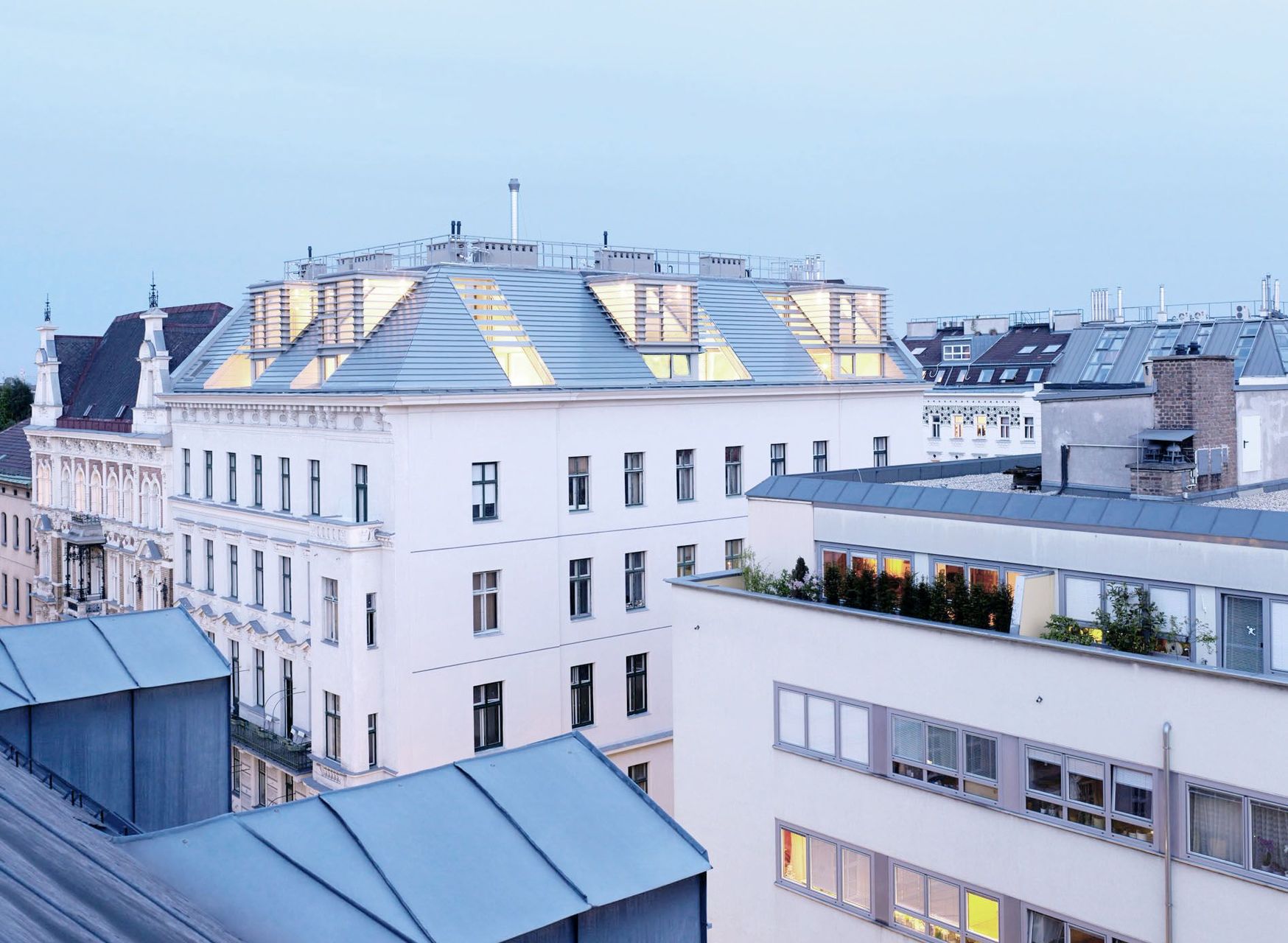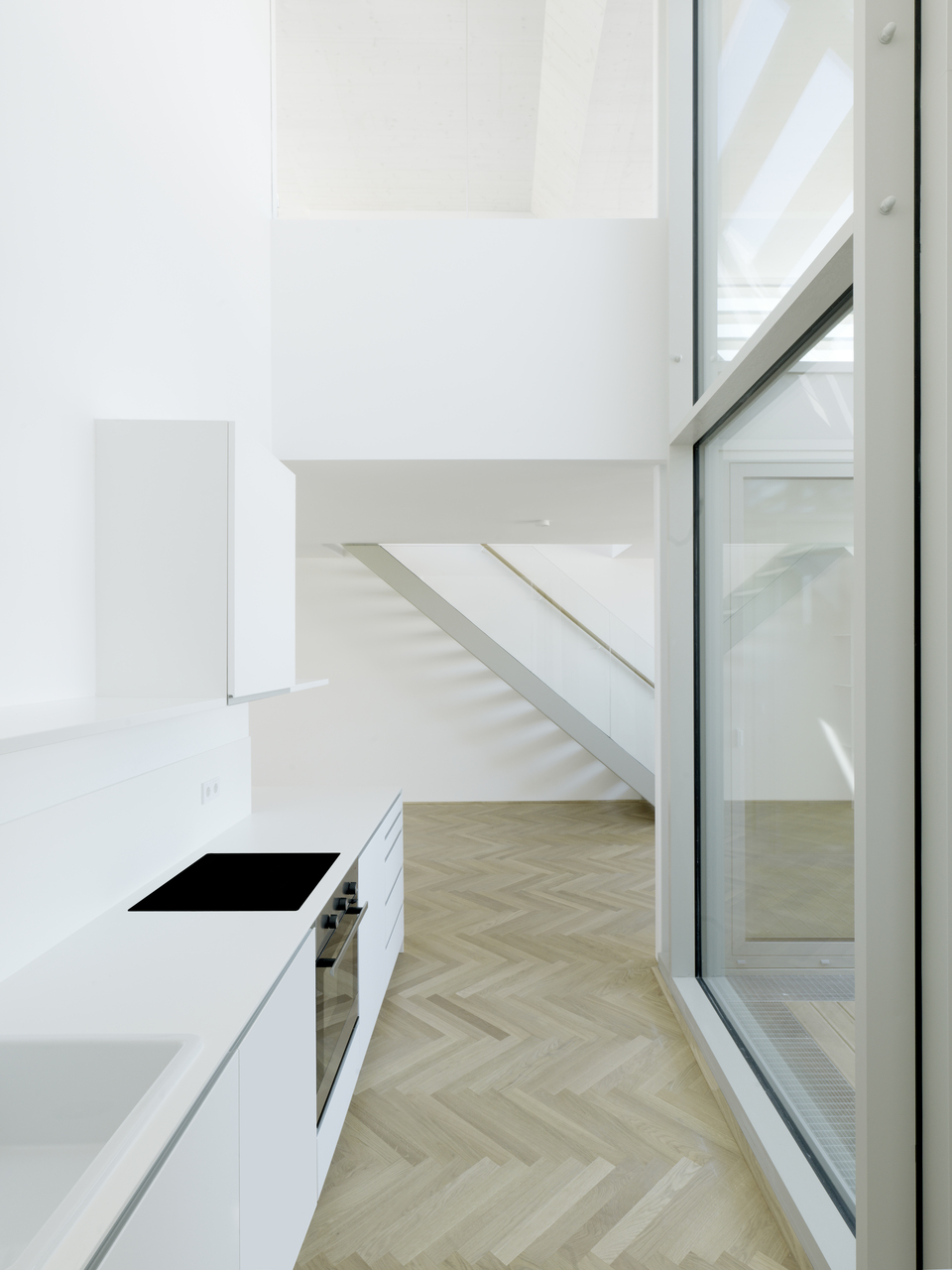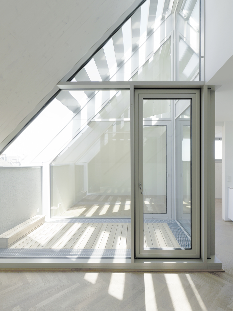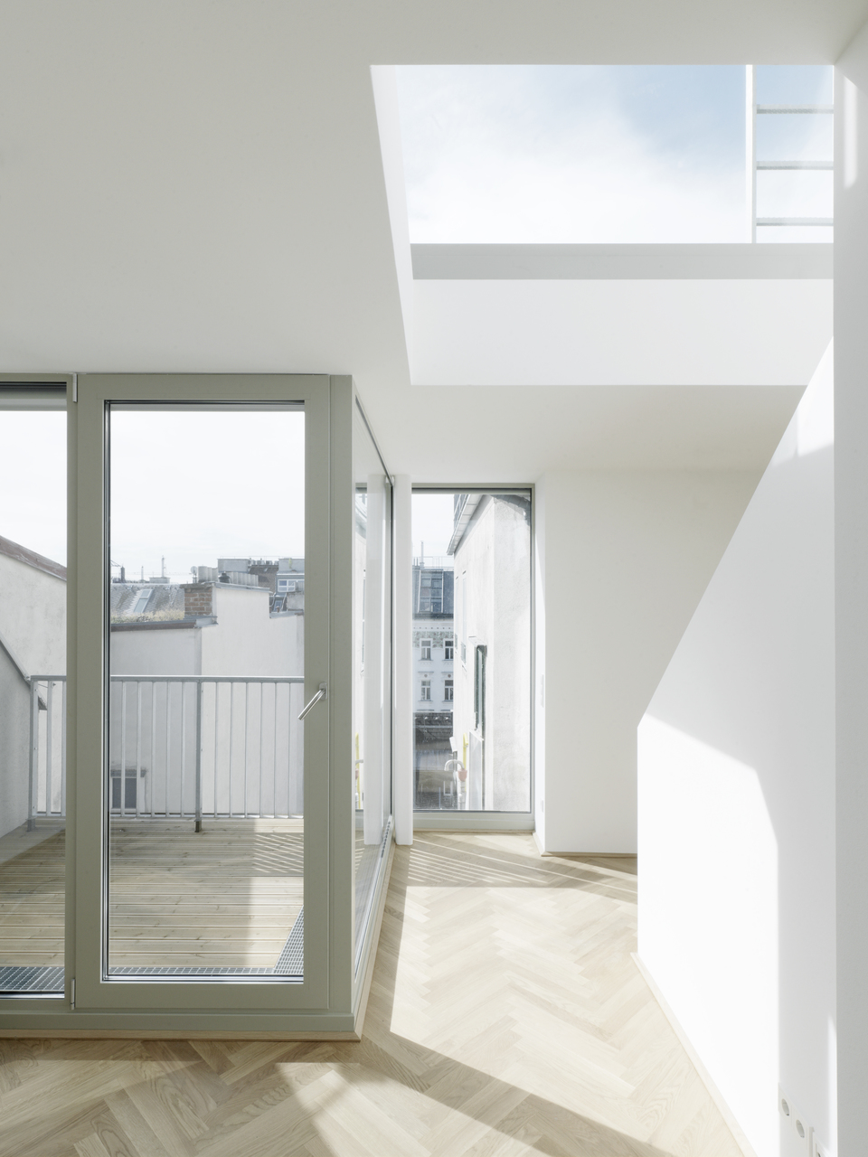 Holz hat in Wien Tradition. Neben den Tramdecken, bildet der hölzerne Dachraum einen luftigen Abschluss zahlreicher Häuser aus der Gründerzeit. Die typischen räumlichen Qualitäten des Dachraumes, das Gefühl „ganz oben“ zu sein, wurden in ein Konzept übersetzt und die Konstruktion als Referenz zum alten Dachstuhl in Holz konzipiert.Die zwischen 50 und 90 m² großen Mietwohnungen wurden als zonierter „Einraum“ über zwei Ebenen konzipiert. Großzügige Lufträume interpretieren den Dachraum neu und bieten vielfältige räumliche Beziehungen innerhalb jeder Wohneinheit. Straßenseitig eingeschnittene Terrassen und die räumlichen Vorgaben des Bestandes (Kamine, Mittelwand...) strukturieren die einzelnen Wohnungen und sorgen für individuelle Wohnqualitäten in jeder Einheit.