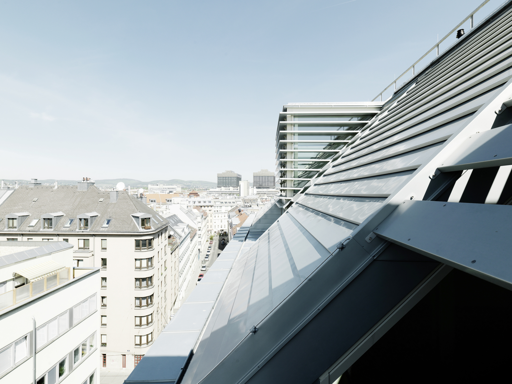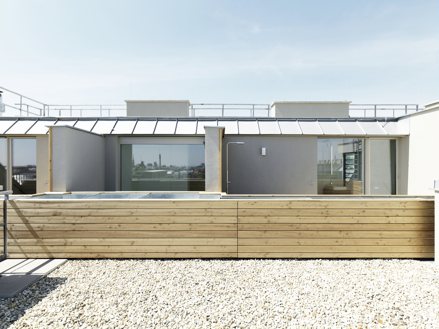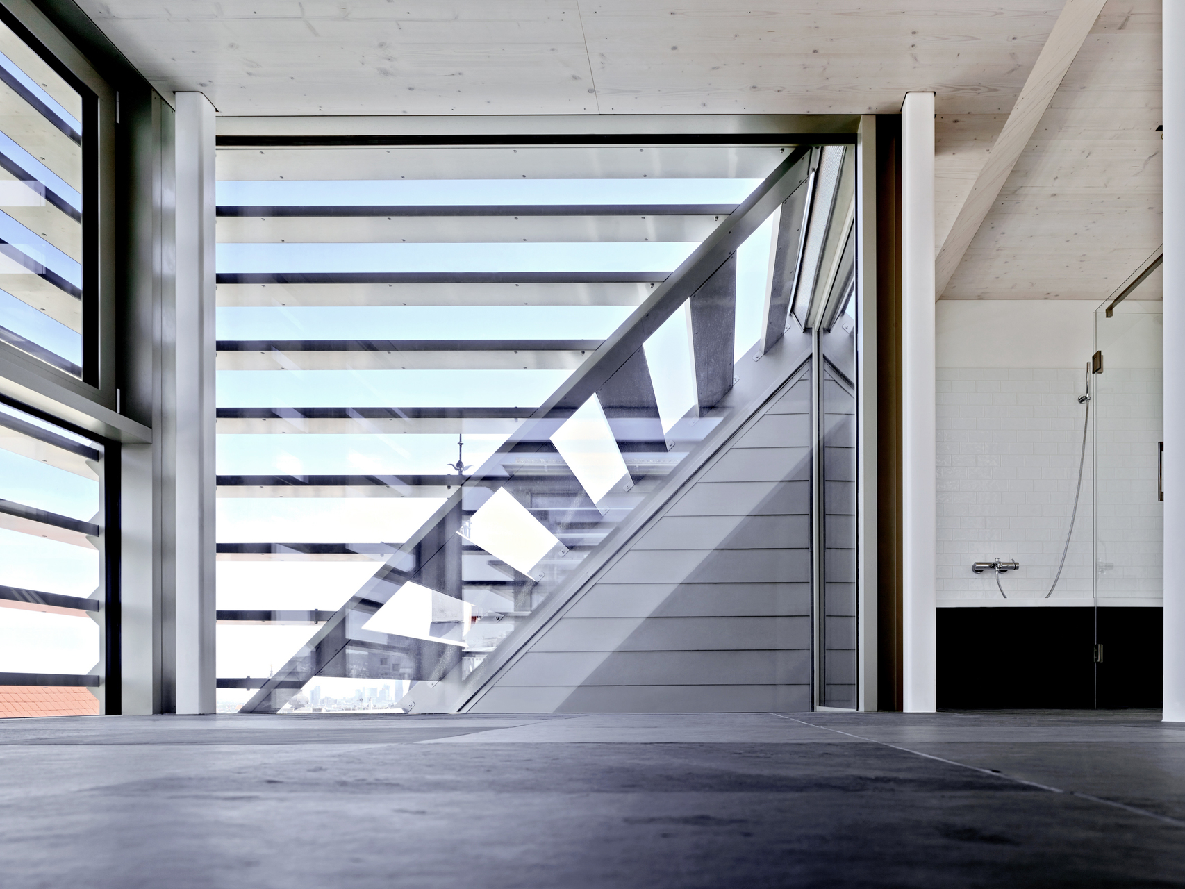 Im oberen Teil der Maisonetten bieten „Schlafgaupen“ spannende Blicke in den Nachthimmel, während die privaten Nassräume jeweils den südseitigen Terrassen zugeordnet sind. Schrägverglasungen konnten durch die Setzung zusammenhängender Dachelemente, bestehend aus Gaupe, Einschnitt und Fensterband, zur Gänze vermieden werden. Geschuppte Metallbänder interpretieren das Ziegeldach neu und werden in den verglasten Bereichen als Lamelle aufgebrochen. (Sonnen- bzw. Sichtschutz)