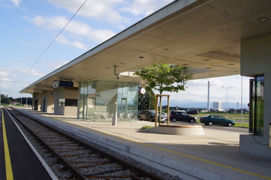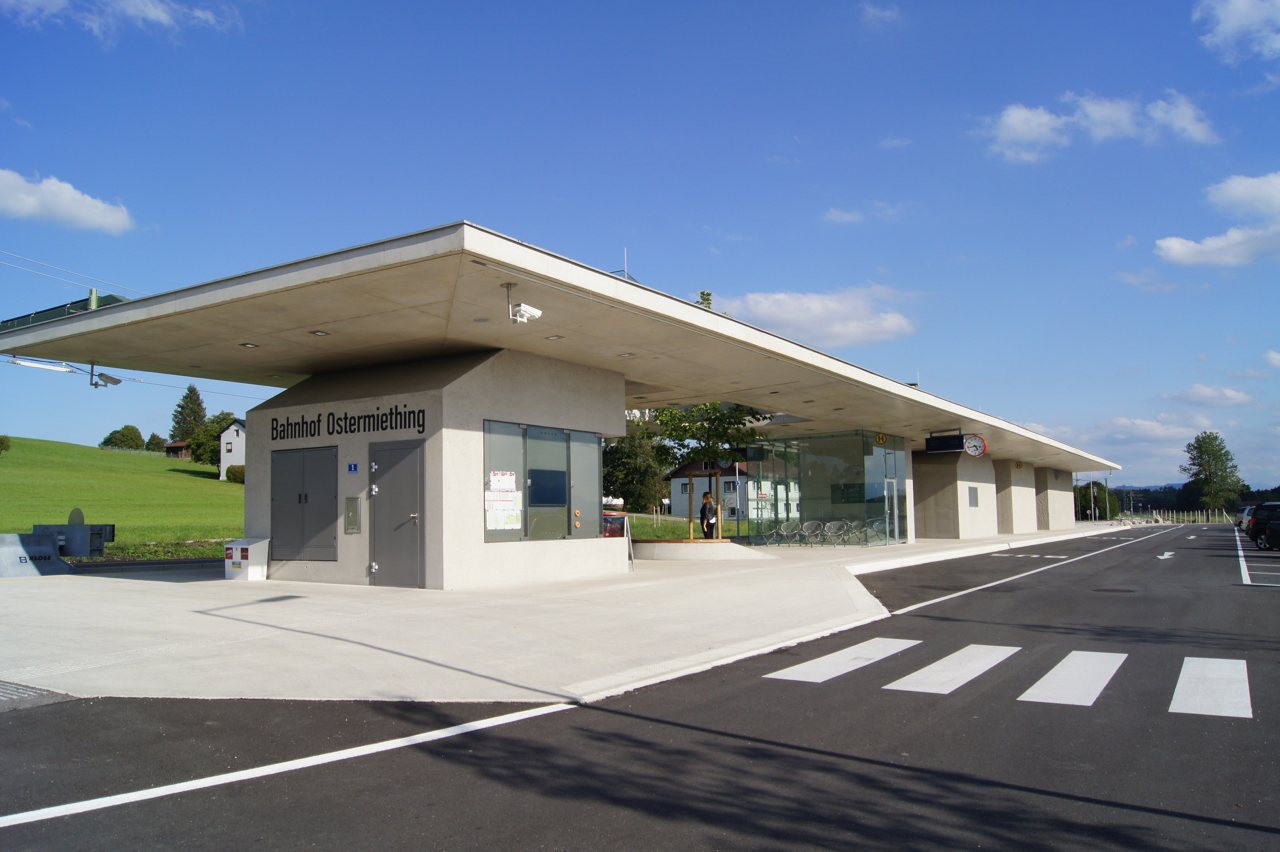 Nur wenige Kilometer entfernt, in der unmittelbar an der Grenze zu Deutschland gelegenen Marktgemeinde Ostermiething ist ein weiteres Beispiel zeitgenössischer Architektur zu sehen, das sich den Charakter des Betons in ähnlicher Intensität, jedoch auf ganz andere Weise zunutze macht. Die Salzburger Lokalbahnen, die für den vom Salzburger Büro Udo Heinrich Architekten entwickelten Lokalbahnhof Lamprechtshausen mit dem Bauherrenpreis 2012 der ZV geehrt wurden, haben Udo Heinrich Architekten als Gewinner eines geladenen Architekturwettbewerbes ein weiteres Mal mit der Errichtung eines Stationsgebäudes beauftragt, diesmal am Ende ihrer neuen, nach Ostermiething verlängerten Strecke. Während das kühne Flugdach in Handenberg die verblüffenden konstruktiven Möglichkeiten des Stahlbetons und sein Potenzial zur „reinen“ Geometrie in den Vordergrund stellt, betont das Stationsgebäude in Ostermiething den Gesteinscharakter des Baustoffes. Seine aus Beton gegossene Plattform und ihre von fünf Pavillons getragene Überdachung lassen an Gebirge und Felsen denken. Die ihren Nutzungen entsprechend unterschiedlich ausgeformten Pavillons falten sich zu einer Landschaft von Graten und Giebeln, in die das schlanke Bahnsteigdach aus Stahlbeton seinen beruhigenden Horizont legt.