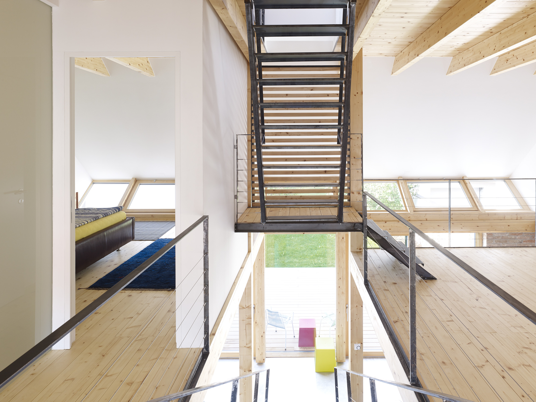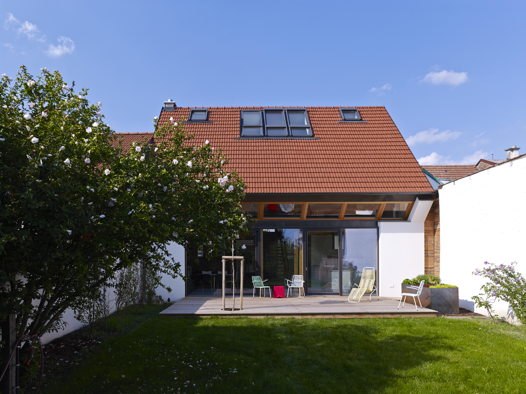 Ziel des Haustechnikkonzeptes war, möglichst einfache, aber gleichzeitig komfortable und technische Lösungen zu finden. Die Wärmeversorgung erfolgt über ein bestehendes Gasbrennwertgerät vom Nachbarhaus und einen Scheitholzofen im Wohnbereich. Verteilt wird die Wärme über eine angenehme Niedertemperatur-Fußboden-Wand- bzw. Deckenheizung. Ganz bewusst wurde auf den Einbau einer kontrollierten Zu- und Abluft verzichtet. Stattdessen ermöglichen sogenannte „Klimaluken“, als kleine Lüftungsflügel in Kombination mit Velux Dachflächenfenstern in der Fassade eingeplant, ein schnelles und zugfreies Querlüften. Komfortabel und sicher wird das System durch die intelligente Steuerung, die sowohl manuell als auch automatisch mit Co2 Sensoren erfolgen kann. In den Nachtstunden des Hochsommers sorgt das „Natural Ventilation Cooling“ für kühle Luftströmung und temperiert damit das Gebäude. Ein Monitoring über die Dauer eines Jahres ergab sowohl im Winter als auch im Sommer sehr ausgeglichene und angenehme Raumtemperaturen bei minimalen Investitions- und Betriebskosten. Auch der Außenraum ist Teil des Gesamtkonzeptes – mit Baumsetzungen und Bepflanzung entsteht nicht nur ein Ortsbezug, sondern auch ein spezielles und angenehmes Mikroklima.