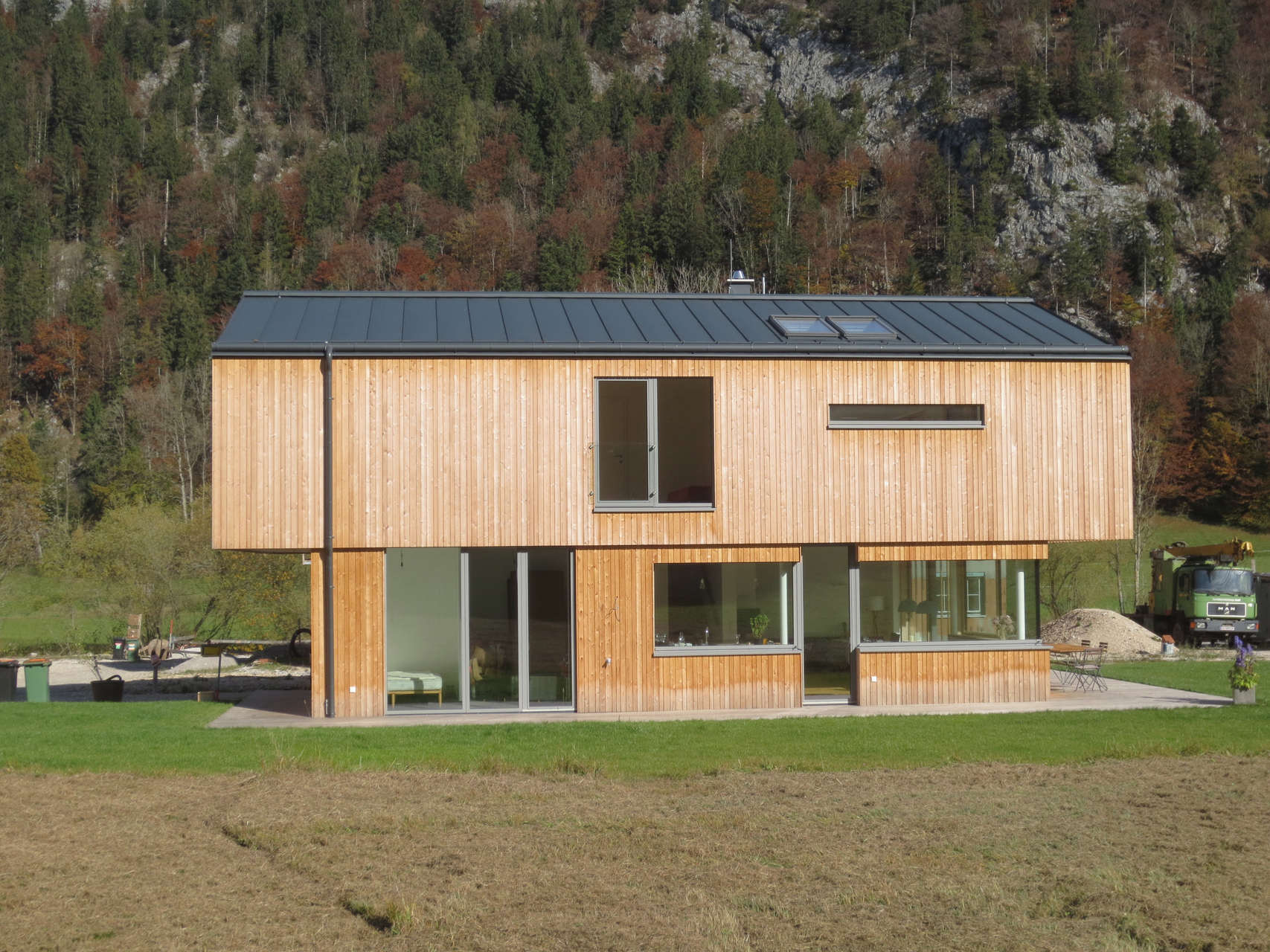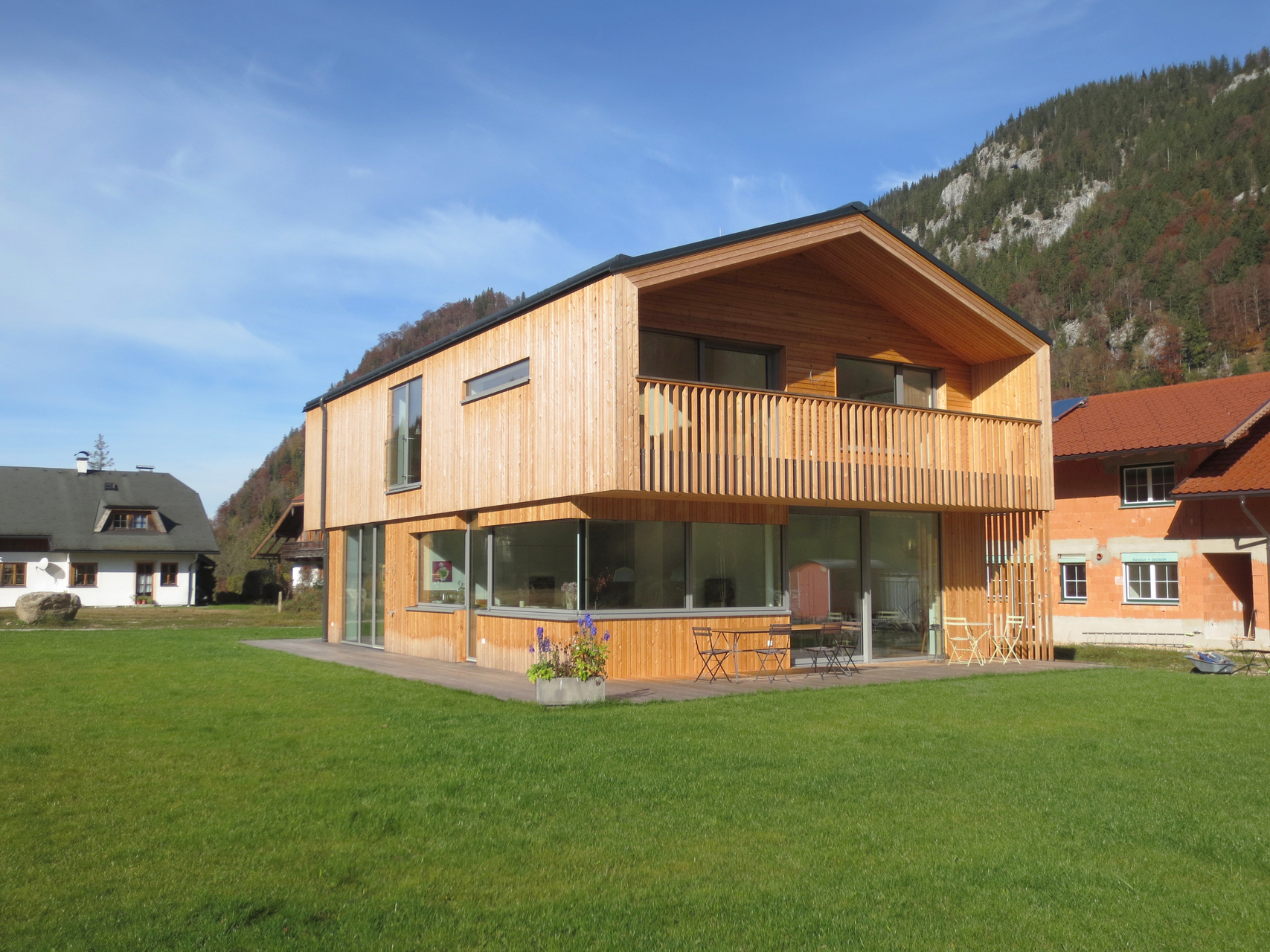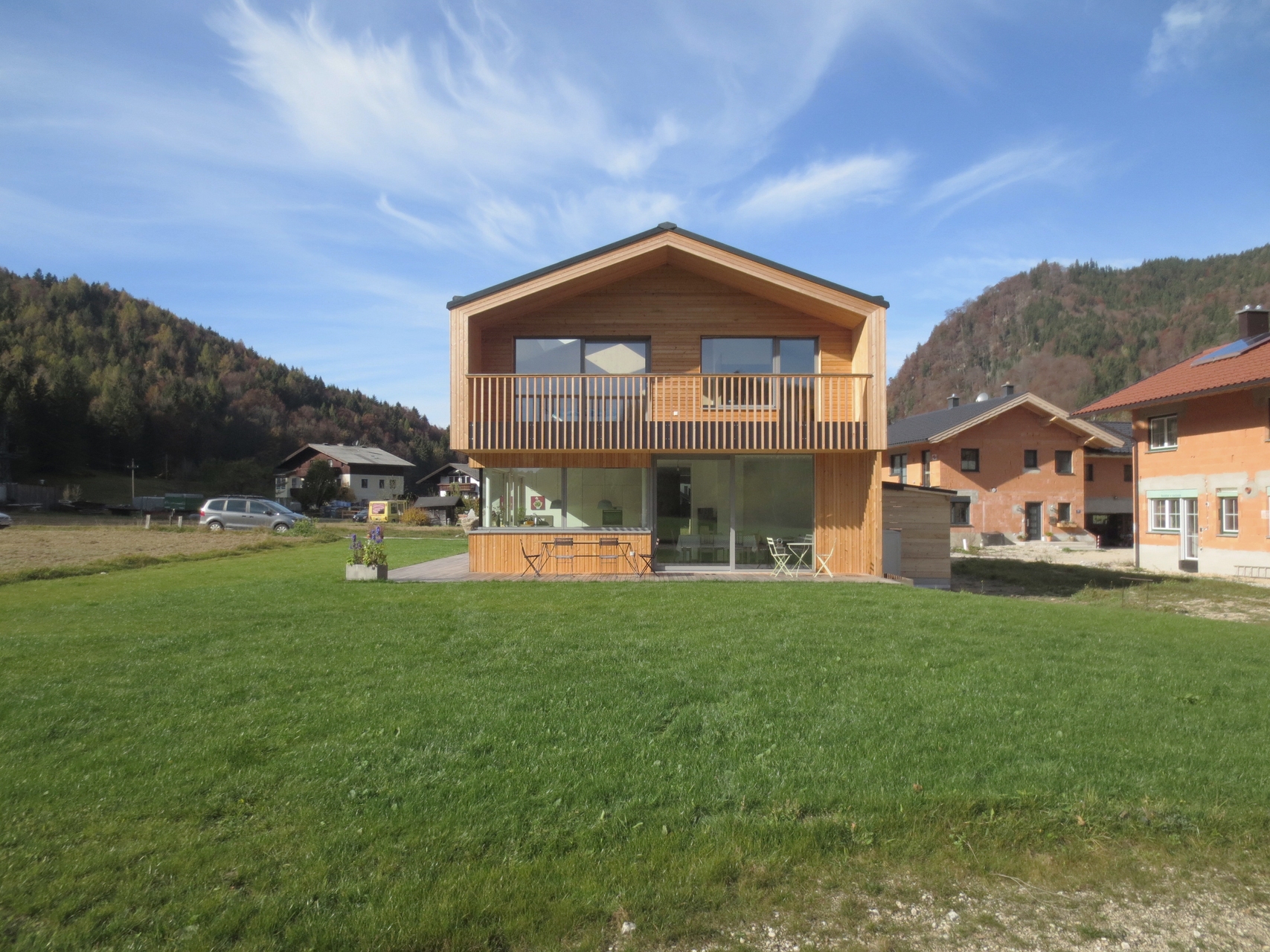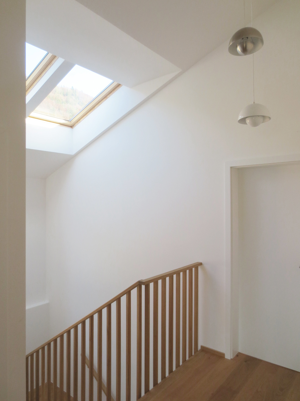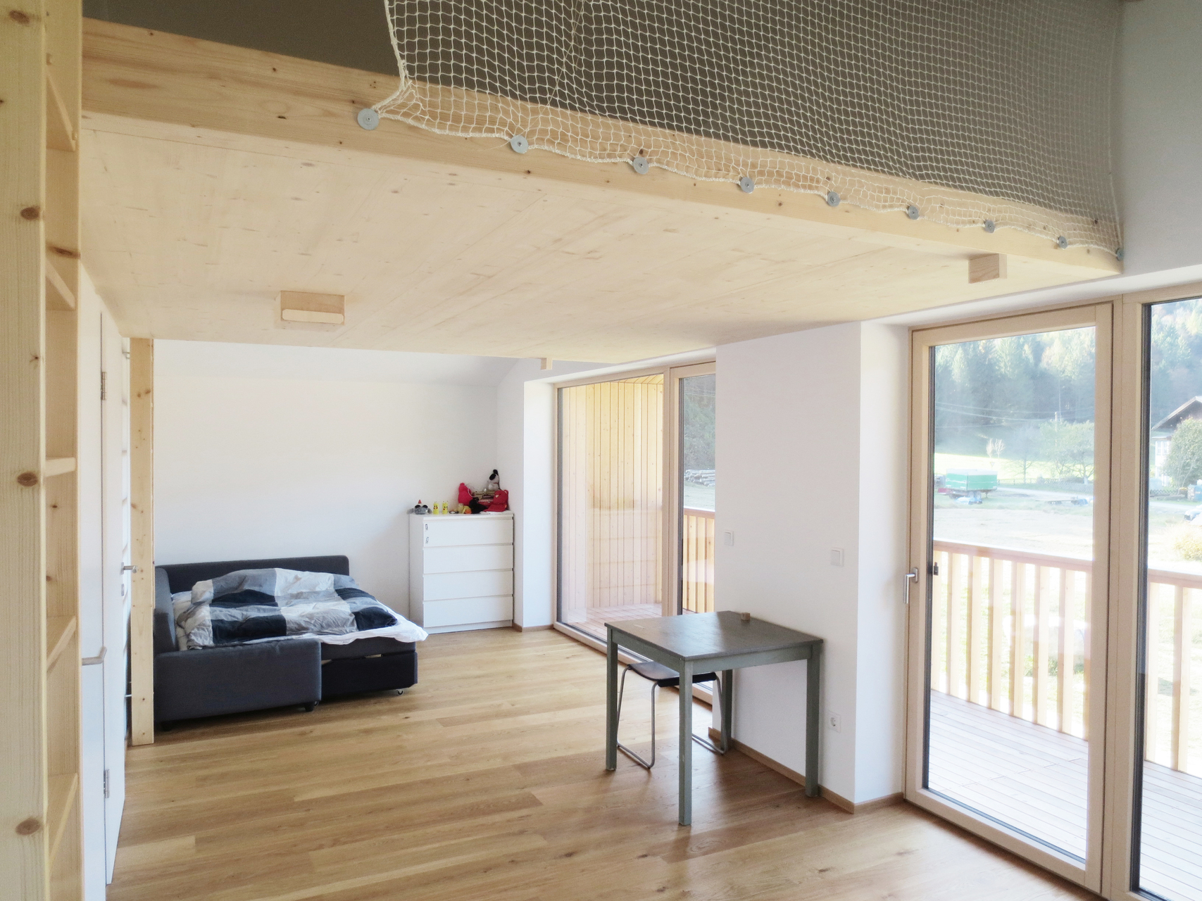 An beiden Enden des längsrechteckigen Gebäudes wurden im Obergeschoß jeweils Räume über die gesamte Gebäudebreite angeordnet. Die in diesen Räumen spürbare Dachform wurde im Außenbereich verlängert. Dadurch entstehen ost- und westseitig wettergeschützte Balkone welche wiederrum im Erdgeschoß an der Ostseite einen geschützten Außenraum vor dem Wohnzimmer und an der Westseite einen überdachten Eingangsbereich generieren. Im westseitigen Zimmer im Obergeschoß wurde zusätzlich eine Spiel- bzw. Schlafgalerie eingezogen. Dieses derzeit von den beiden Buben benutzte Zimmer kann zu einem späteren Zeitpunkt mit einer Mittelwand versehen werden.