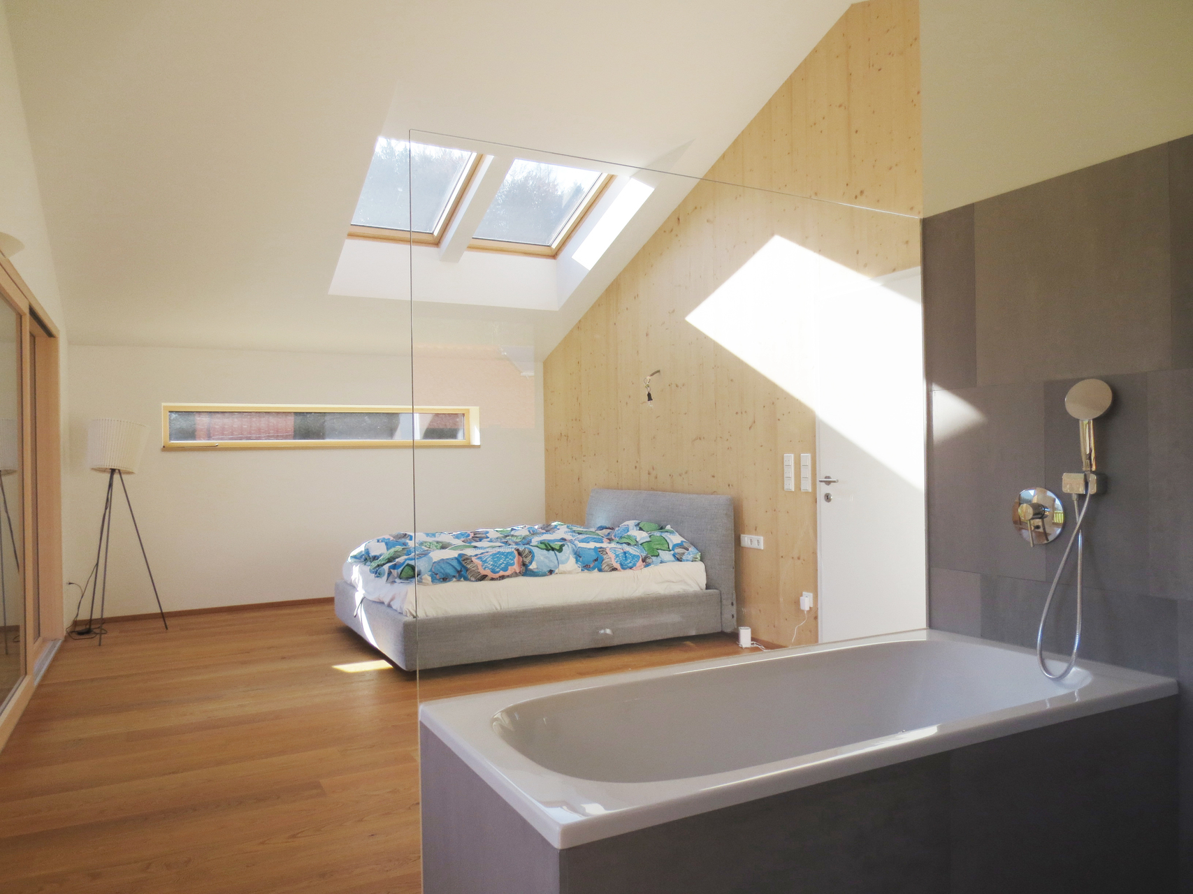 Im Obergeschoß liegen die Kinderzimmer, ein Kinderbad, und der Elternbereich mit einem direkt angeschlossenen Badezimmer welches nur durch eine Glasscheibe abgetrennt ist.