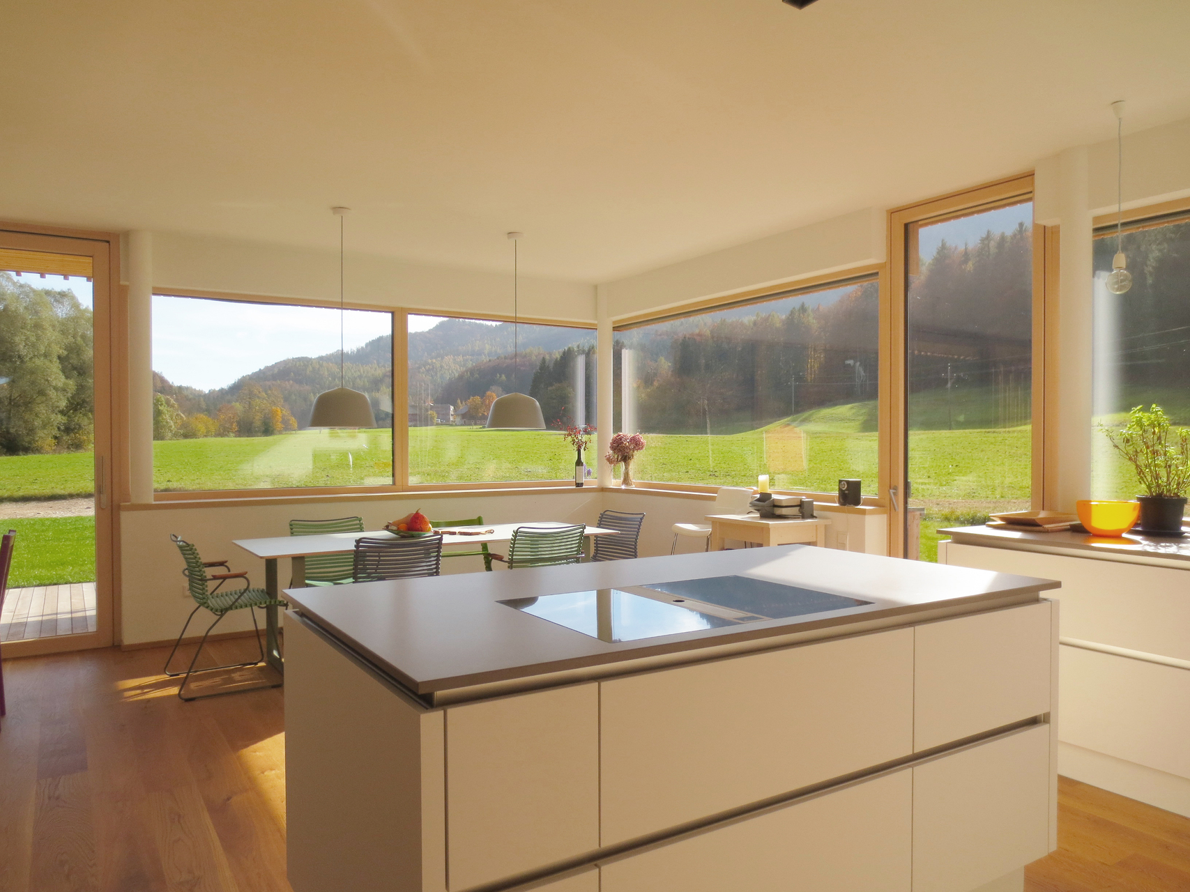 Beheizt wird das hochwärmegedämmte Haus mittels einer Luft-Wärme-Pumpe und Fußbodenheizung. (Text: Architekt)