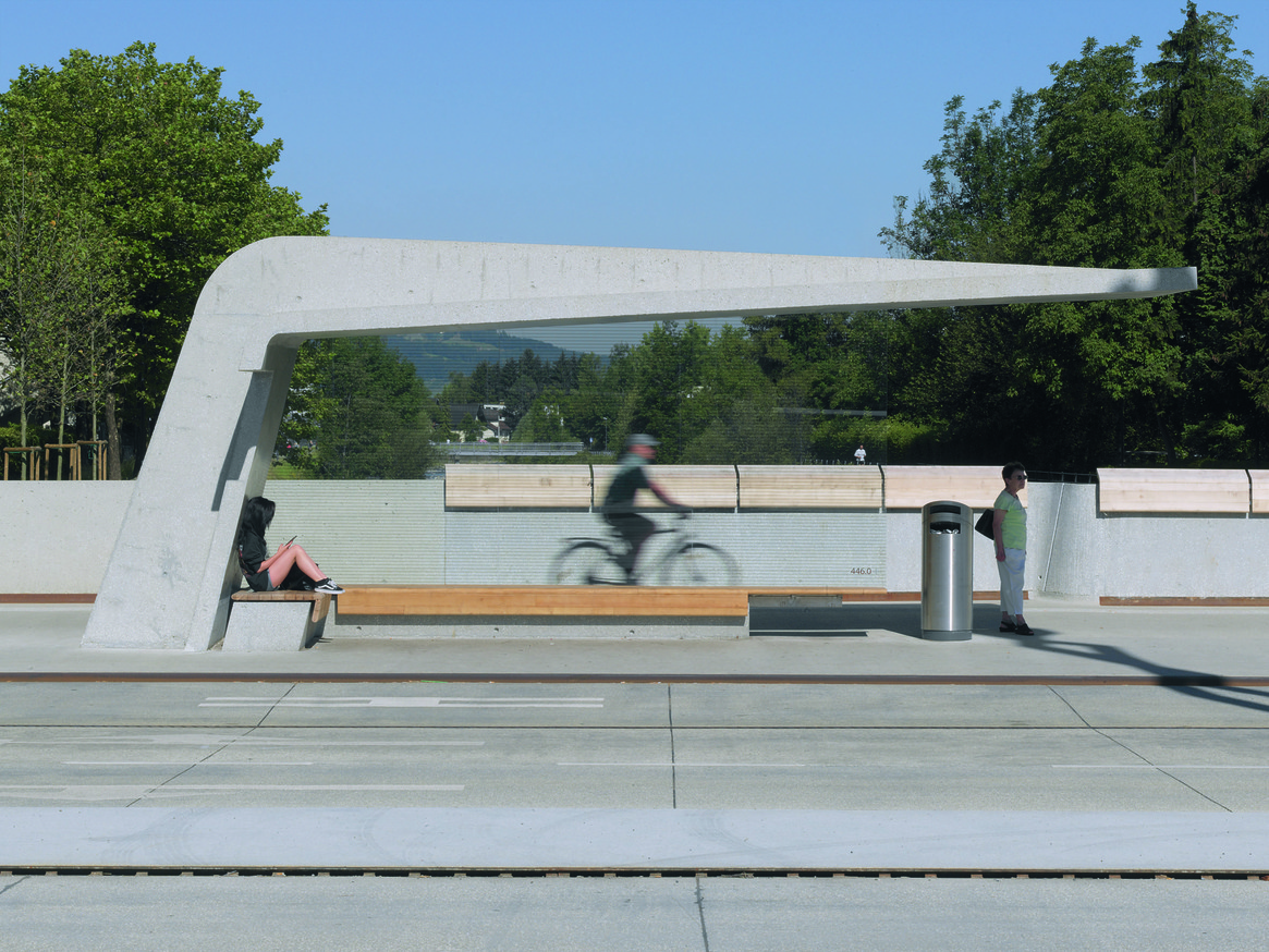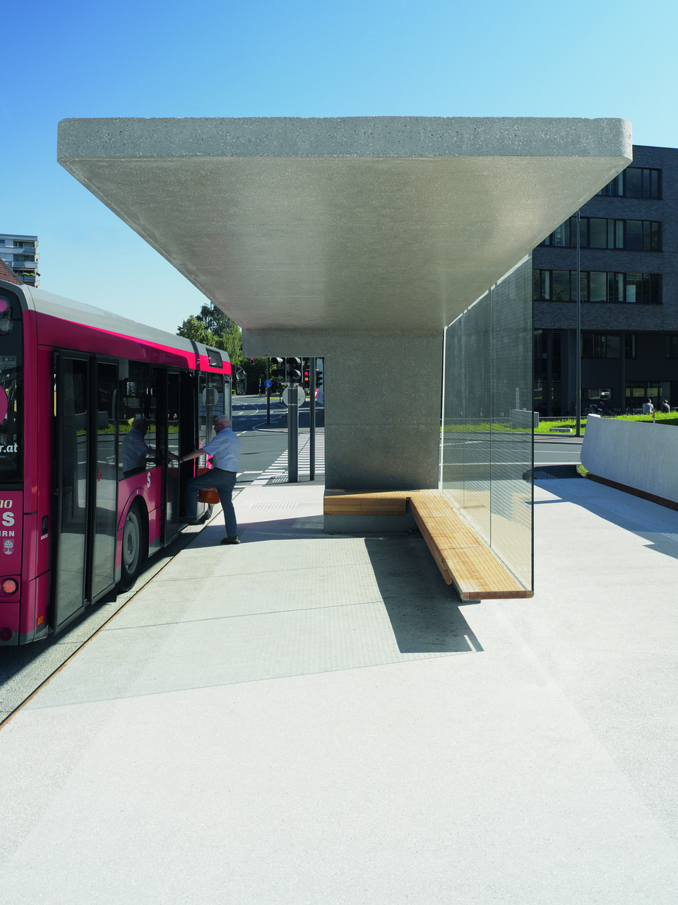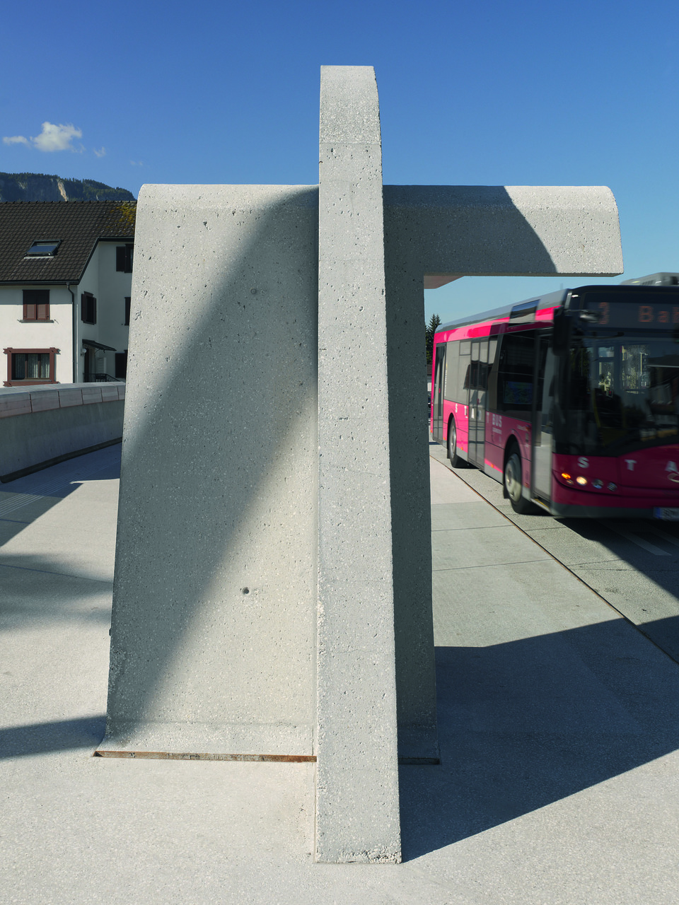 Die Materialvorgabe für den Brückenunterbau wurde konsequent weitergedacht und auf das gesamte Bauwerk angewandt: Wie aus einem Guss formt Beton Fahrbahn, Fahrrad- und Fußgängerbereich. An den Rändern hochgezogen wird er zur Brüstung, aus der Grundfläche herausgeschält zu überdachenden Haltestellen. Vier unterschiedliche Bearbeitungen der Oberfläche reagieren auf funktionelle und räumliche Ansprüche: gestockt auf der Autofahrbahn, sandgestrahlt im Fußgänger- und Fahrradsektor, geschliffen im Haltestellenbereich und poliert an der Dachunterseite der Bushaltestellen zur Reflexion der künstlichen Beleuchtung. (Text: Tobias Hagleitner nach einem Text der Architekten)
