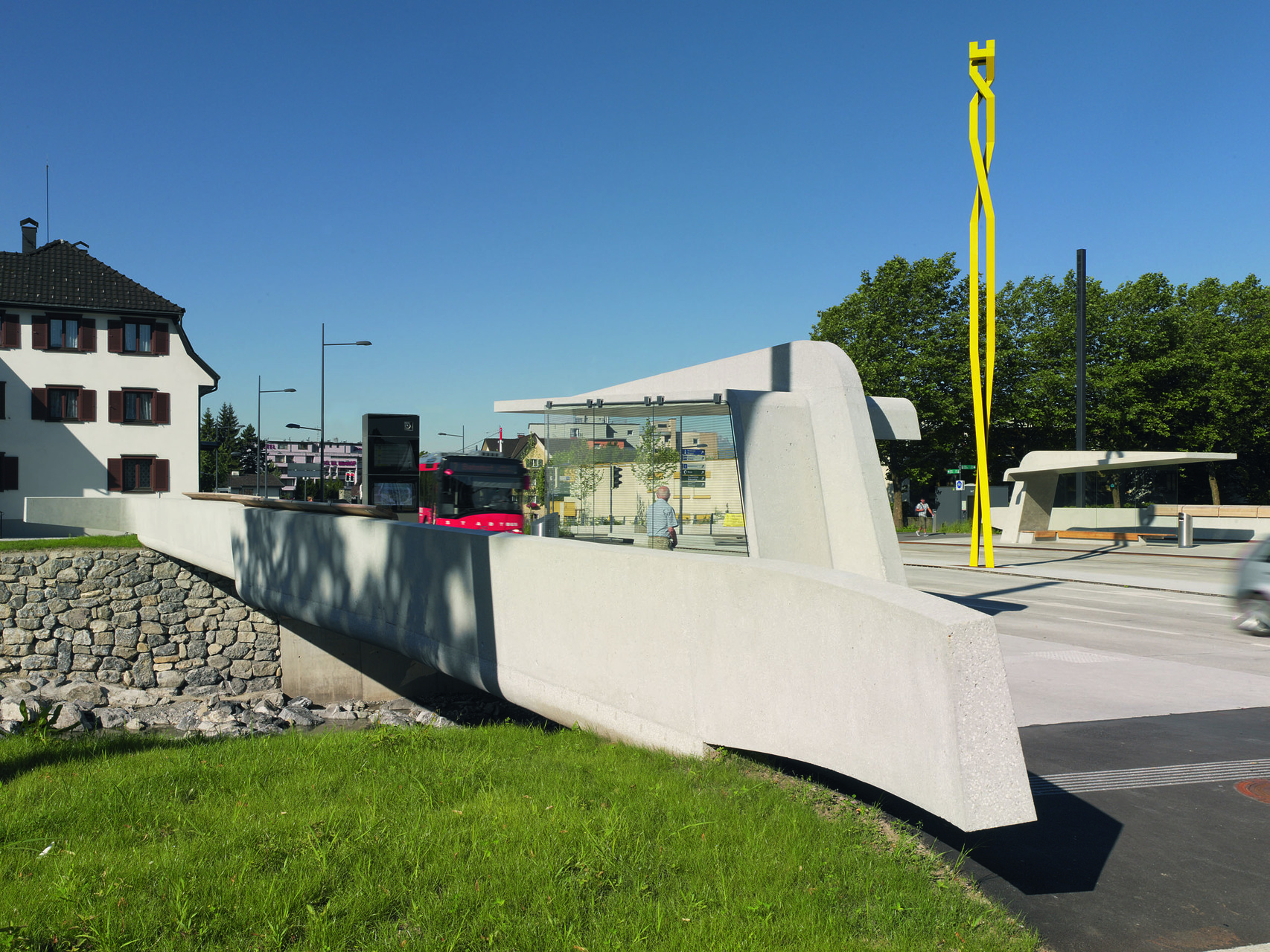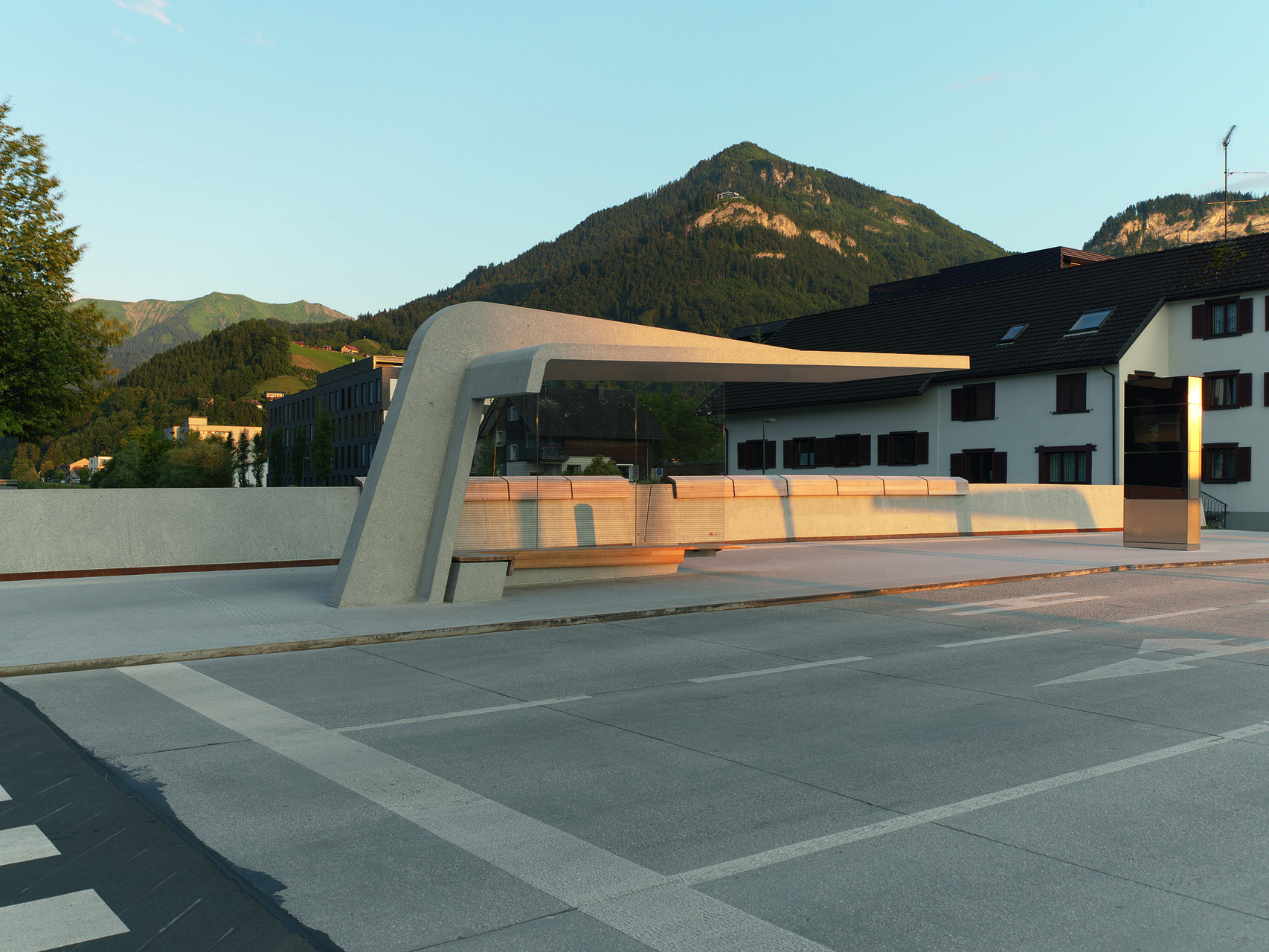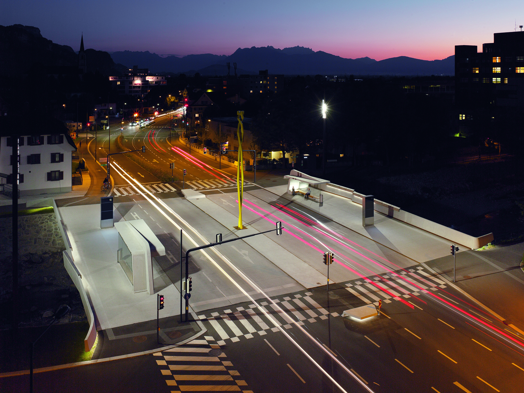 Die Materialvorgabe für den Brückenunterbau wurde konsequent weitergedacht und auf das gesamte Bauwerk angewandt: Wie aus einem Guss formt Beton Fahrbahn, Fahrrad- und Fußgängerbereich. An den Rändern hochgezogen wird er zur Brüstung, aus der Grundfläche herausgeschält zu überdachenden Haltestellen. Vier unterschiedliche Bearbeitungen der Oberfläche reagieren auf funktionelle und räumliche Ansprüche: gestockt auf der Autofahrbahn, sandgestrahlt im Fußgänger- und Fahrradsektor, geschliffen im Haltestellenbereich und poliert an der Dachunterseite der Bushaltestellen zur Reflexion der künstlichen Beleuchtung. (Text: Tobias Hagleitner nach einem Text der Architekten)