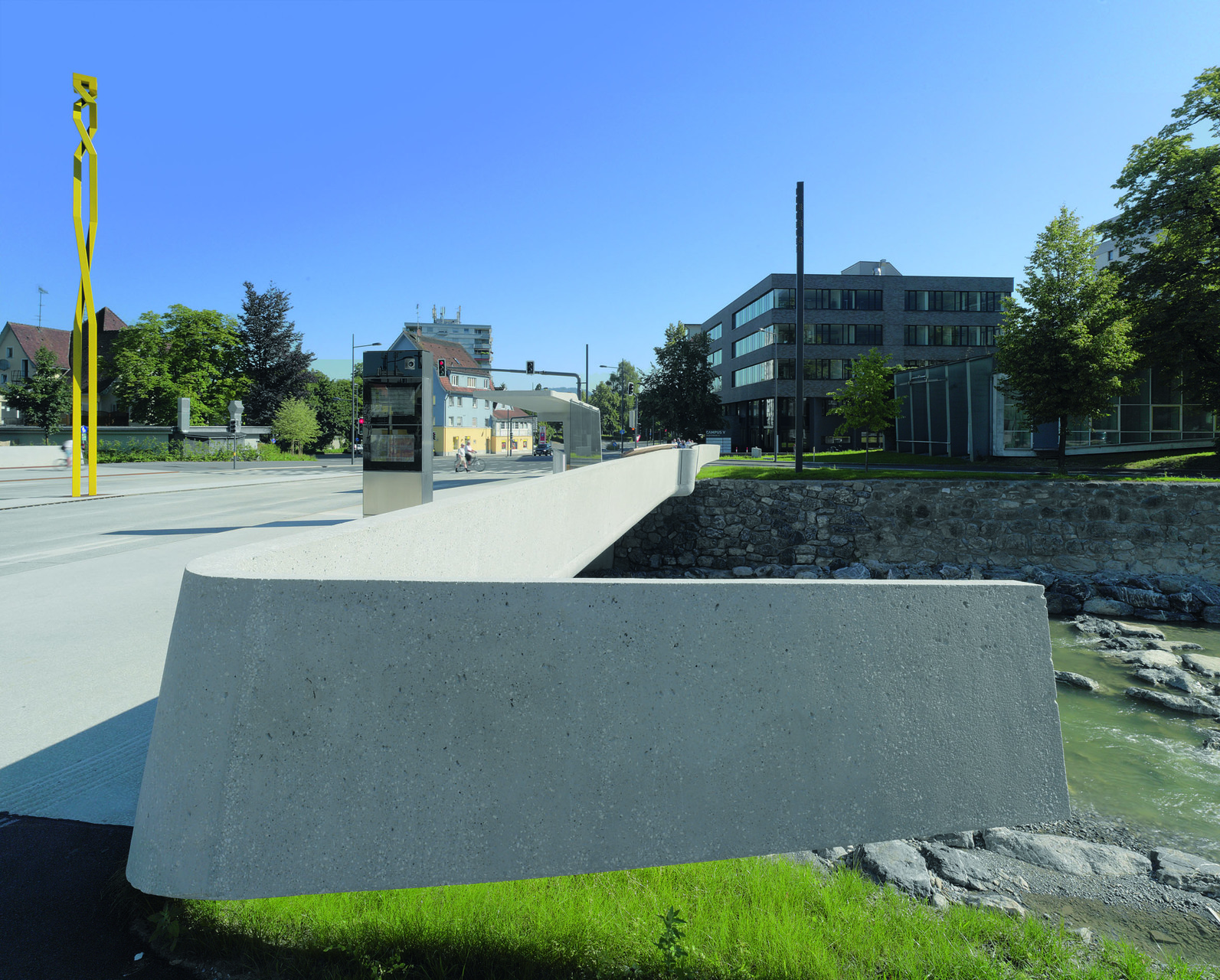 Mit dem Neubau der Brücke haben die Architekten bewusst einen Ort zum Verweilen, eine „Brücke als Platz“ entworfen. Sie ist um einige Meter breiter als lang. Niveauunterschiede zwischen Fahrbahn, Mittelstreifen, Fußgängerbereich wurden minimiert. Hölzerne Lehnen entlang der Brüstung dienen als Wartebänke, Nischen ermöglichen den Rückzug aus den befahrenen Bereichen. Für die „Mitte“ des Baukörpers wurde vom Künstler Hubert Lampert eine Skulptur geschaffen, die auf die kinetische Energie des Ortes reagiert.