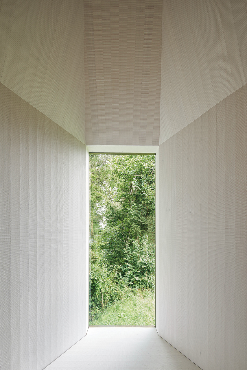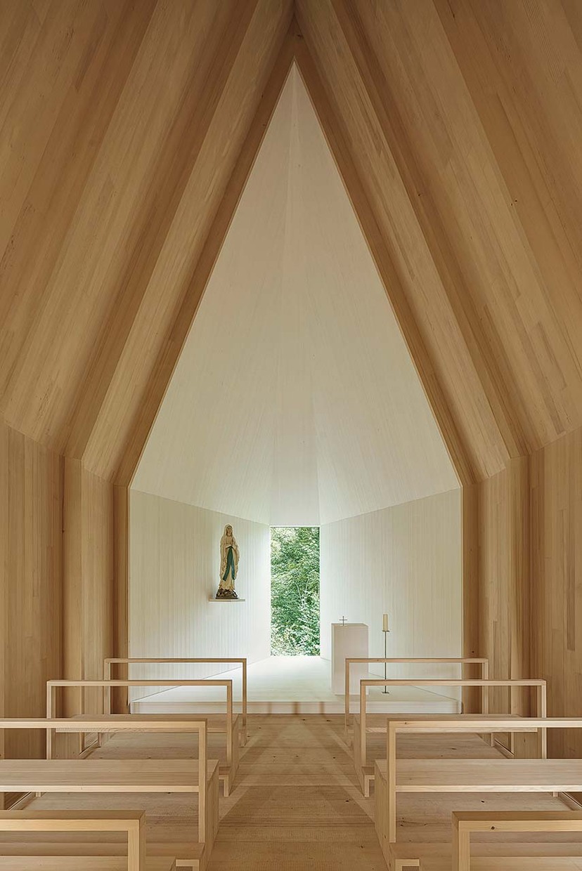 Die Kapelle wird über den geschützten Vorbereich des Portaleinschnitts im Südwesten betreten. Hinter der Eingangstür aus gehämmertem, brüniertem Messing öffnet sich der helle Gemeinderaum, der über das raumhohe Fensterrechteck in der Apsis frontal belichtet wird. Auskleidungen und Bänke sind aus unbehandelter Weißtanne. Die Marienstatue – wie die Glocke restauriertes Kunsthandwerk aus dem Vorgängerbau – wurde im Neubau seitlich angeordnet. So bleibt der Blick nach vorne durch den weiß gekalkten Madonnenraum frei und führt direkt hinaus in die Natur. (Text: Tobias Hagleitner nach einem Text der Architekten)