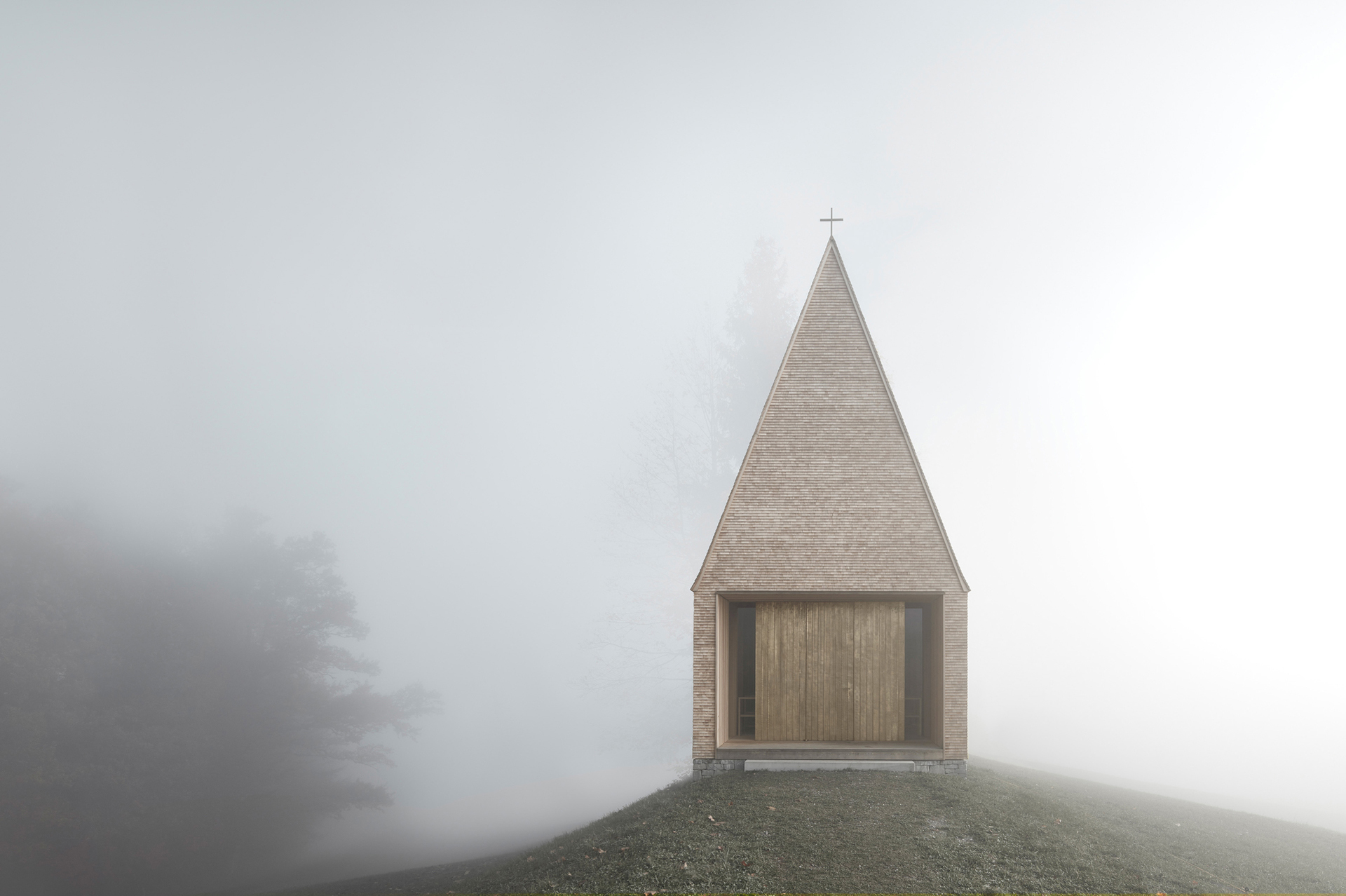 Das Bauwerk wächst aus der Tradition einer historischen Ordnung heraus, welche viele Ortsbilder im Bregenzerwald prägt. Über dem Sockel aus Stein ruht die Konstruktion aus Holz, deren Schindelkleid aus feinjähriger, wintergeschlagener Lärche nach und nach verdunkeln wird wie die alten Bauernhäuser der Region. Die einfache Grundform aus Hauptschiff und Apsis beruht auf annähernd gleichem Grundriss und ähnlichen Außenmaßen wie der Bestand. Konstruiert aus steil aufragenden Spanten, die mit 6 cm starken Holztafeln zum gefalteten Flächentragwerk geschlossen wurden, hebt sich das Gebäude signifikant vom Gelände ab.