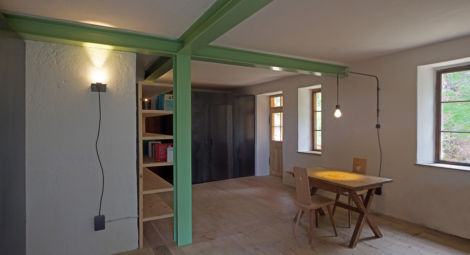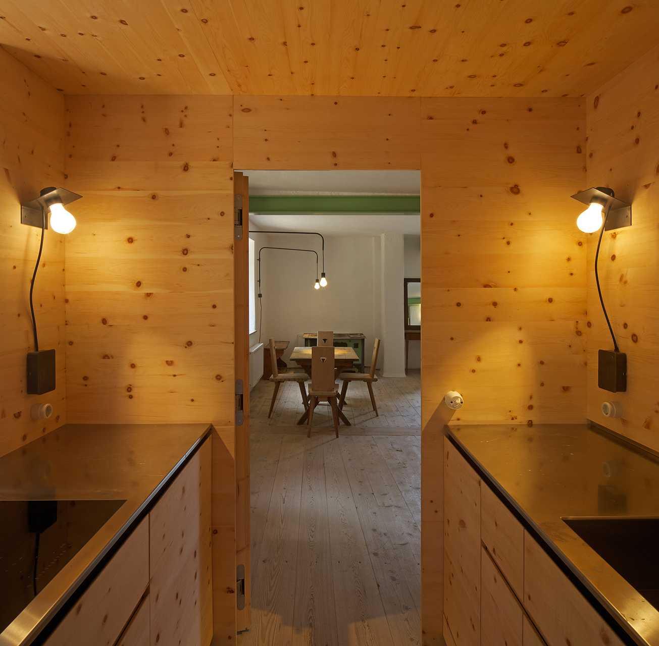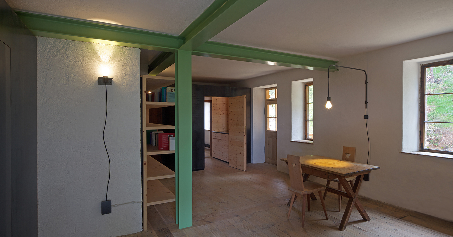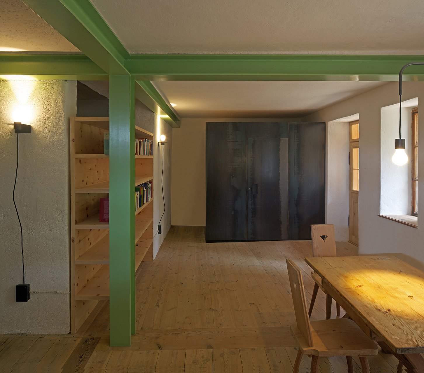 Mit Bedacht wurden die Innenräume saniert, Möbel und Kassettendecken beibehalten und Injektionen im Bestand vorsichtig vorgenommen. Über einen gemeinsamen Aufenthaltsraum mit Bibliothek und Holzofen betritt man die jeweils zwei Einheiten im Erdgeschoß und ersten Stock. Die statische Struktur bleibt sichtbar und wird mit den zwei grün lackierten I-Trägern zum gestalterischen Element. Zwei kleine Küchen-Boxen fungieren auch als Zugang zu den Wohneinheiten mit je zwei Zimmern und Bad. Die Details von Vorhandenem und Neuem sind sorgfältig herausgearbeitet. Für alle Wohnungen gibt es einen Balkon und den herrlichen Ausblick auf die Dolomiten.