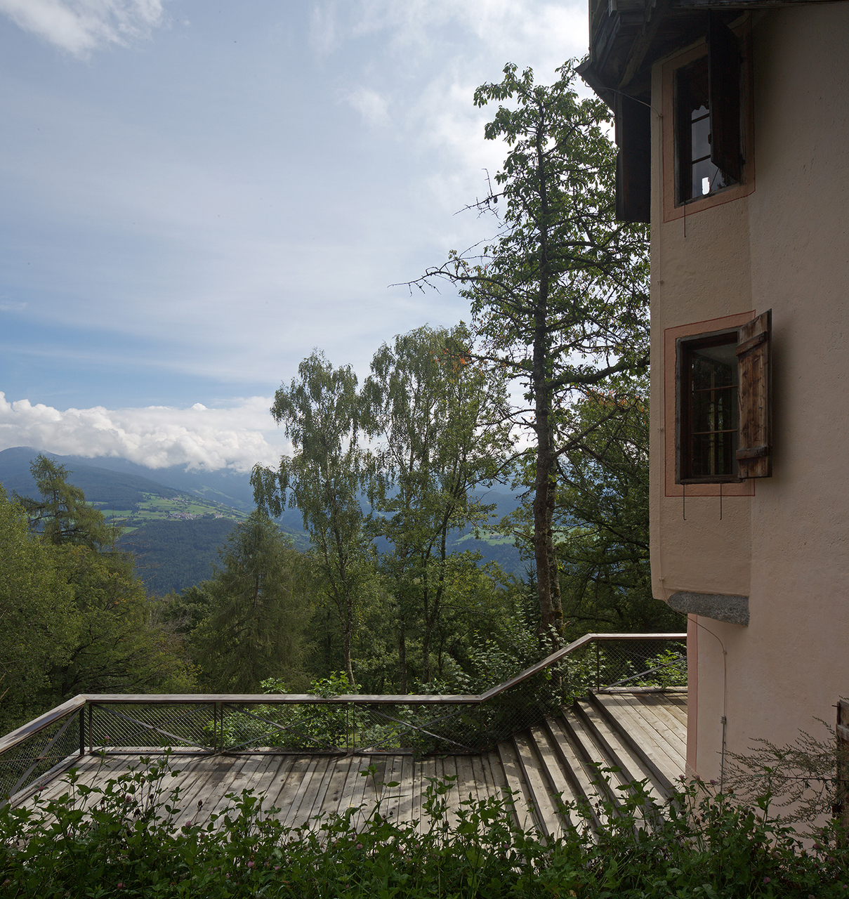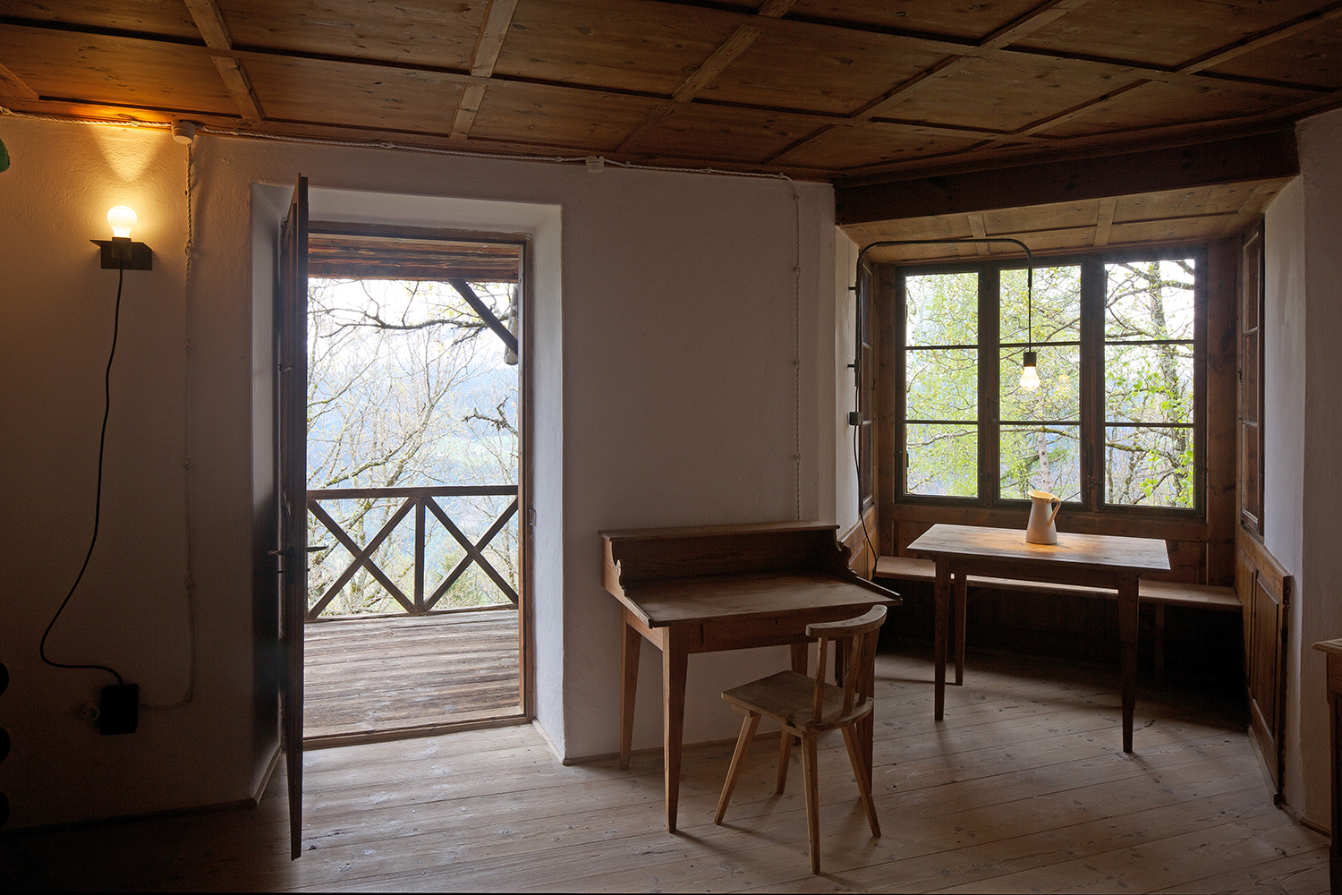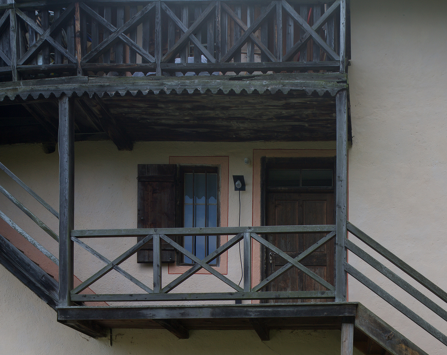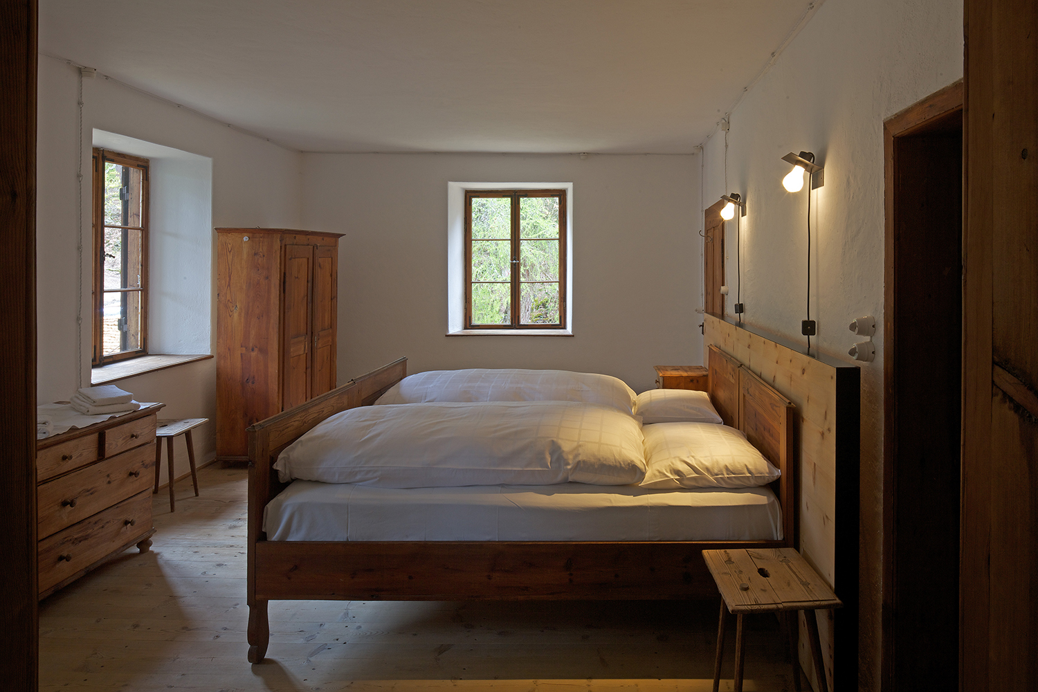 Mit Bedacht wurden die Innenräume saniert, Möbel und Kassettendecken beibehalten und Injektionen im Bestand vorsichtig vorgenommen. Über einen gemeinsamen Aufenthaltsraum mit Bibliothek und Holzofen betritt man die jeweils zwei Einheiten im Erdgeschoß und ersten Stock. Die statische Struktur bleibt sichtbar und wird mit den zwei grün lackierten I-Trägern zum gestalterischen Element. Zwei kleine Küchen-Boxen fungieren auch als Zugang zu den Wohneinheiten mit je zwei Zimmern und Bad. Die Details von Vorhandenem und Neuem sind sorgfältig herausgearbeitet. Für alle Wohnungen gibt es einen Balkon und den herrlichen Ausblick auf die Dolomiten.