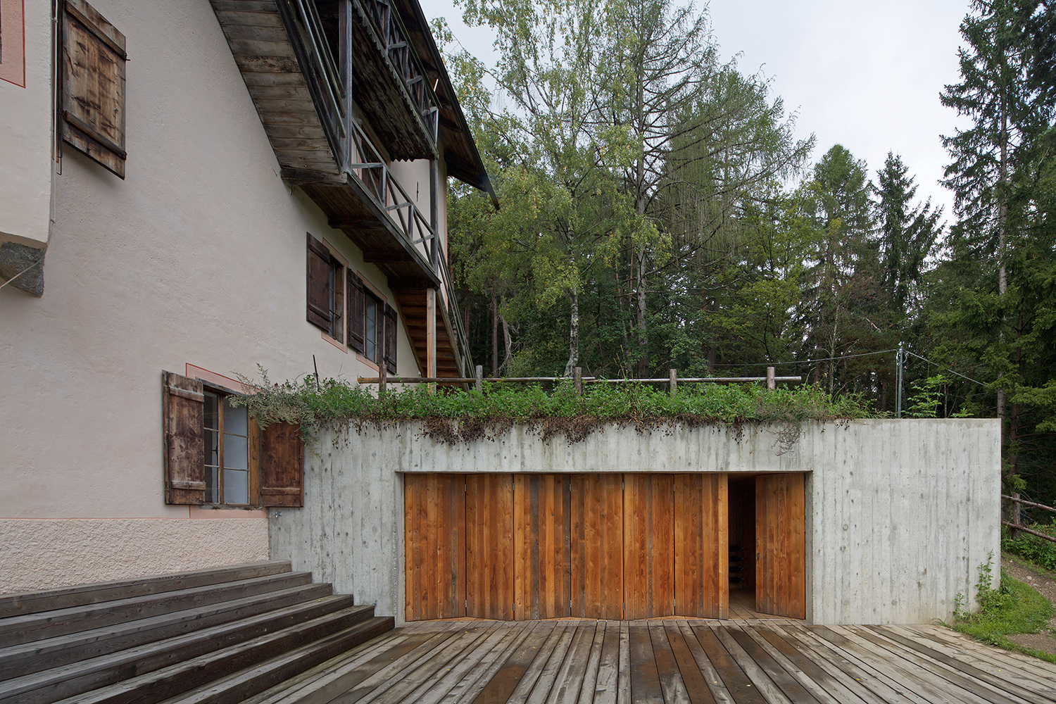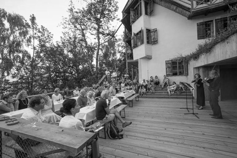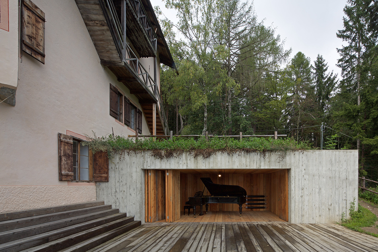 Ein kleiner ins Gelände gesetzter Zubau birgt überraschenderweise, wenn sich die Tore auffalten, den mit Holz ausgekleideten Musikraum und darin steht ein Konzertflügel. Die Terrasse davor ragt weit in die Landschaft und ist Begegnungsort von Gästen mit jungen und etablierten Künstler:innen. (Text: Martina Pfeifer Steiner)