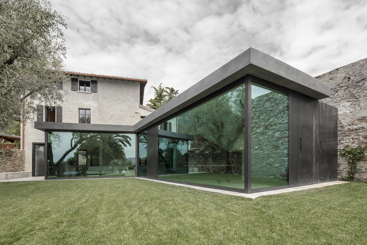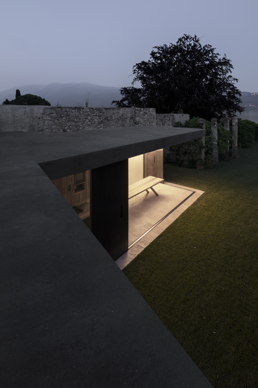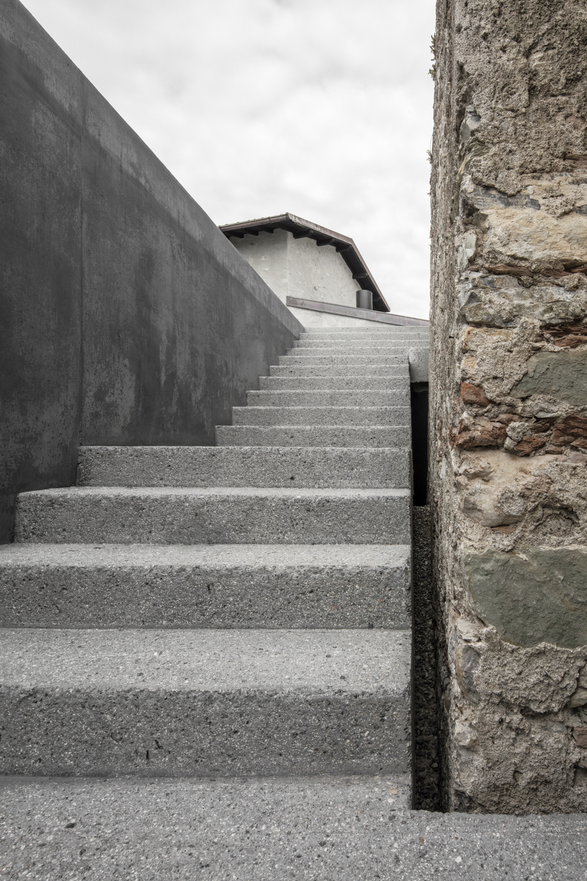 Das Dach ist zugleich Terrasse, auf die man über eine Außenstiege hinter der dunkel eingefärbten Betonmauer des Neubaus gelangt, der Abstand zur historischen Natursteinmauer ist wesentlich. Auch im Erdgeschoß des alten Rusticos ist mit der Treppenskulptur der Übergang zum Zeitgenössischen bewusst gelöst. (Text: Martina Pfeifer Steiner)