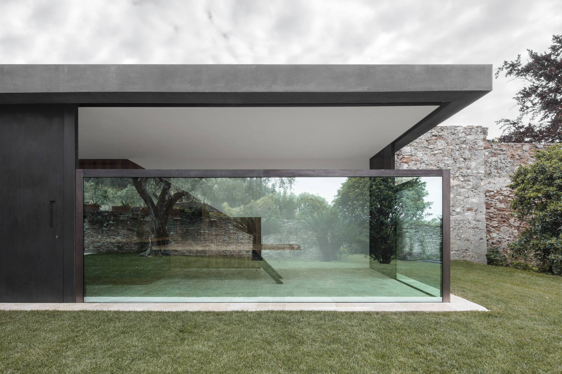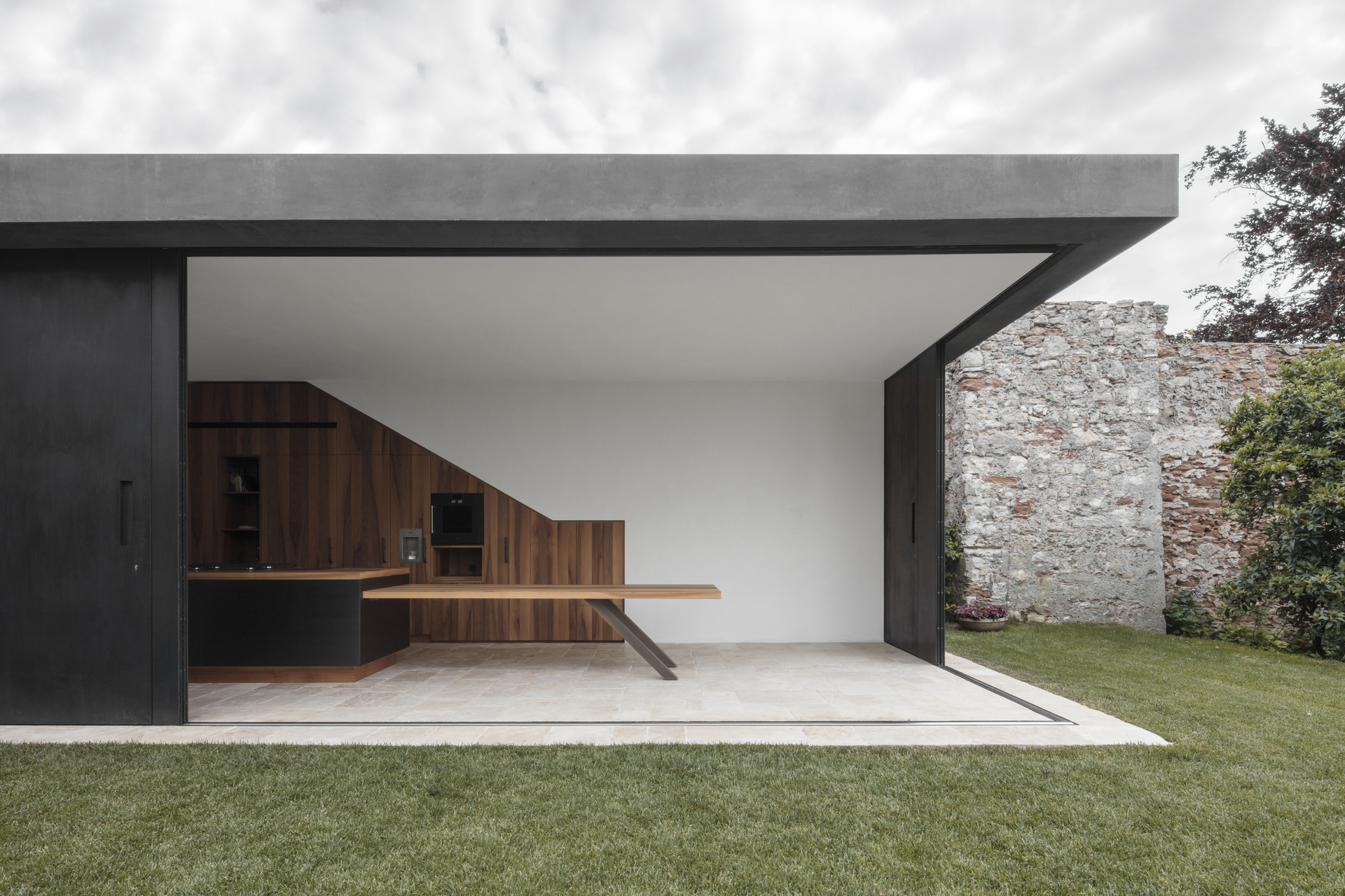 Der Neubau konfiguriert sich aus einer Ebene und dem schwebenden Dach, unmerklich gehalten im Winkel und an den Enden des L-förmigen Gebäudes. Innen ist Außen und Außen ist Innen, die großen Glasflächen verschwinden einfach im Boden, genauer gesagt in den Schächten des Untergeschoßes. Es entsteht also ein Freiluftwohnzimmer, das als solches (auch wegen des Klimas) genutzt wird. Überraschende Mechanismen finden sich außerdem in der Küche: hier fährt der Esstisch der Länge nach aus der Kochzeile, ganz nach Bedarf.