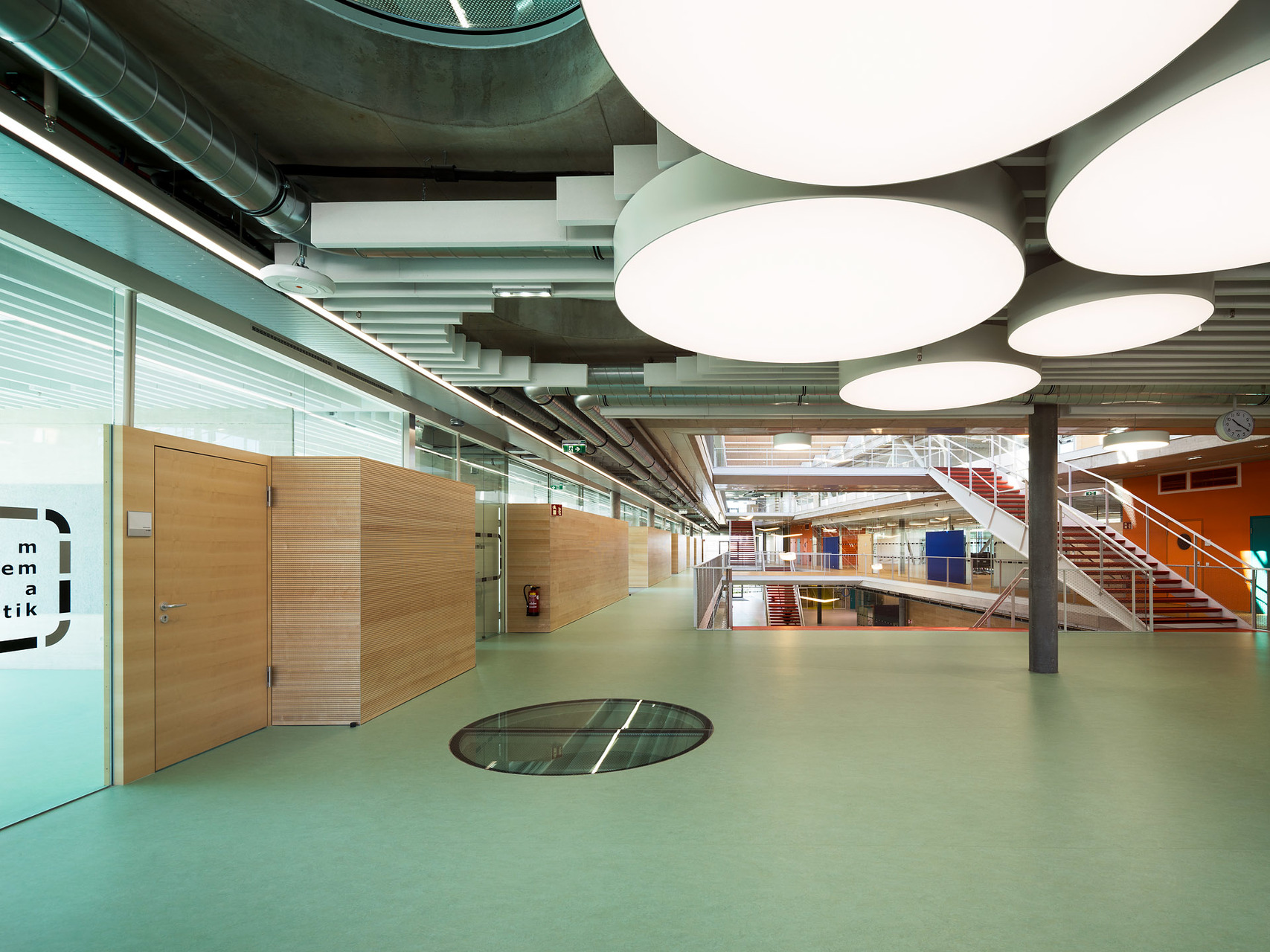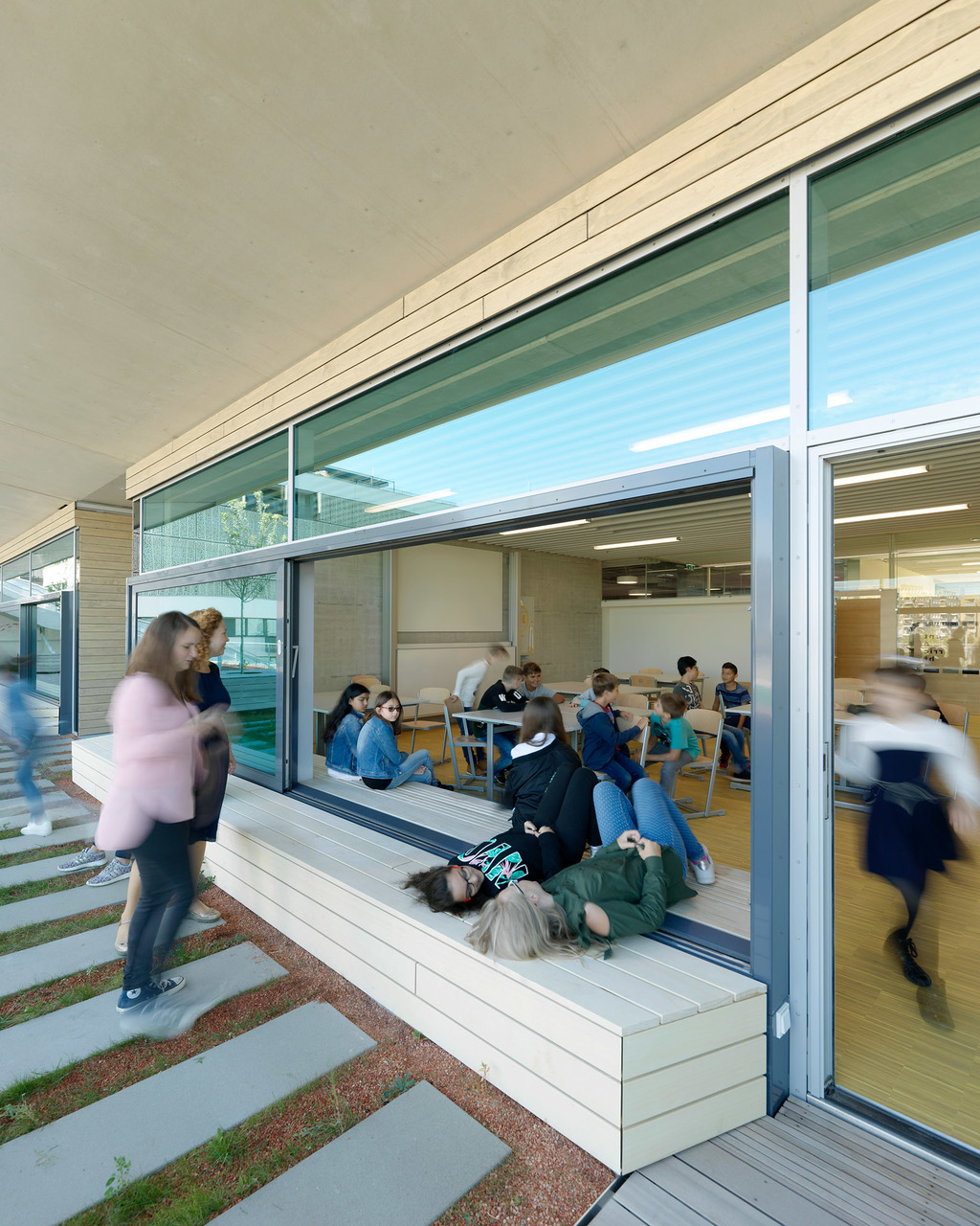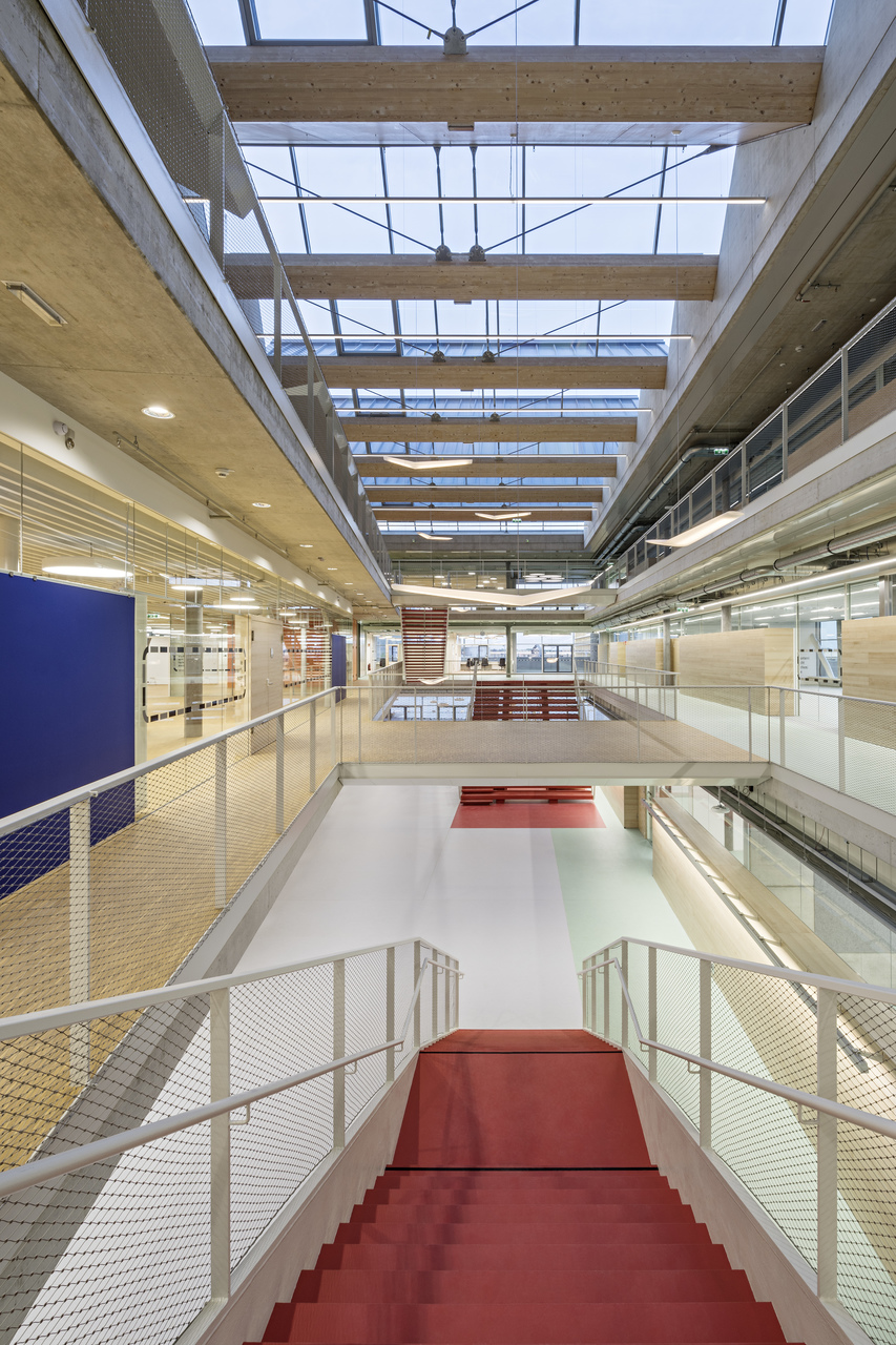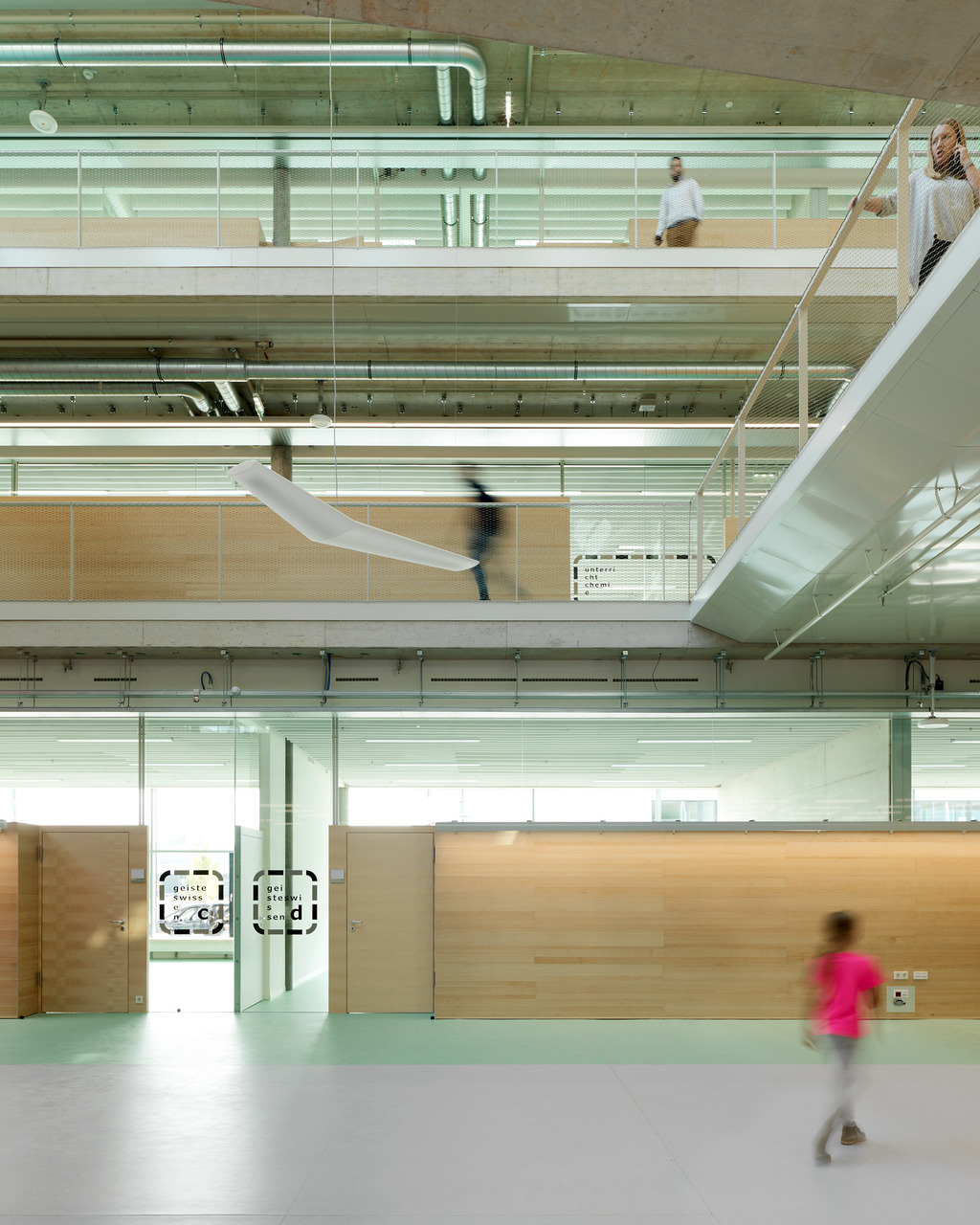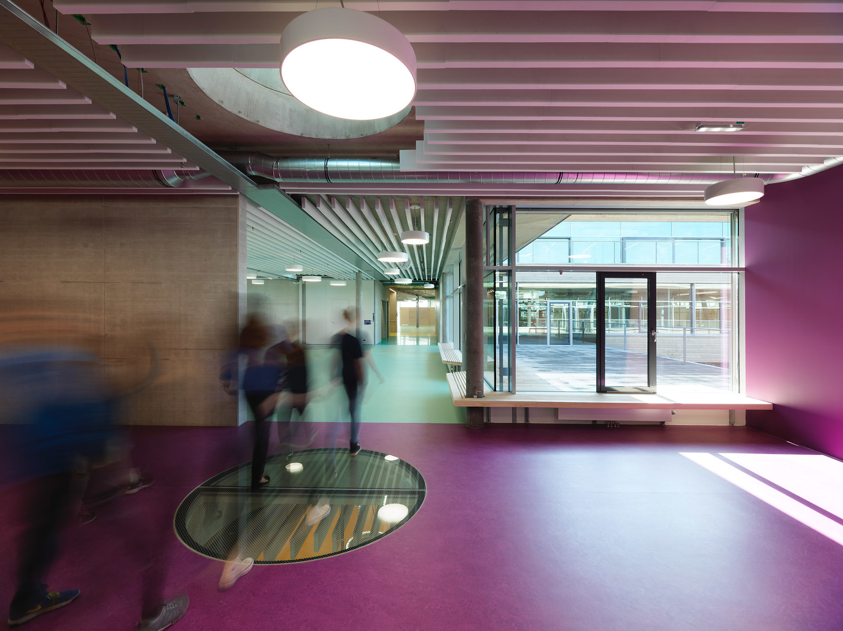 Transparenz und Leichtigkeit sind auch im Inneren der Schule das leitende Prinzip. Die Tiefe des Baukörpers erlaubt die Anlage eines gut proportionierten Hofs, der zusätzliches Licht und Grün in die Schule bringt. Parallel dazu liegt eine mehrgeschoßige Aula mit Freitreppen und offenen Lerninseln. Licht von oben kommt über ein Shed-Dach mit einer Tragkonstruktion aus Holz. Diese große Offenheit ist möglich, weil die Schule mit einer Sprinkleranlage ausgerüstet ist, eine Maßnahme, die sich nach Angabe der Architekten durch bessere Flächennutzung und den Wegfall anderer teurer Brandschutzmaßnahmen von selbst amortisiert. Die Wände der Klassen beziehungsweise Homebases sind zu den Erschließungsbereichen hin verglast. Sie haben zumeist einen direkten Ausgang zu einer Terrasse, die fast so groß ist wie die Klasse. Statt Glas bis zum Boden gibt es eine von innen und außen benutzbare Sitzbank mit einem großen Schiebefenster, in deren Gebrauch die Schüler sicher viel Fantasie entwickeln werden.