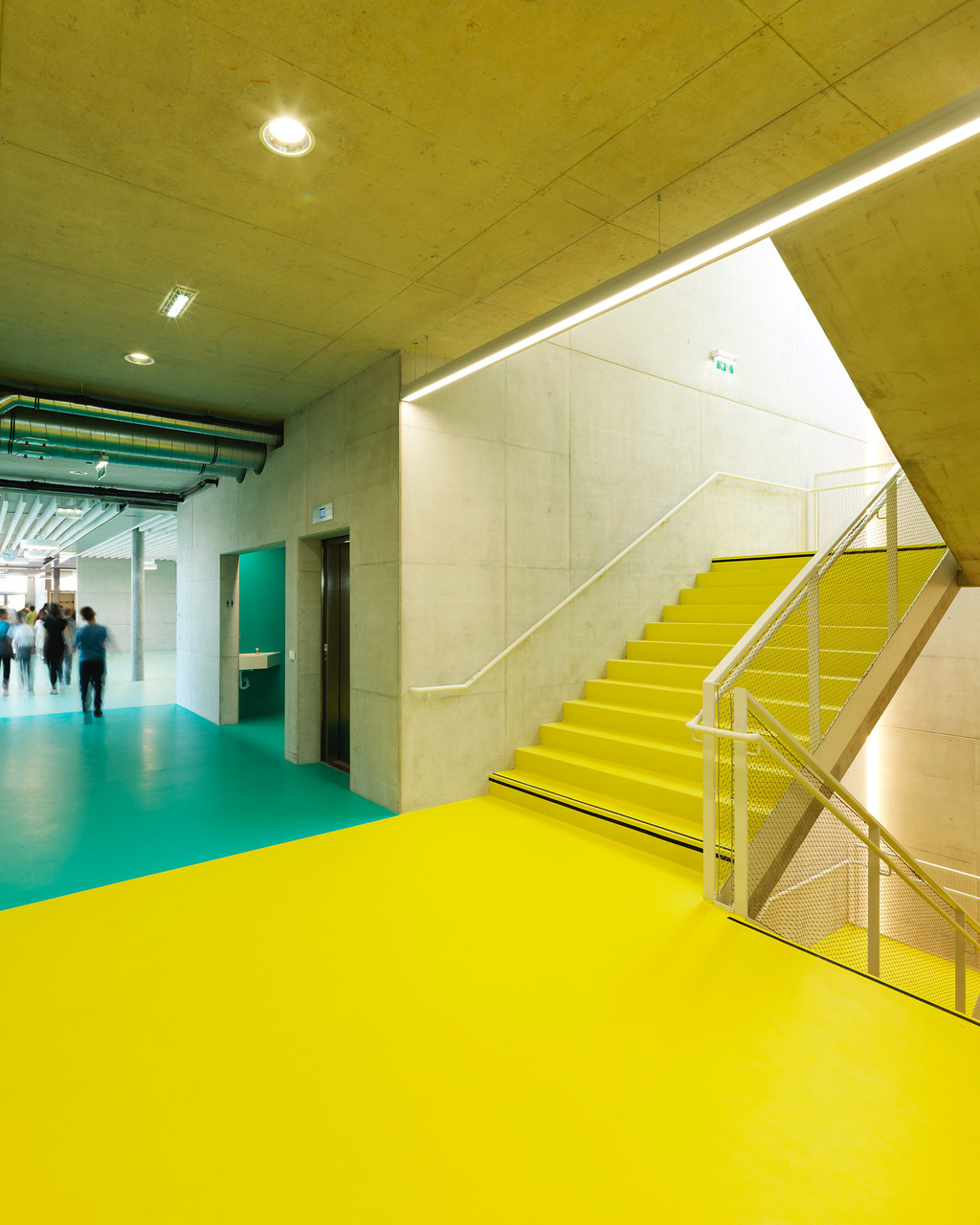 Das muss man wollen, und man muss es können. Fasch & Fuchs haben in langjähriger forschender Praxis so viel Erfahrung gewonnen, dass ihnen Bauherren, in diesem Fall die BIG, auch bei schwierigen Punkten vertrauen. Dazu gehören viele Beteiligte, unter anderem Projektleiter wie Fred Hofbauer, Büropartner von Fasch & Fuchs, die Tragwerksplaner von Werkraum Wien, die Bauphysik von Exikon und die Künstler Gustav Deutsch und Hanna Schimek, die für die Schule ein kongeniales Farbkonzept entwickelten. Ohne solche Teams, die eine Atmosphäre von Vertrauen, Optimismus und Pioniergeist aufbauen, gibt es in der Architektur keinen Fortschritt. Gerade bei einer Schule darf man hoffen, dass diese Atmosphäre sich aufs Ergebnis überträgt und Schüler wie Lehrer ansteckt.