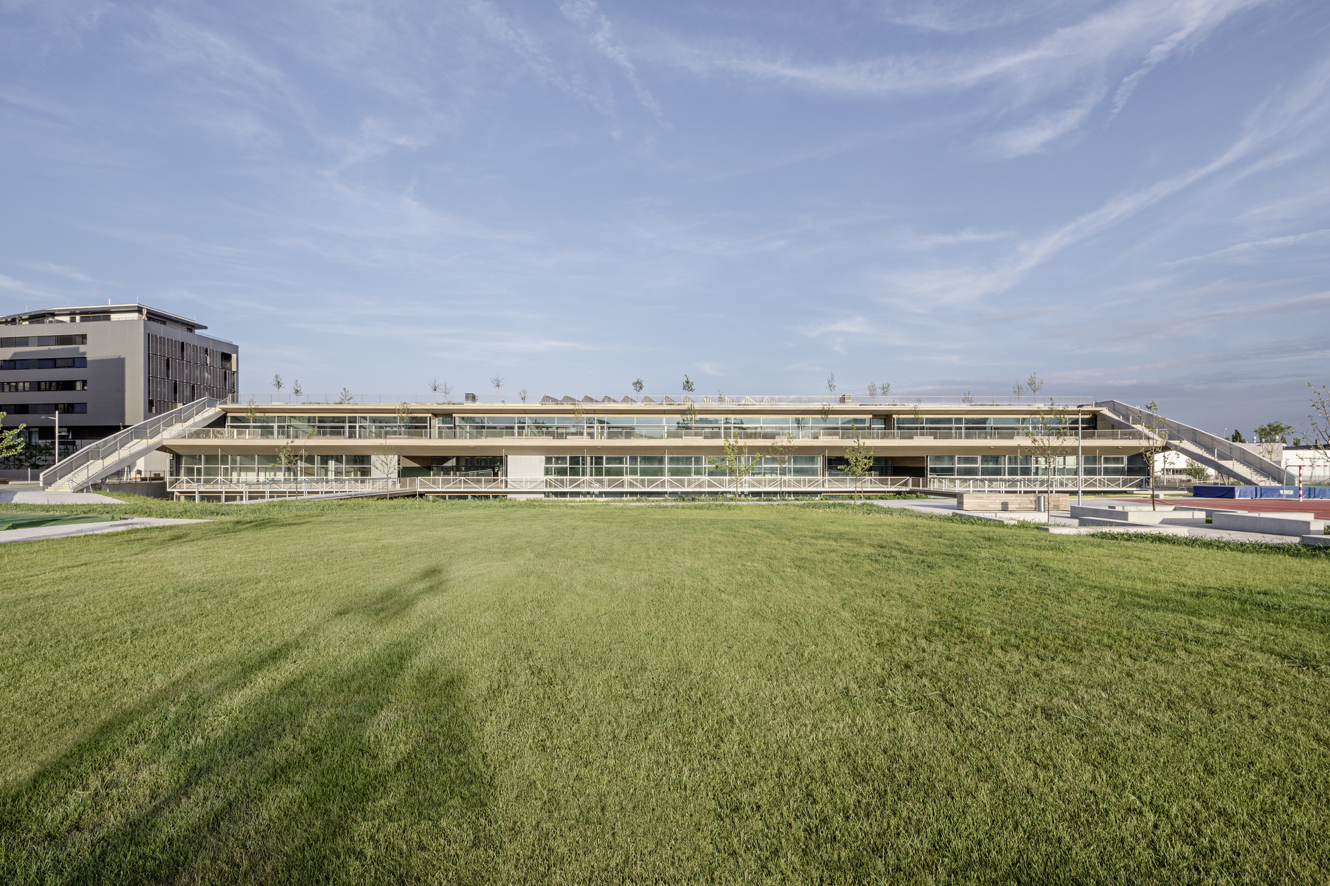 Die beiden seitlichen Arme der Schule sind Treppen, die alle Terrassen mit dem Schulgarten verbinden und gleichzeitig als Fluchtwege dienen. Straßenseitig sind die Wangen dieser Treppen mit einer Membran aus Kunststoff verkleidet, die sich an drei Seiten um das gesamte Gebäude herumzieht. Bei Gegenlicht wird hinter der Membran die tragende Stahlkonstruktion sichtbar, und was zuerst als massives Bauelement erscheint, zeigt sich plötzlich als leichte, transparente Hülle.