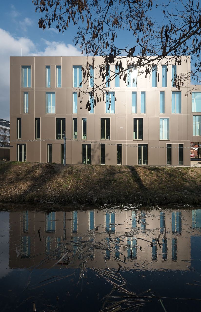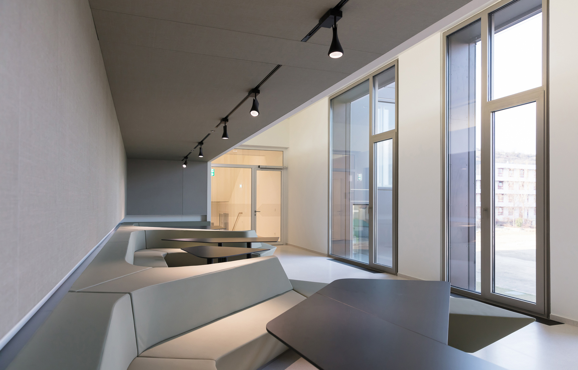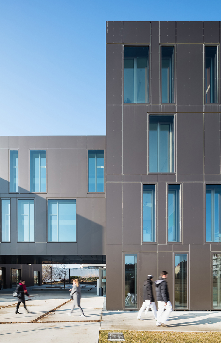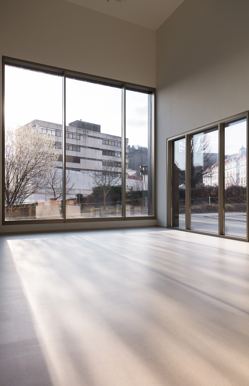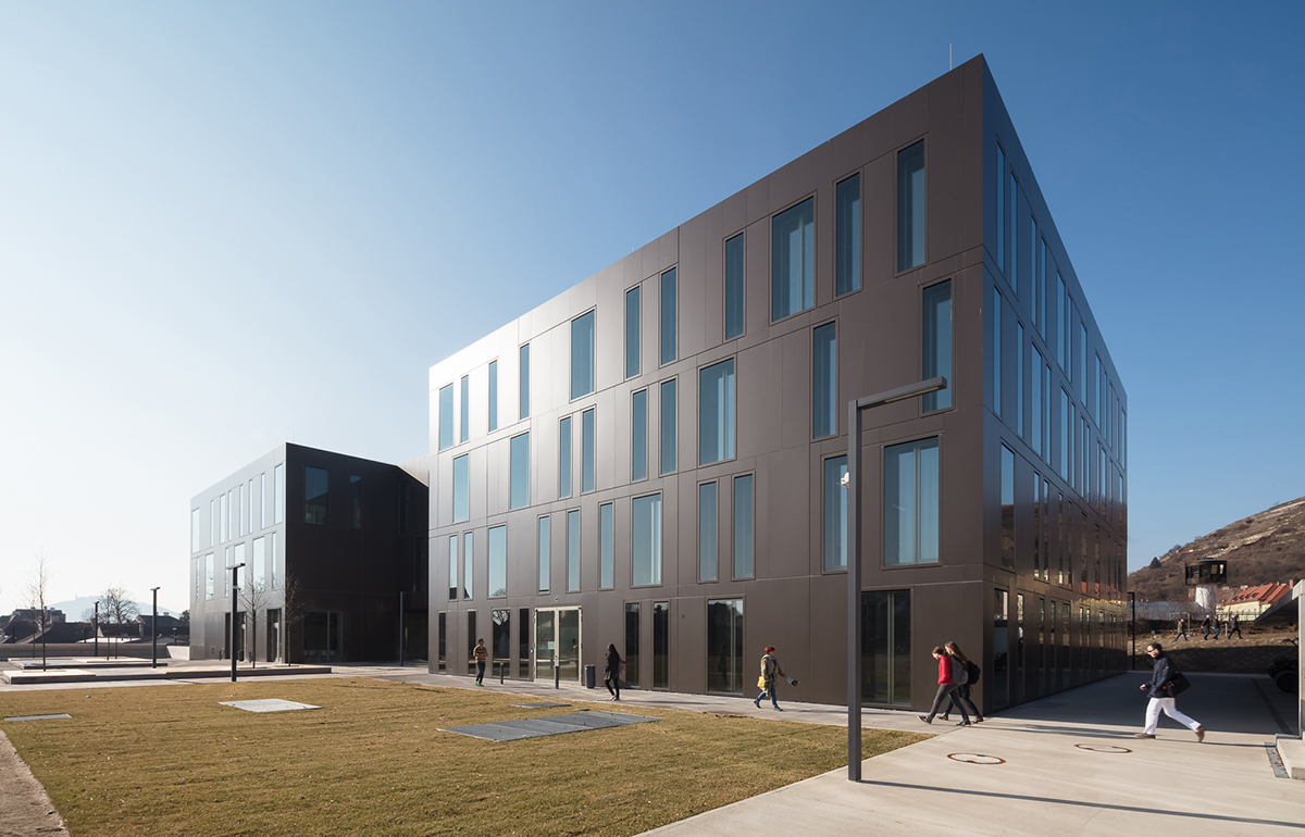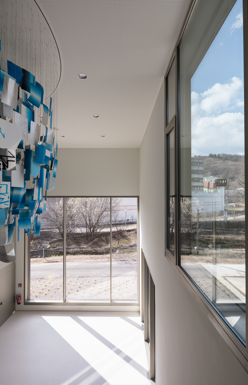 Die Doppelfunktion als Büro- und Seminargebäude manifestiert sich neben zwei individuellen Zugängen im Erdgeschoss auch im äußeren Erscheinungsbild: Das Gebäude ist in zwei dreigeschossige Baukörper mit klarer räumlicher Anordnung und inhaltlicher Zuordnung der jeweiligen Funktionen gegliedert. Beide Trakte weisen die gleiche Anzahl an Geschossen auf, die Raumhöhen unterscheiden sich jedoch entsprechend Ihrer Nutzung. Das verbindende Element stellt eine zweigeschossige Brücke dar, die zusätzlich als Aufenthalts- und Kommunikationszone fungiert. Die beiden Bauteile fügen sich in Form und Maßstab harmonisch in den städtebaulichen und landschaftlichen Kontext. Das äußere Erscheinungsbild wird von einer mit Alu-Sandwich-Paneelen verkleideten Fassade sowie der gezielten Anordnung der Fensteröffnungen unterschiedlichen Formats gekennzeichnet. Die internen Nutzungsabläufe sind durch vielfältige visuelle und funktionale Beziehungen geprägt. Die Anordnung sämtlicher Raumfunktionen erfolgt in schwellenloser Sequenz von Aktivität und Betriebsamkeit hin zu Introvertiertheit und Ruhe. Durch die doppelte Raumhöhe vermittelt das Foyer als zentraler Kommunikationsraum und Verteiler räumliche Großzügigkeit. (Text: Architekten, red. bearbeitet)