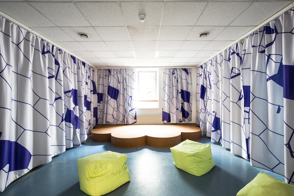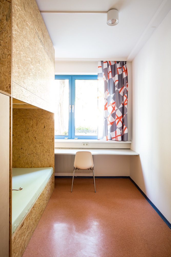 Auch die Vorhänge machen die Zimmer einzigartig. Sie sind mit 32 verschiedenen, von Stefan Nessmann entworfenen Mustern bedruckt und geben die Farbigkeit der Räume vor. Sie fordern auch den Gestaltungswillen der Kinder heraus: Wenn der