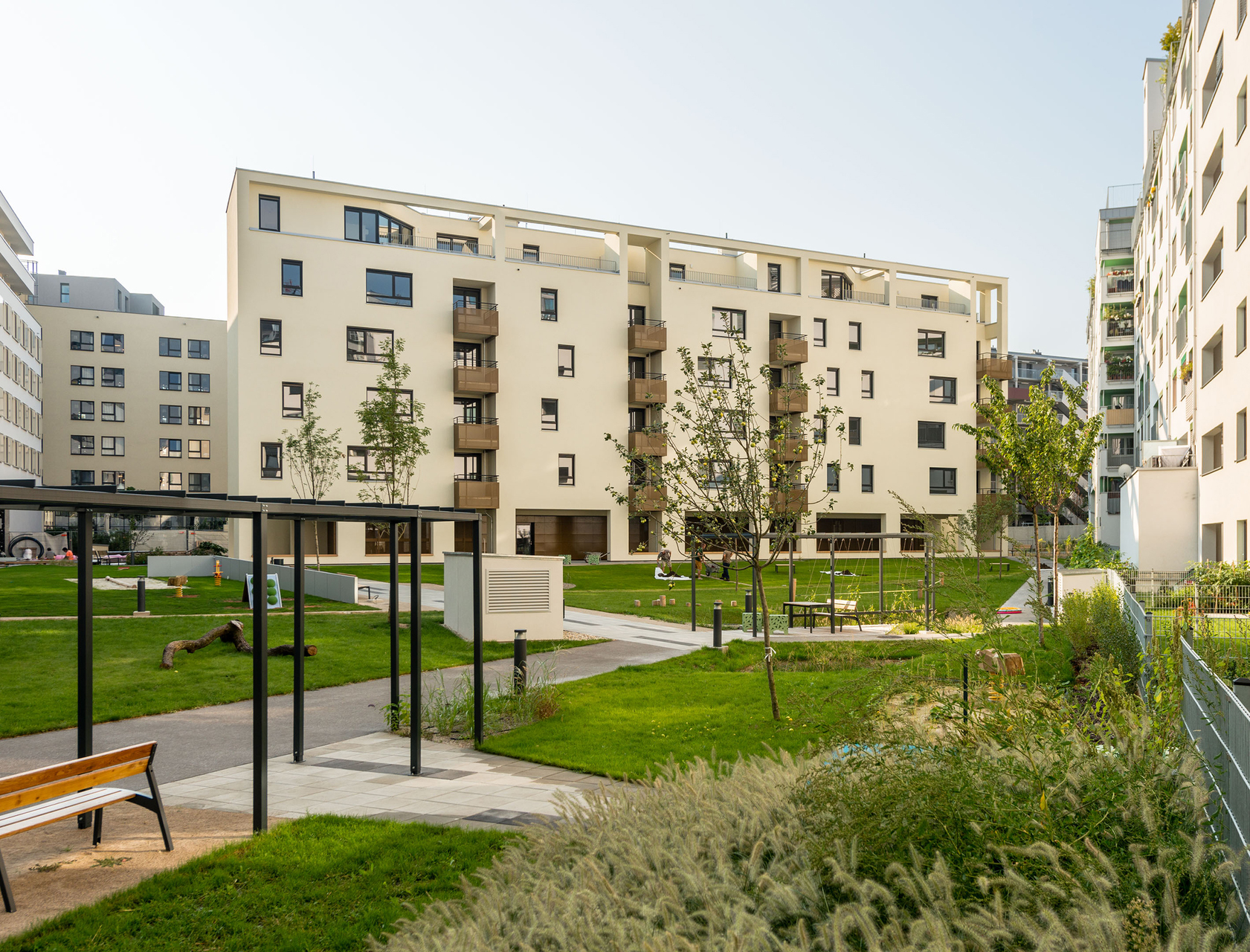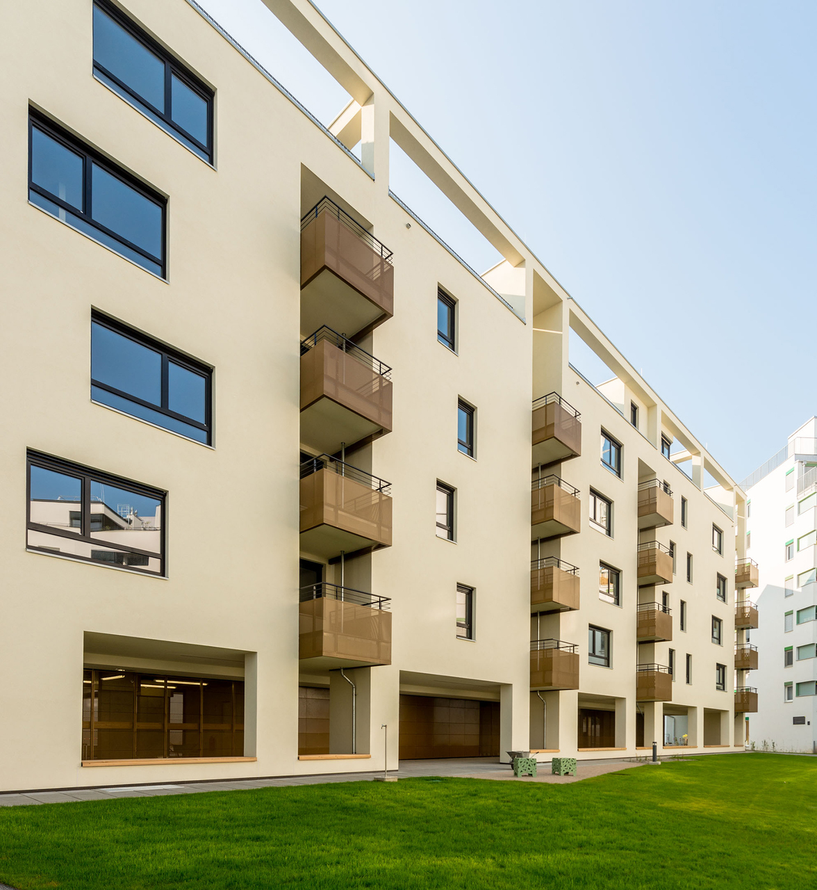 Um einen kompakten Baukörper realisieren zu können war ein §69 Verfahren nötig. In Zusammenarbeit mit dem Bezirk und den Behörden konnte auf diese Weise eine Vergrößerung der Trakttiefe auf 16 Meter erwirkt werden. Dies führte zu einem besseren Volumen/Oberflächenverhältnis und ermöglichte die ökonomische Erschliessung der Wohnungen durch einen Mittelgang. Die Ökonomie war auch ausschlaggebend für die Grundrissgestaltung – ein einziger kompakter Kern konzentriert alle Nassgruppen und Küchen um sich. (Nach einem Text der Architekten)