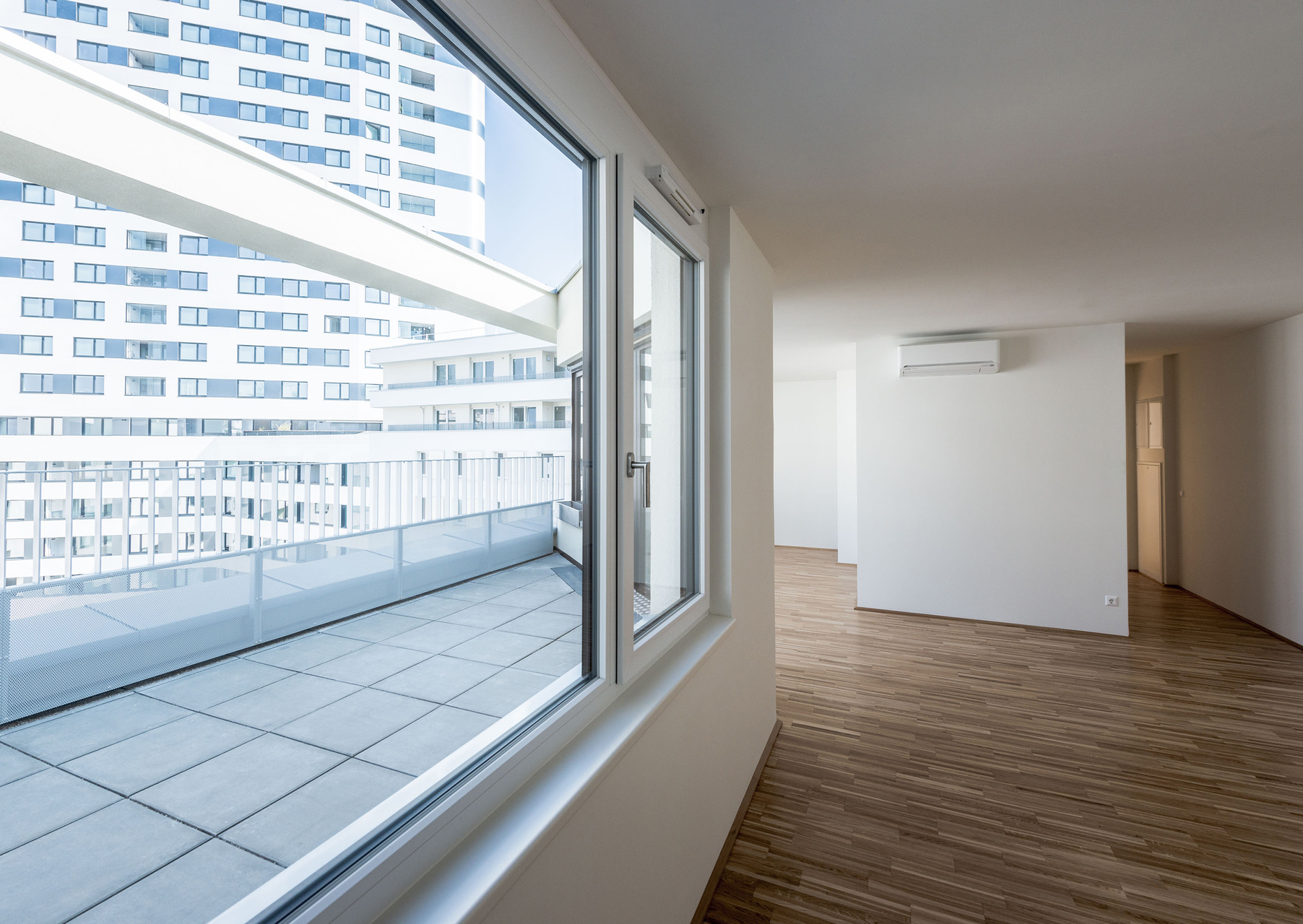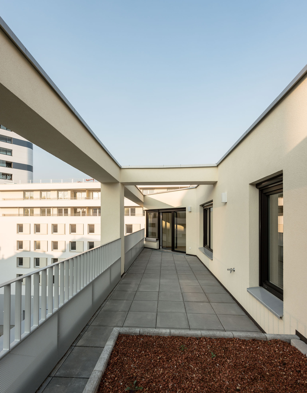 Das durch die deutlich höheren umliegenden Gebäude exponierte Umfeld erforderte primär die Auseinandersetzung mit dem Thema der Privatheit. Daraus ergaben sich Loggien und sichtgeschützte Dachterrassen. Der Wohnbereich selbst wurde durch eine aufgeständerte Erdgeschoßzone angehoben.