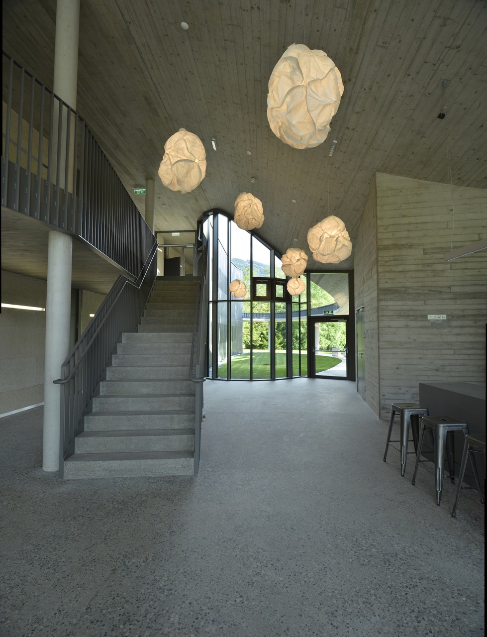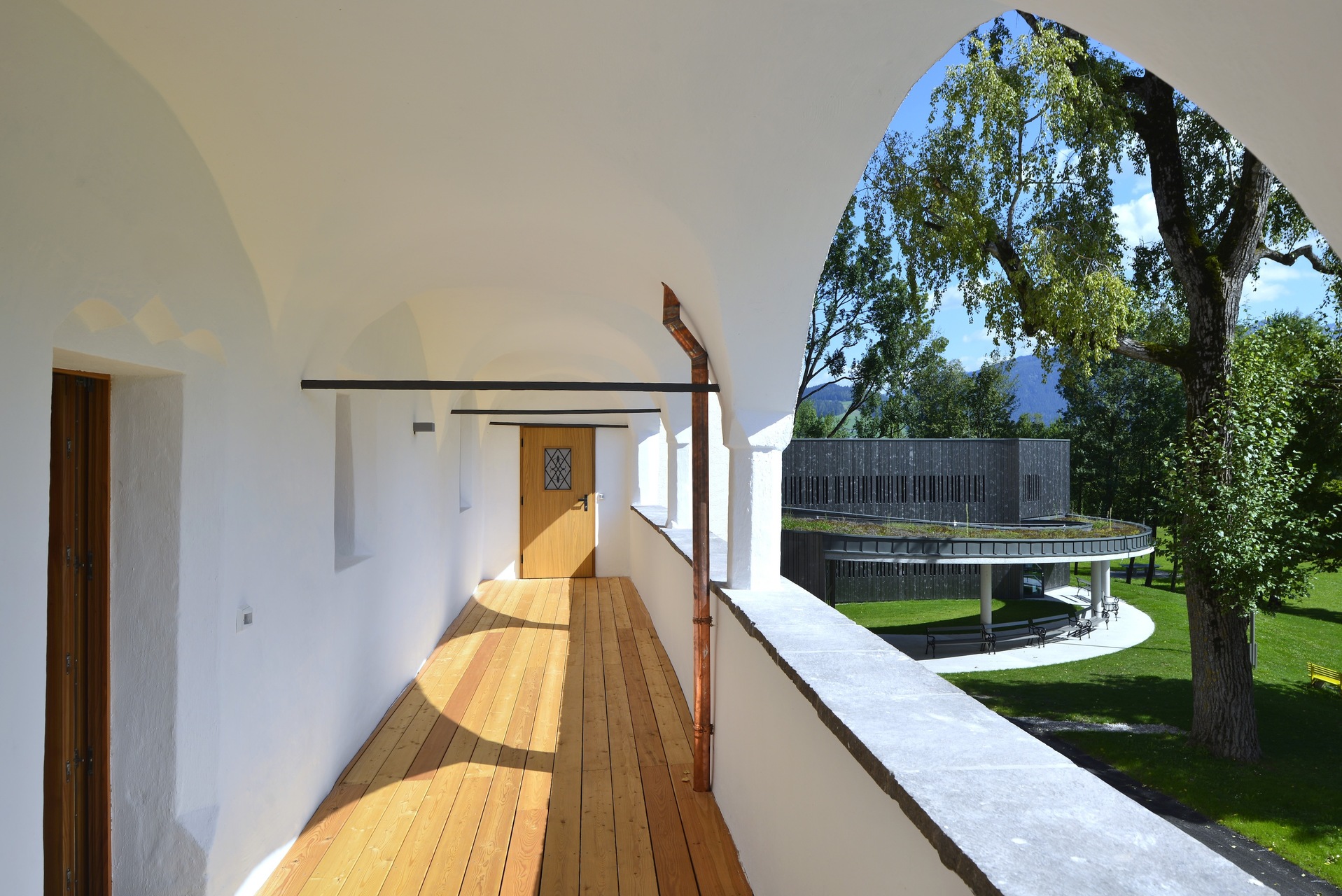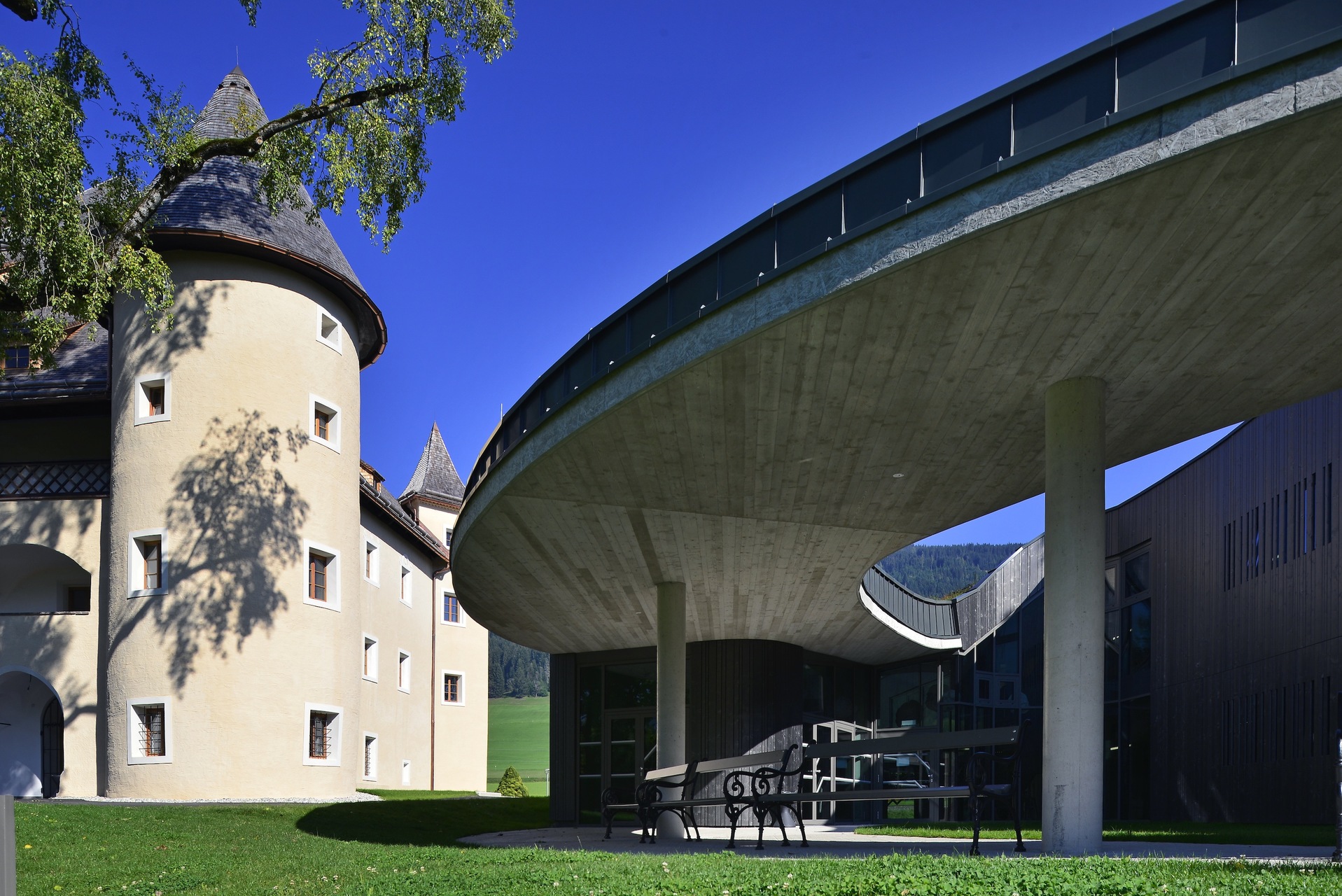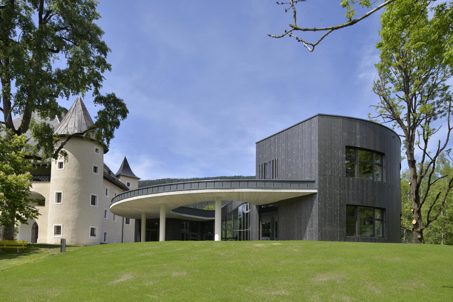 Der sich in die Landschaft integrierende Neubau fügt sich in die bestehende Situation ein. Der leicht geschwungene, zweigeschoßige Baukörper bildet das zentrale Entrée der Gesamtanlage. Im Norden liegt zwischen dem neuen Baukörper und dem bestehenden Schloss ein einladender Vorplatz, der direkt in das durchlässige Foyer überführt. Das Foyer hat außerdem verteilende Funktion zu den Zimmern in EG und OG und über das UG zu den bestehenden Räumlichkeiten im Schloss. Es bietet eine gute Orientierung und Übersicht und sorgt für kurze Wege. Anschließend an das Foyer und die ostseitig positionierten Zimmer befindet sich ein Atrium, das Richtung Süden lediglich über ein Dach und drei schmale Säulen definiert wird und frei in die Landschaft übergeht. Die Zimmer sind alle Richtung Osten mit Blick in die Landschaft orientiert. Das Konzept, die Natur möglichst spürbar für die Gäste erlebbar zu machen, ist eine große Bereicherung für den Gästebetrieb. Der sensible aber doch sehr eindeutige Umgang mit dem Umfeld stärkt den Ort als Genius Loci und schafft neue räumliche Qualitäten zwischen Schloss und neuem Baukörper sowie innerhalb des Gebäudes ohne eine gut funktionierende Anordnung des Programms zu vernachlässigen. Die neu entwickelte und geplante Einrichtung rundet das Projekt ab. (Text: Architekten, bearbeitet)
