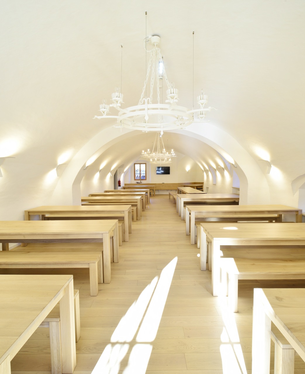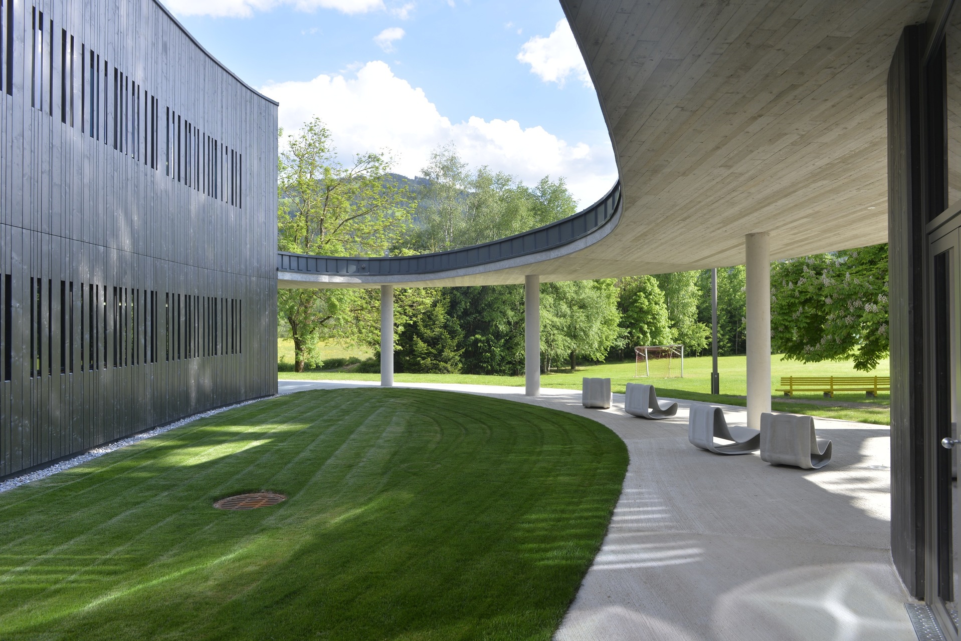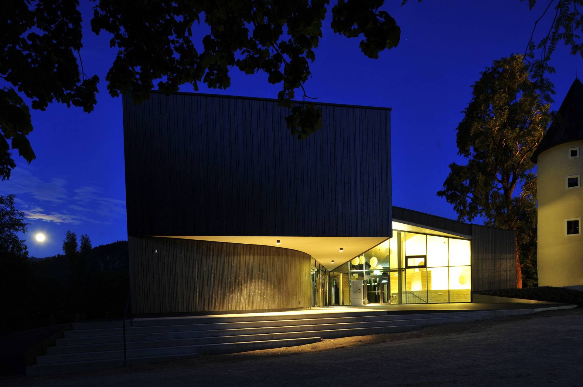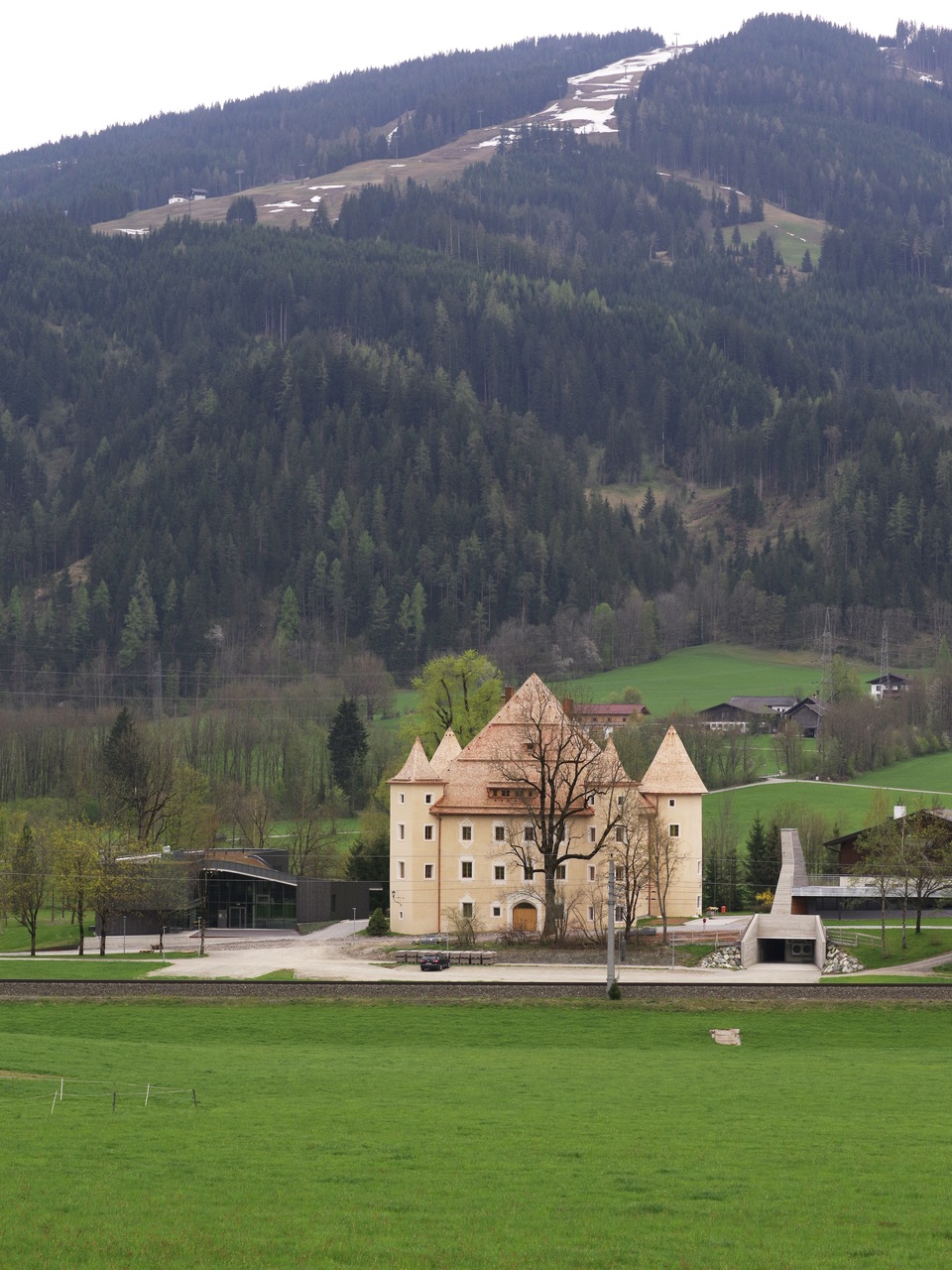 Der sich in die Landschaft integrierende Neubau fügt sich in die bestehende Situation ein. Der leicht geschwungene, zweigeschoßige Baukörper bildet das zentrale Entrée der Gesamtanlage. Im Norden liegt zwischen dem neuen Baukörper und dem bestehenden Schloss ein einladender Vorplatz, der direkt in das durchlässige Foyer überführt. Das Foyer hat außerdem verteilende Funktion zu den Zimmern in EG und OG und über das UG zu den bestehenden Räumlichkeiten im Schloss. Es bietet eine gute Orientierung und Übersicht und sorgt für kurze Wege. Anschließend an das Foyer und die ostseitig positionierten Zimmer befindet sich ein Atrium, das Richtung Süden lediglich über ein Dach und drei schmale Säulen definiert wird und frei in die Landschaft übergeht. Die Zimmer sind alle Richtung Osten mit Blick in die Landschaft orientiert. Das Konzept, die Natur möglichst spürbar für die Gäste erlebbar zu machen, ist eine große Bereicherung für den Gästebetrieb. Der sensible aber doch sehr eindeutige Umgang mit dem Umfeld stärkt den Ort als Genius Loci und schafft neue räumliche Qualitäten zwischen Schloss und neuem Baukörper sowie innerhalb des Gebäudes ohne eine gut funktionierende Anordnung des Programms zu vernachlässigen. Die neu entwickelte und geplante Einrichtung rundet das Projekt ab. (Text: Architekten, bearbeitet)