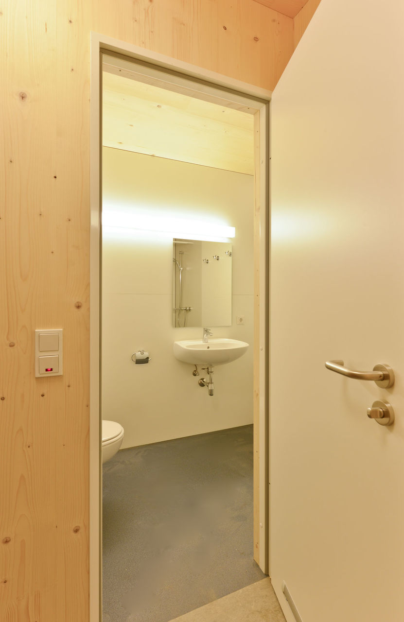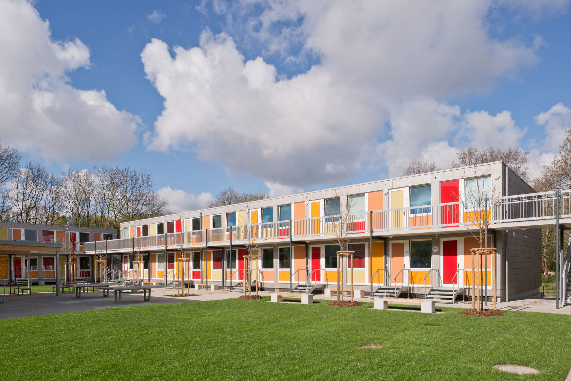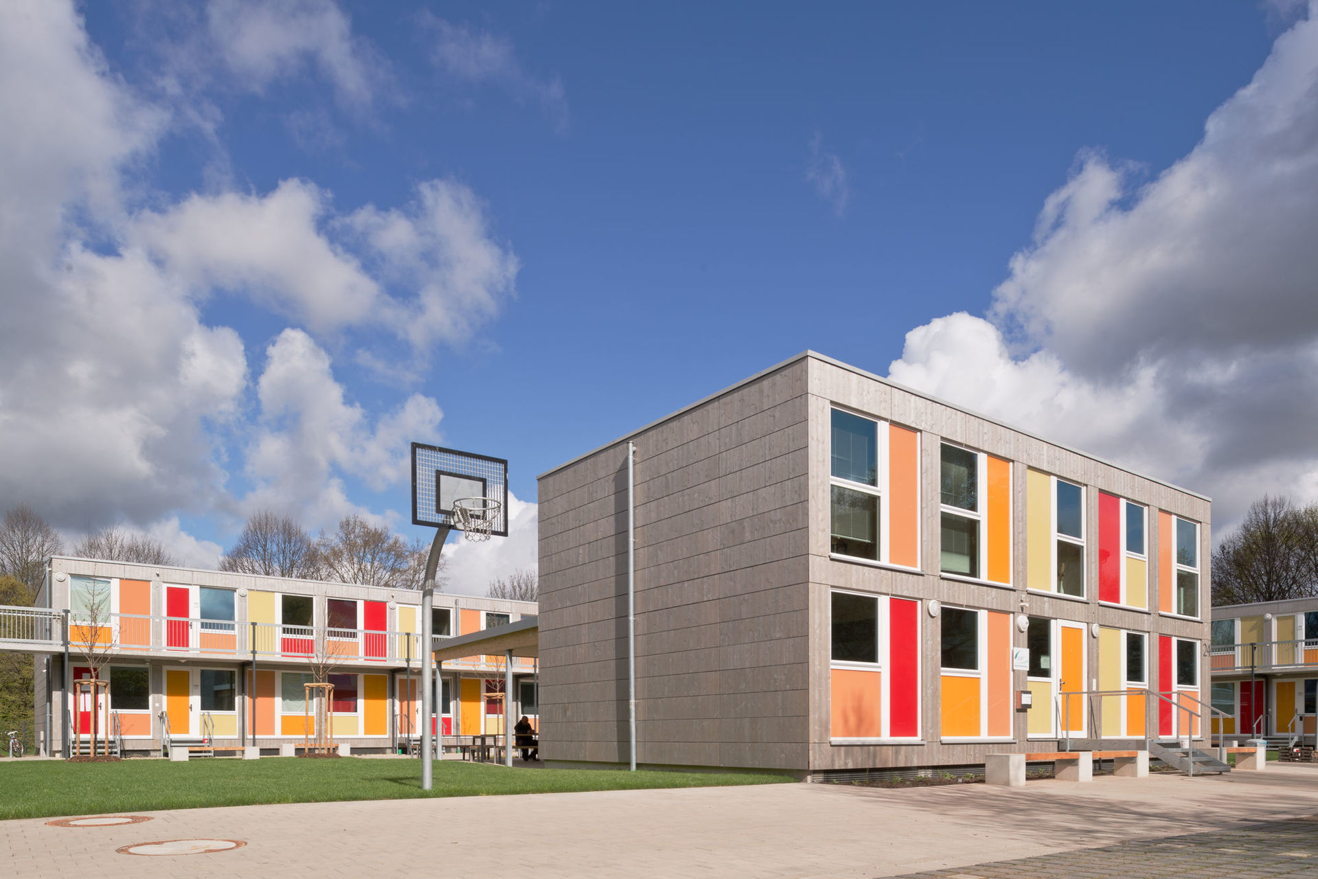 Die 2-geschossige Wohnanlage mit 96 Zimmern für Flüchtlinge strahlt durch ihre Farbigkeit Optimismus und Zuversicht aus. Die serielle Fertigung ist in der Fassade ablesbar, ohne „billig“ zu wirken. Die U-förmige Anordnung der 3 länglichen, doppelstöckigen Baukörper und dem als Gegenüber leicht aus der Mitte platzierten Gemeinschafts- und Verwaltungsbau spannen einen schönen Zwischenraum auf. Dieser lässt Begegnungen zu, ohne aufdringlich zu sein. Dies wird von der laubengangartigen Erschliessung im oberen Stockwerk unterstützt. Die Wohneinheiten sind logisch und flexibel strukturiert. Die notwendige Einfachheit von Modulbauten ist vorhanden, jedoch subtil, direkt und mit einer warmen Ausstrahlung umgesetzt. (Text: Vorarlberger Holzbaupreis 2017 - Begründung der Jury)