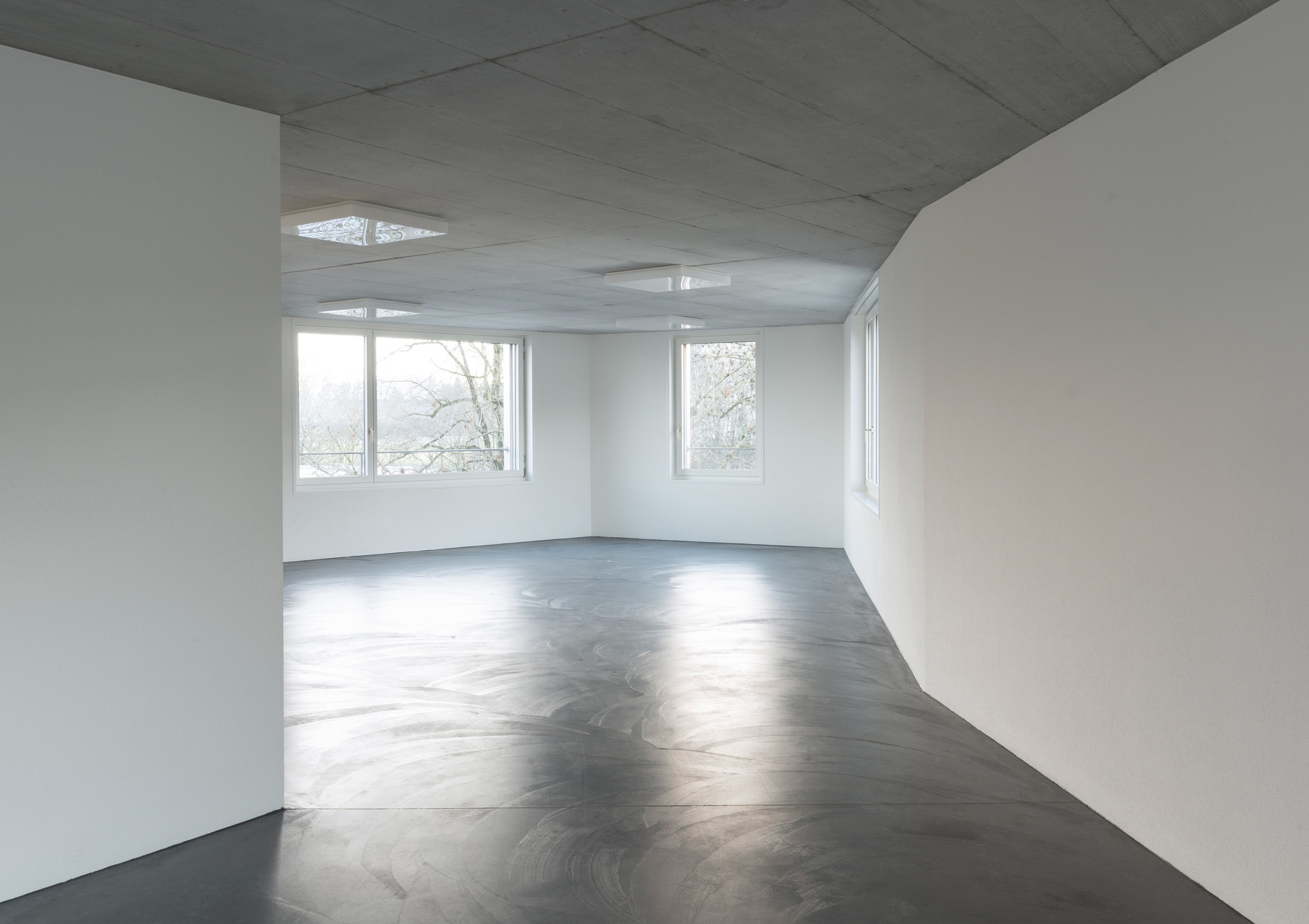 Die innere Organisation wird massgeblich vom Wechsel der zwei Treppenhäuser und dem Liftkern, der das strukturelle Rückgrad der Wohnung bildet, bestimmt. Dies ermöglicht ein Rundum-Wohnen mit starkem Aussenbezug. Dem entgegen werden die Bürogeschosse durch die polygonale Grundrissfigur, die aus zwei Haupträumen besteht, geprägt.