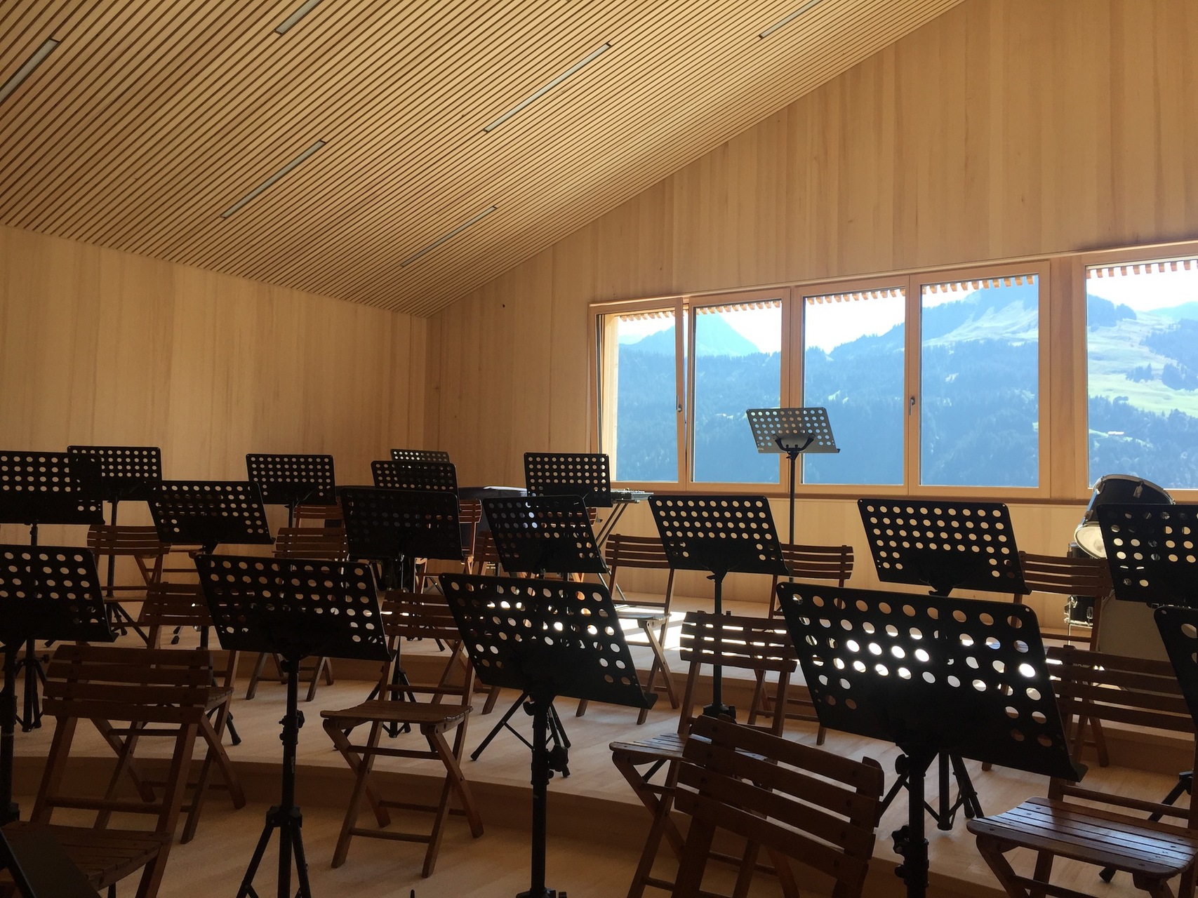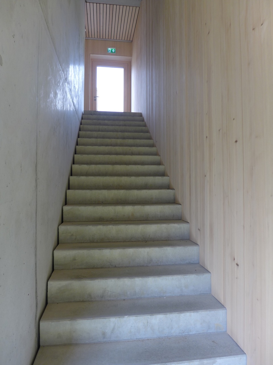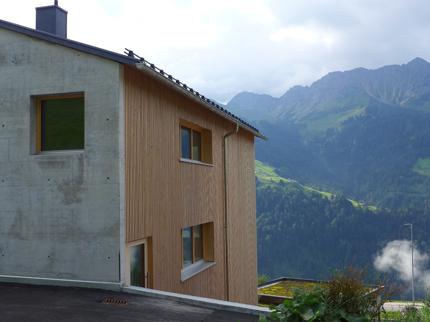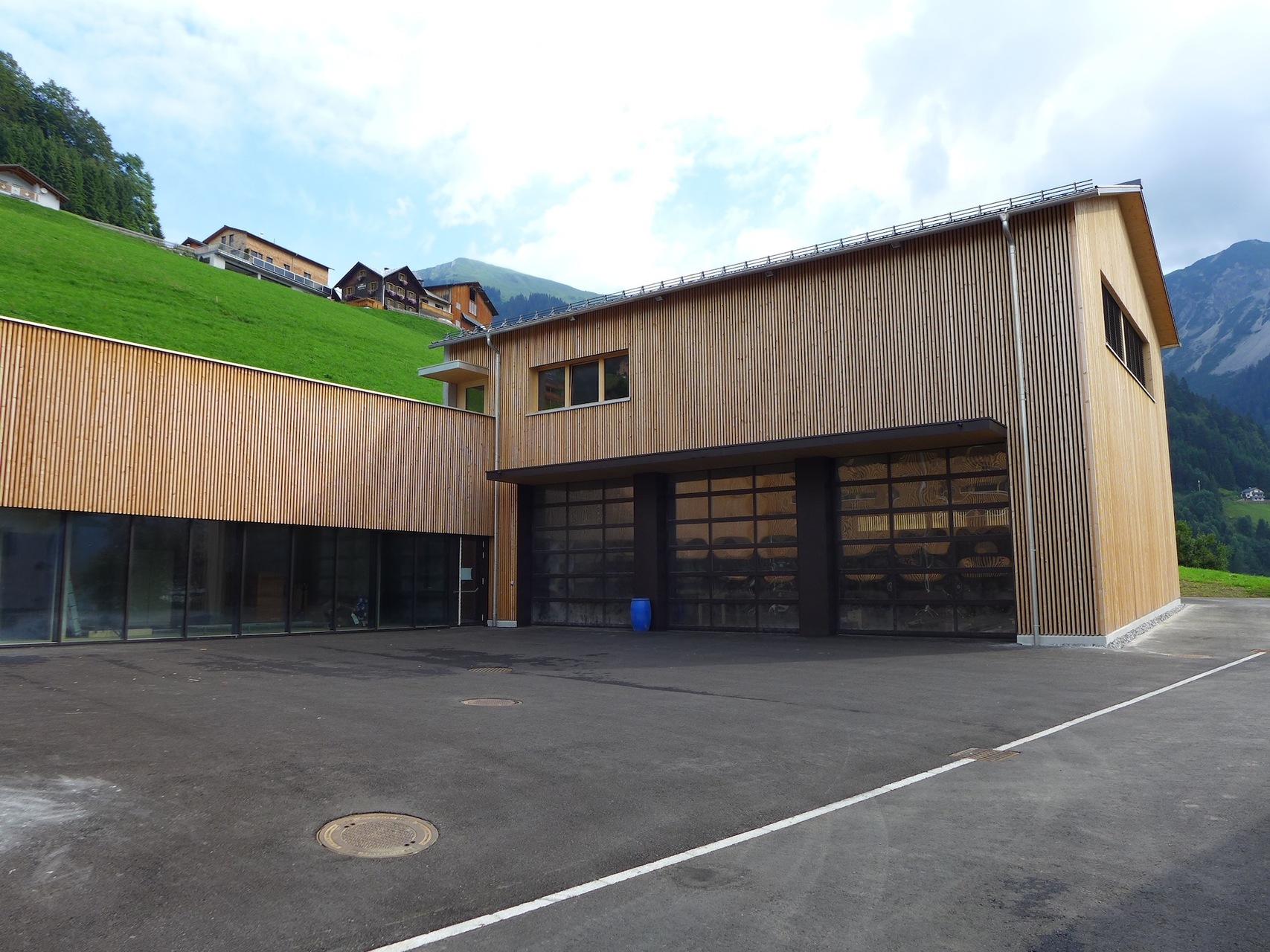 Mit großer Leichtigkeit schreiben Gohm Hiessberger mit zwei Bauten die Häuserzeile entlang der Passstraße fort und packen die verschiedenen Funktionen mit großer Selbstverständlichkeit ins äußerst steile Gelände. Daneben zwingen straffe Budgetvorgaben zu einer Komprimierung der Wünsche auf das Notwendige, dementsprechend roh und ungeschönt sind Garderoben und Fahrzeug-Einstellhallen ausgefallen. Angriffslustige Farbgebung und offene Leitungsführung überhöhen den legeren Eindruck und vermitteln Aktionsfreude. Die Schulungs- und Proberäume überraschen durch akkurate Ausführung – edle Täferarbeiten in Weißtanne, dem ehrenamtlichen Einsatz sei Dank, wenn auch da und dort mit mehr Gestaltungswillen, als den Architekten lieb ist. Große Aufmerksamkeit erfahren die Außenräume. Mit ihren wohlüberlegten Oberflächen und Übergängen zelebrieren sie die Wichtigkeit der Funktionen und unterstreichen den öffentlichen Anspruch dieses gelungenen Horts dörflichen Zusammenhalts. (Text: Marina Hämmerle)