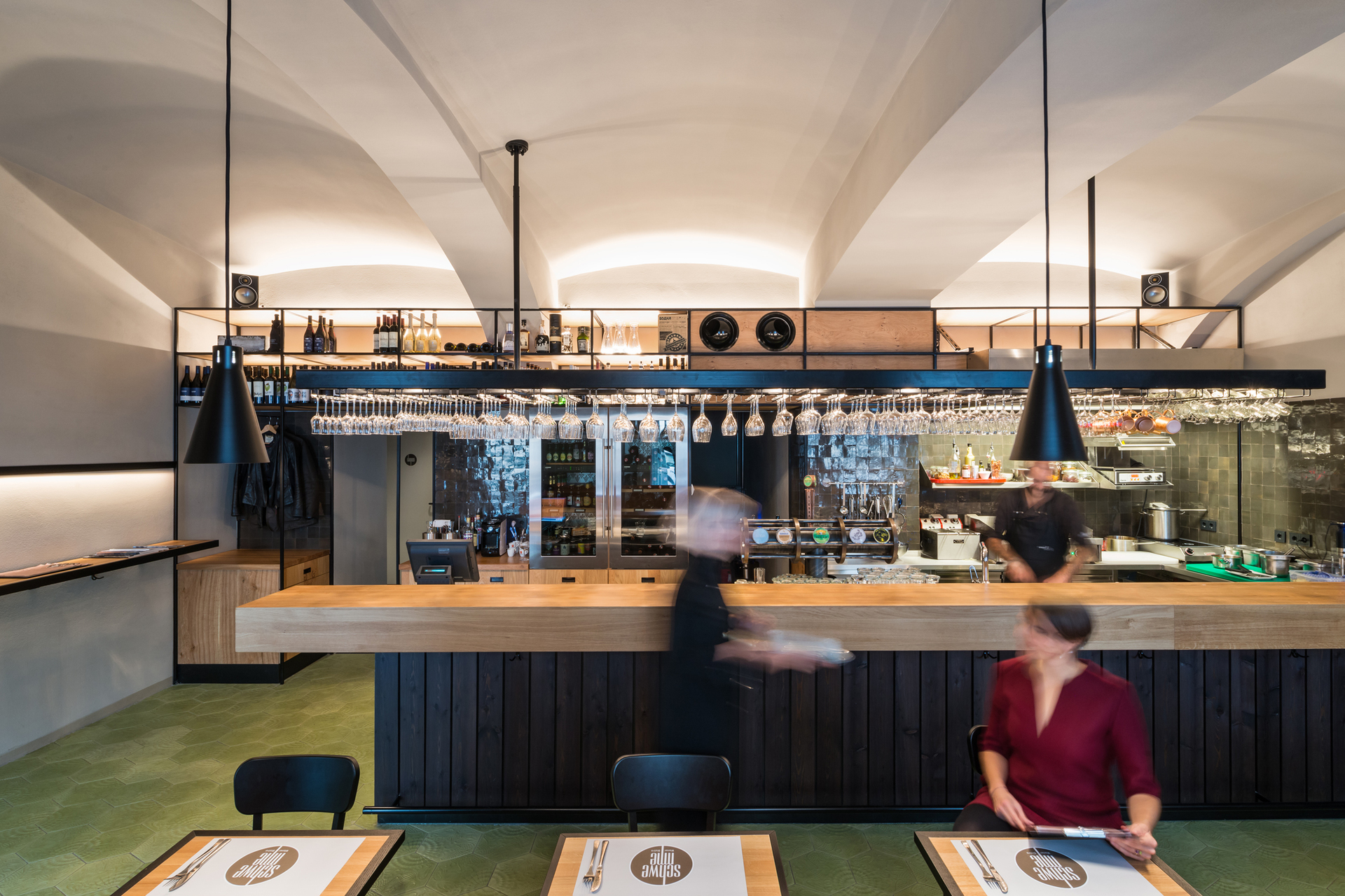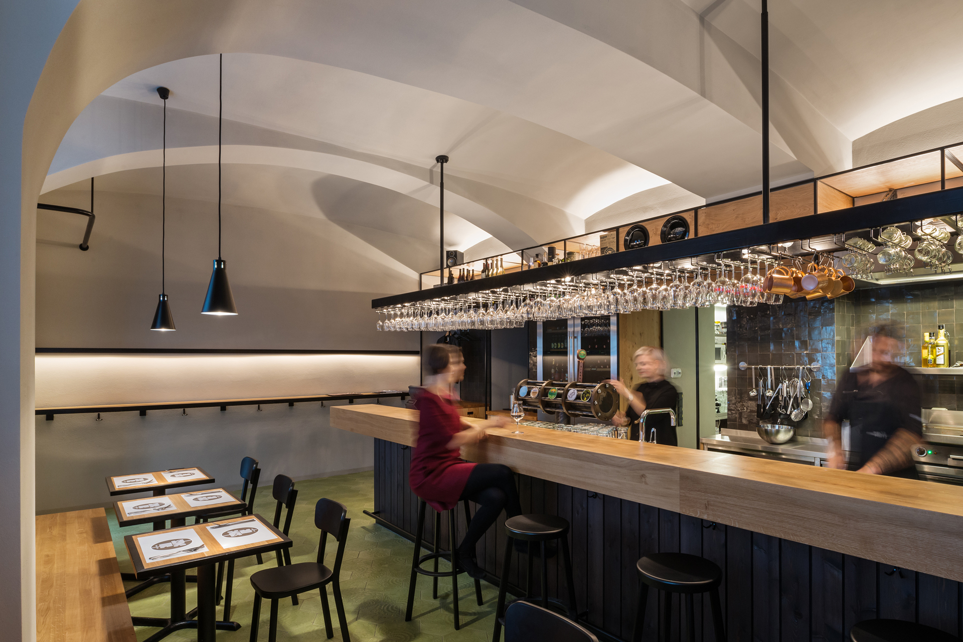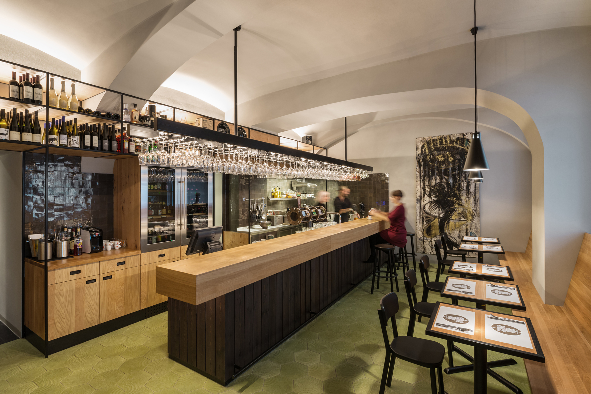 Technisch war der Umbau durchaus komplex. Alle Veränderungen mussten mit dem Bundesdenkmalamt abgestimmt werden. Der Einbau der erforderlichen Gastro-Lüftung, die unsichtbar bleiben sollte, war eine große Herausforderung. Für frische Zuluft grub man einen Luftbrunnen im Innenhof, ein bestehender Waschküchen-Kamin konnte schlussendlich für die Abluft genutzt werden. (Text: Architekten, bearbeitet von Martina Pfeifer Steiner)
