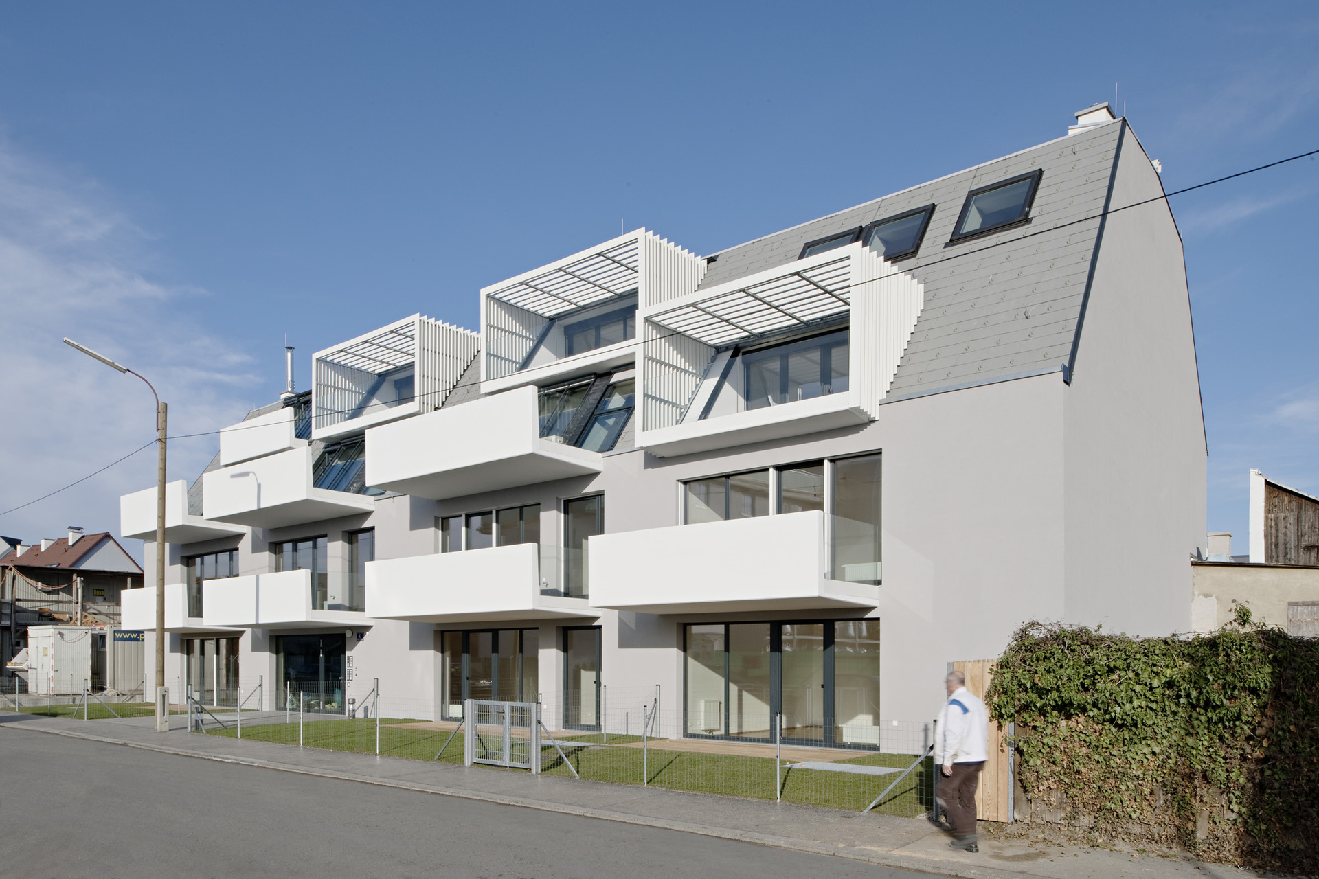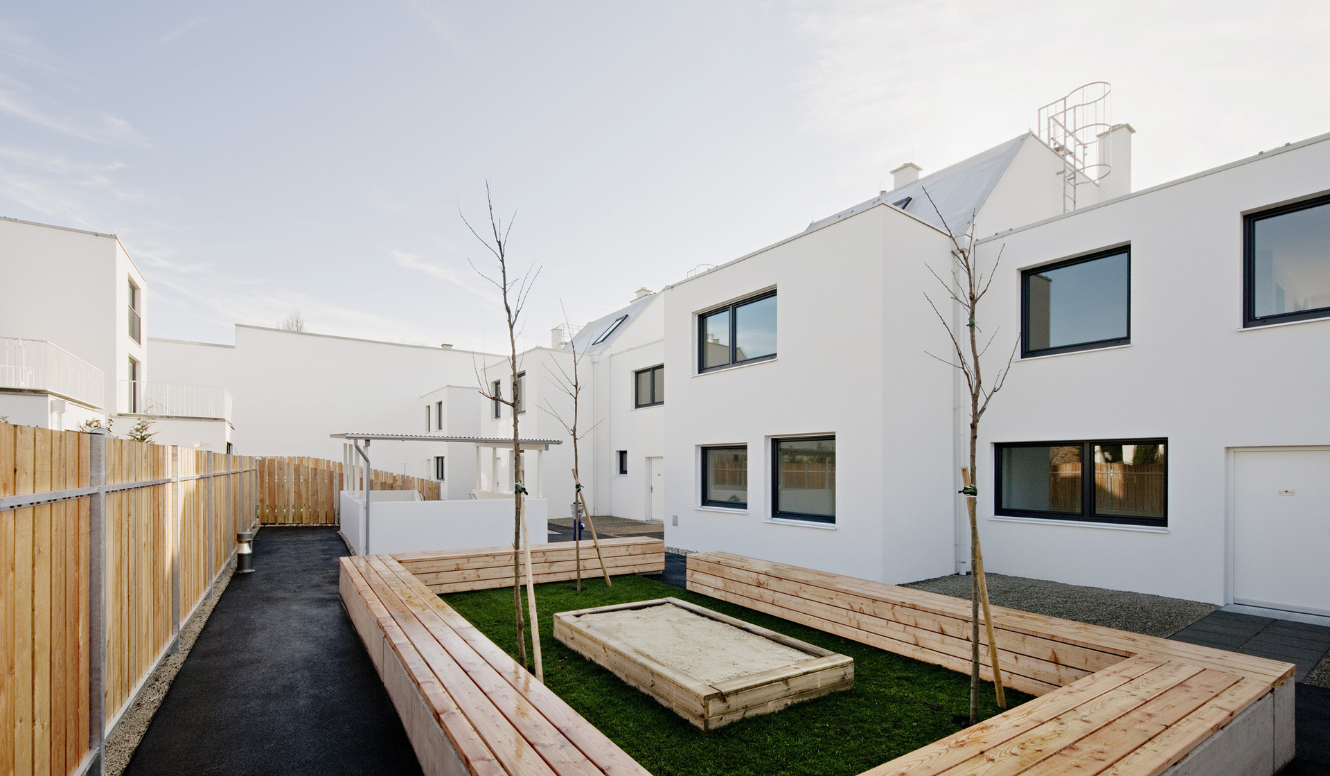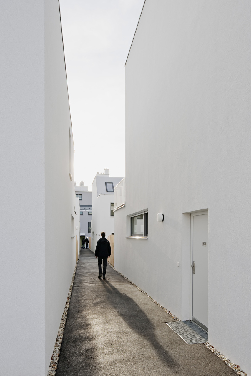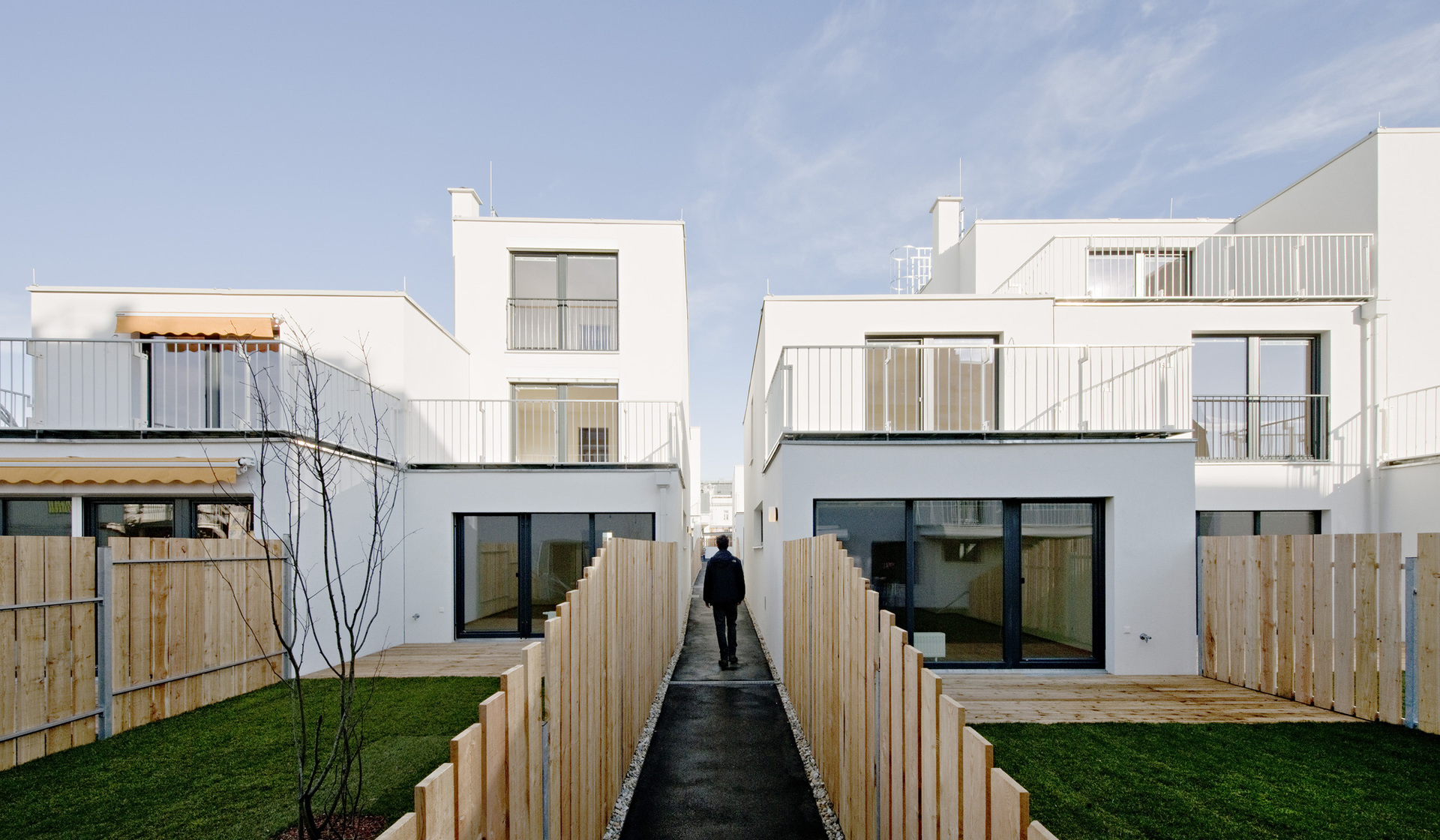 Mit der straßenseitigen Blockrandbebauung als viergeschoßiges Bollwerk bleibt die dahinterliegende kleinteilige Struktur uneinsichtig. Versetzt angeordnete länglich-schmale Reihenhäuser sind in Kuben aufgelöst, die sich nach Süden öffnen und Terrassen freigeben. Die „poetische“ Interpretation der Bauordnung lässt diese Volumen teilweise durch Rücksprünge und Abschrägungen sich bis ins zweite Stockwerk entwickeln. Hohe Wohn- und Freiraumqualität entsteht auch durch die eingezäunten Gartenflecken und die Gassen, die das private Quartier über die Längsseite erschließen.